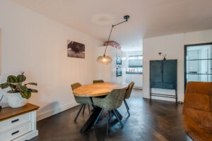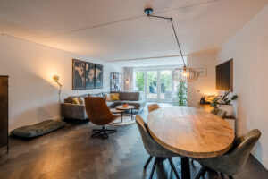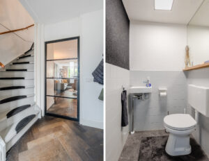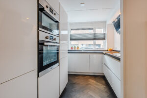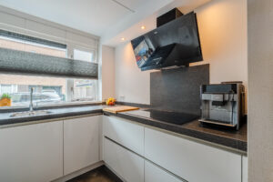 Entree/hal met trapopgang naar de eerste verdieping en toegang tot de vernieuwde meterkast en de half betegelde toiletruimte met toilet en fonteintje. Vanuit de hal heeft u toegang tot de ruime living welke aan de achterzijde is uitgebouwd en voorzien is van een fraaie houten vloer in visgraatmotief, praktische trapkast, dubbele openslaande deuren naar de achtertuin en een open keuken. De keuken is gelegen aan de voorzijde en voorzien van een nette keukeninrichting (uit 2019) met diverse kastjes, lades en inbouwapparatuur, te weten: een inductiekookplaat, afzuigkap, combi-oven/magnetron, oven, koelkast, vriezer en vaatwasmachine.