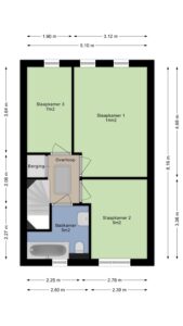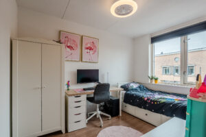 Overloop met toegang tot een wasruimte met de aansluitingen voor de wasapparatuur, 3 ruime slaapkamers van ca. 14m², 9m² en 7m² en een deels betegelde badkamer met een ligbad, wastafelmeubel, designradiator en een tweede toilet.