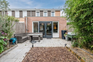 De woning beschikt over een nette voortuin en een fraai aangelegde achtertuin op het zonnige westen met achterom. Tevens is er een houten berging aanwezig met elektra.