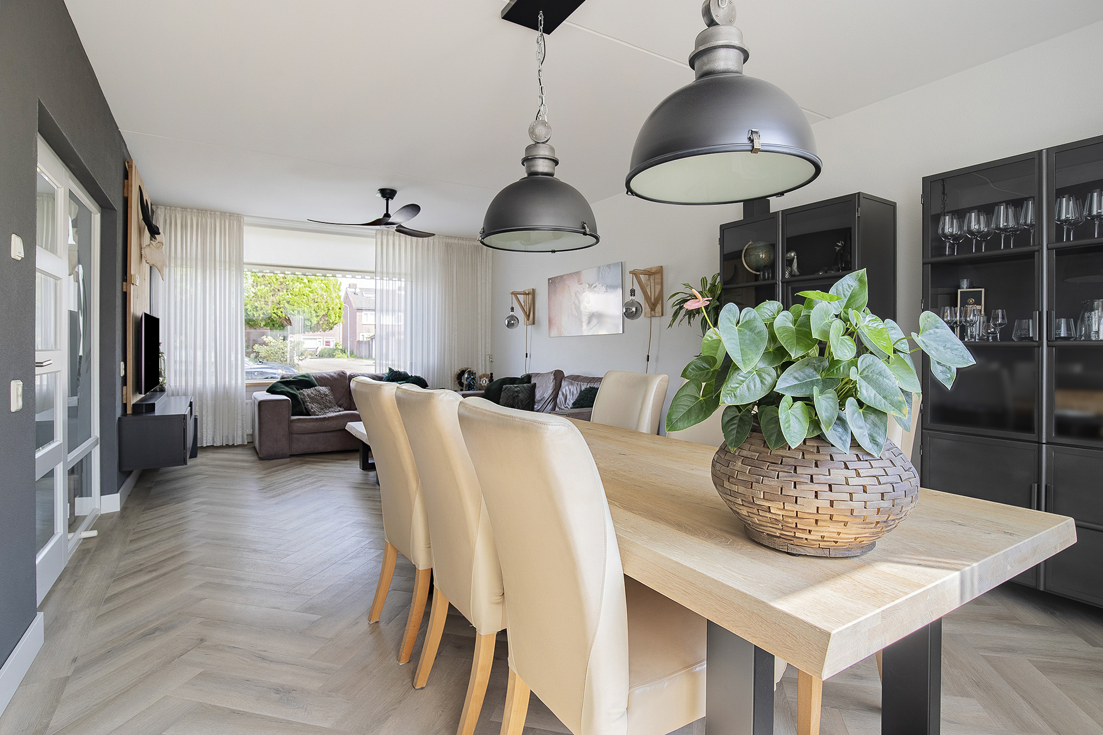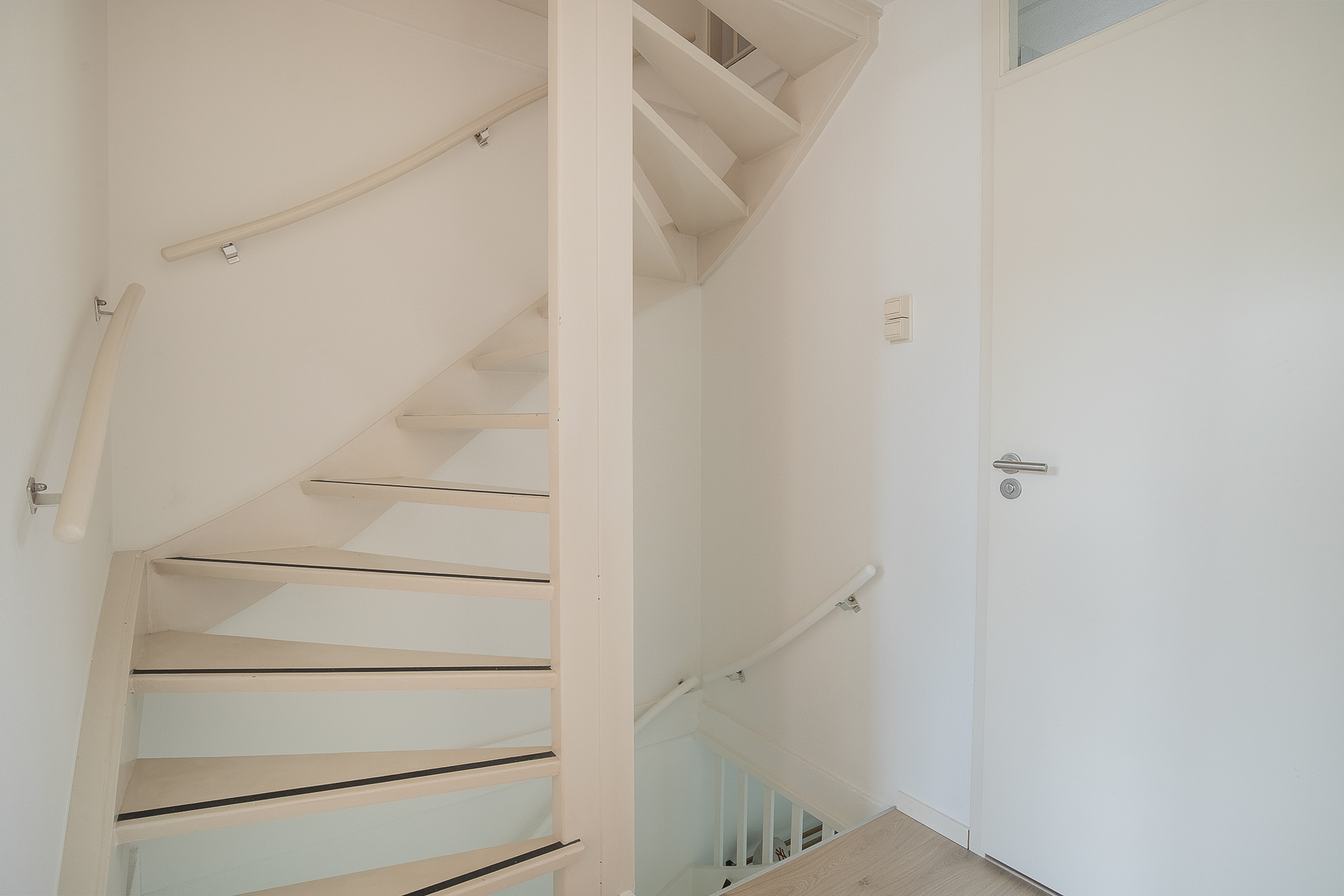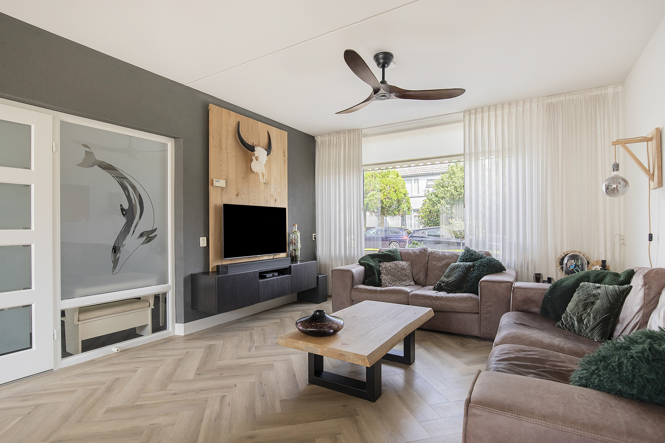 Entree/hal met meterkast, tegelvloer, deels betegelde toiletruimte en de trapopgang naar de eerste verdieping. Ruime en lichte woonkamer met een hoogwaardige visgraat pvc vloer.
