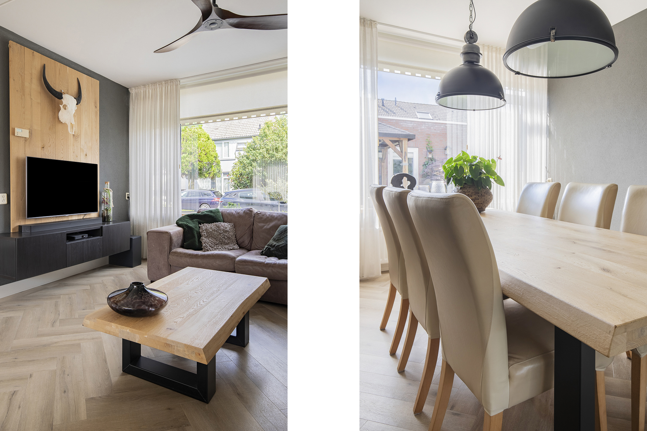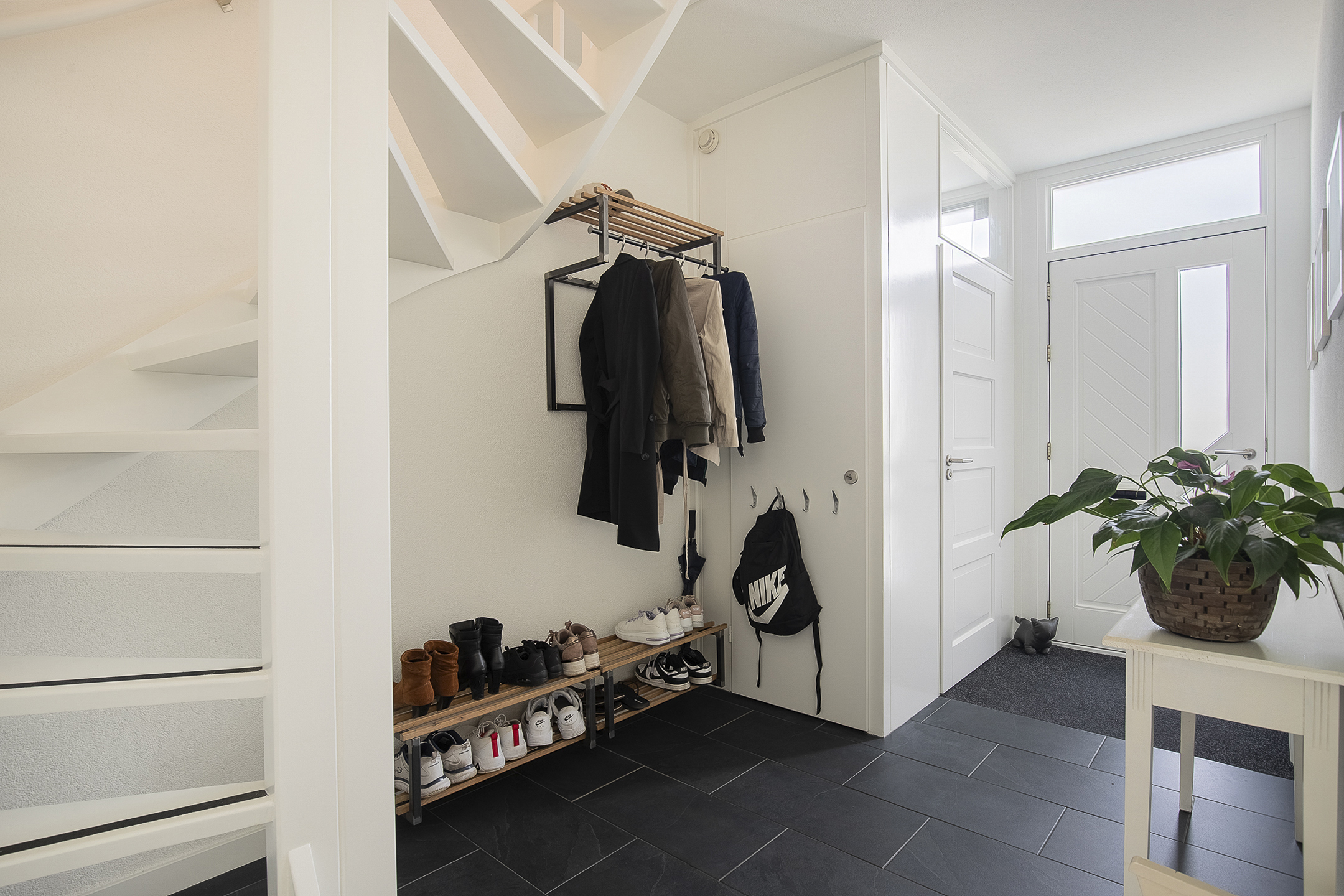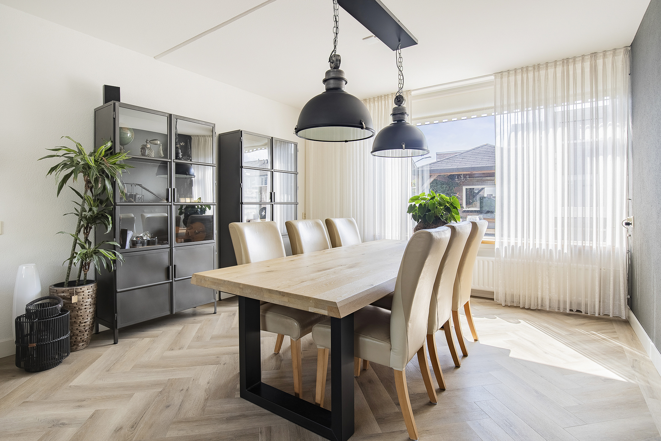 Entree/hal met meterkast, tegelvloer, deels betegelde toiletruimte en de trapopgang naar de eerste verdieping. Ruime en lichte woonkamer met een hoogwaardige visgraat pvc vloer.