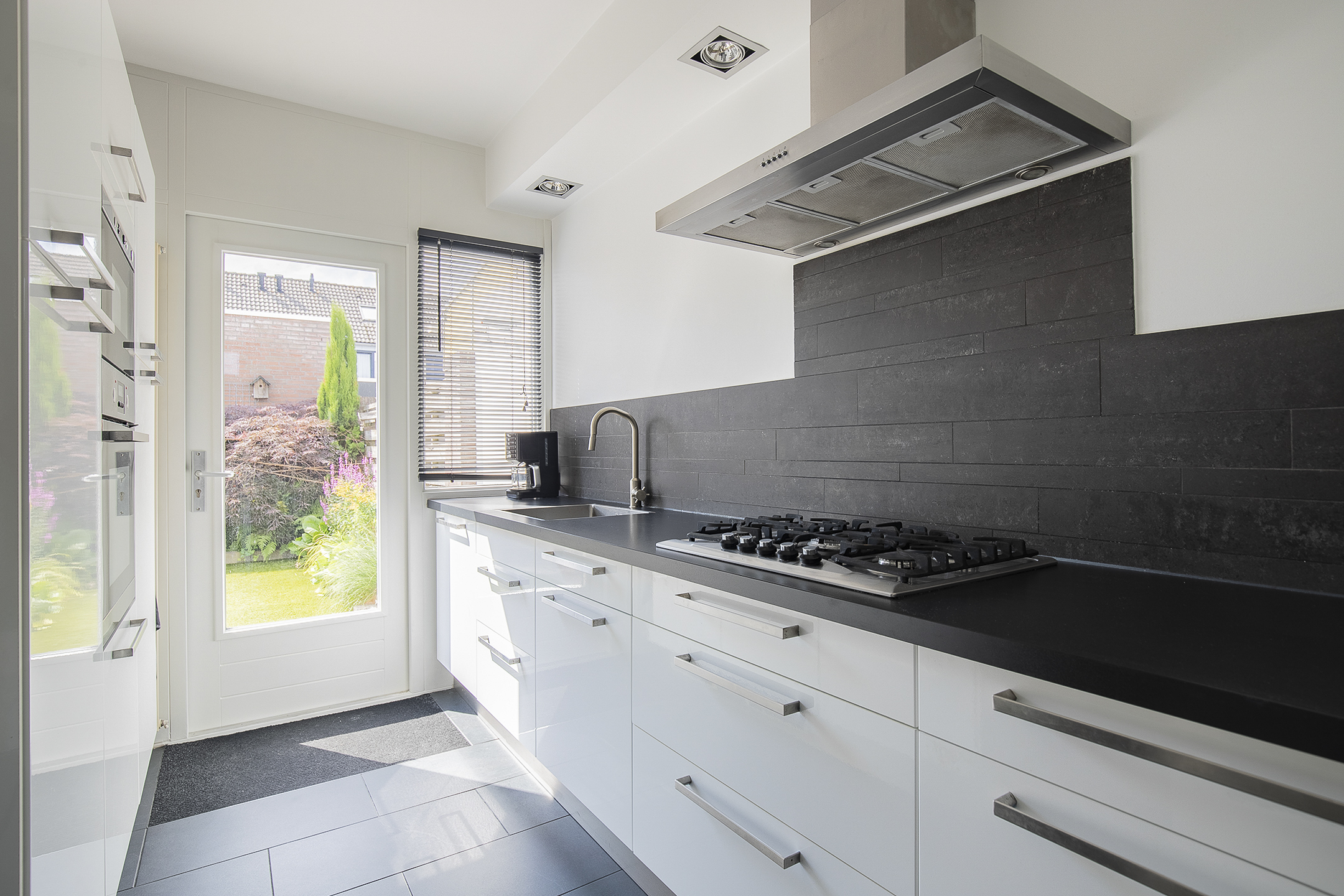 De 'dichte' keuken bevindt zich aan de achterzijde van de woning en is voorzien van een loopdeur naar de achtertuin en een zeer nette lichte hoogglans keukeninrichting met diverse inbouwapparatuur, te weten: een gaskookplaat, rvs-afzuigschouw, oven, magnetron, koelkast en een vaatwasmachine. De keuken is verder voorzien van diverse kastruimte/laden en inbouwspots.