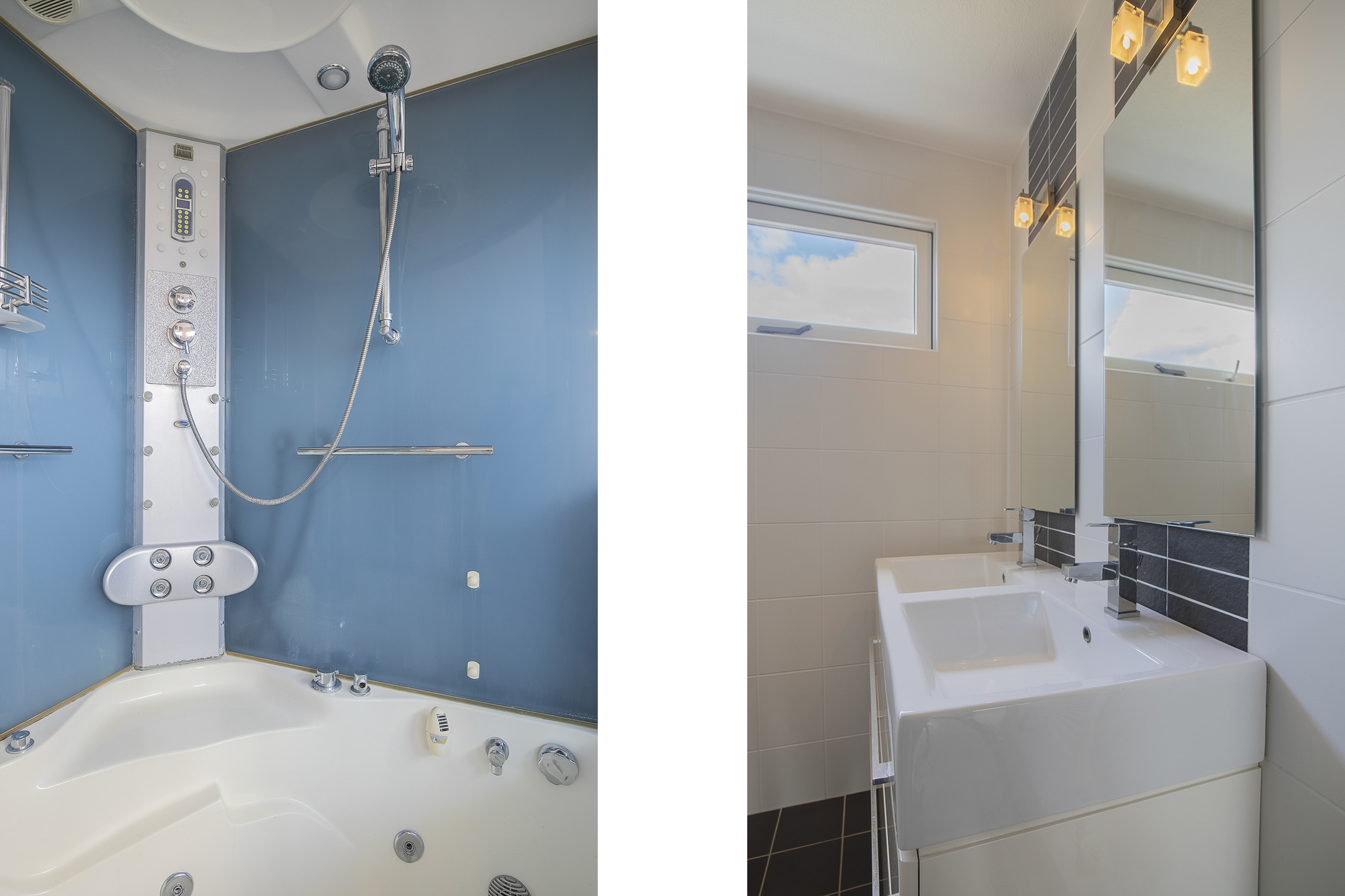 Overloop met vaste trapopgang naar de tweede verdieping en toegang tot 3 ruime slaapkamers van resp. 18m², 15m² en 7m² en de compleet licht betegelde badkamer met een multifunctionele 'wellness' (ligbad/whirlpool, stoom-douche cabine), een dubbele wastafel in een wastafelmeubel en een tweede vrijhangend closet. De overloop en de drie slaapkamers zijn allen voorzien van een fraaie laminaatvloer.
