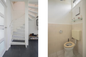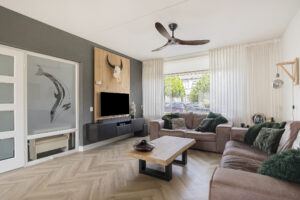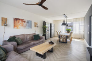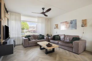 Entree/hal met meterkast, tegelvloer, deels betegelde toiletruimte en de trapopgang naar de eerste verdieping. Ruime en lichte woonkamer met een hoogwaardige visgraat pvc vloer.