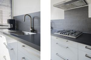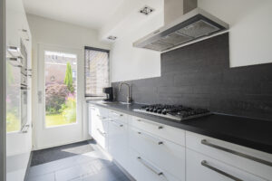 De 'dichte' keuken bevindt zich aan de achterzijde van de woning en is voorzien van een loopdeur naar de achtertuin en een zeer nette lichte hoogglans keukeninrichting met diverse inbouwapparatuur, te weten: een gaskookplaat, rvs-afzuigschouw, oven, magnetron, koelkast en een vaatwasmachine. De keuken is verder voorzien van diverse kastruimte/laden en inbouwspots.