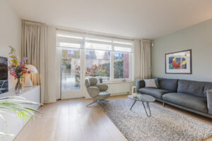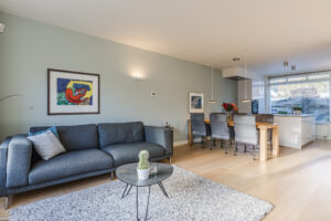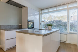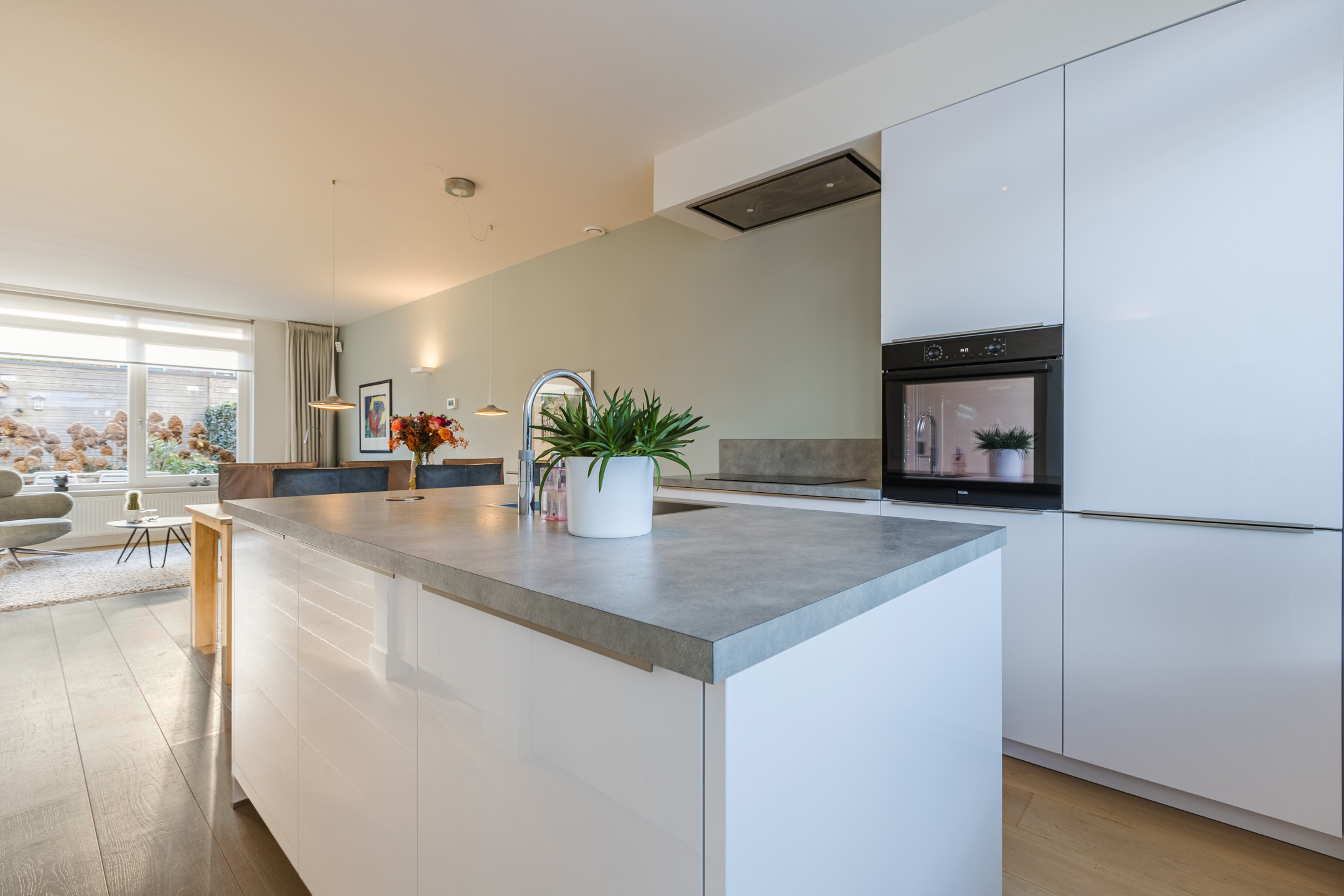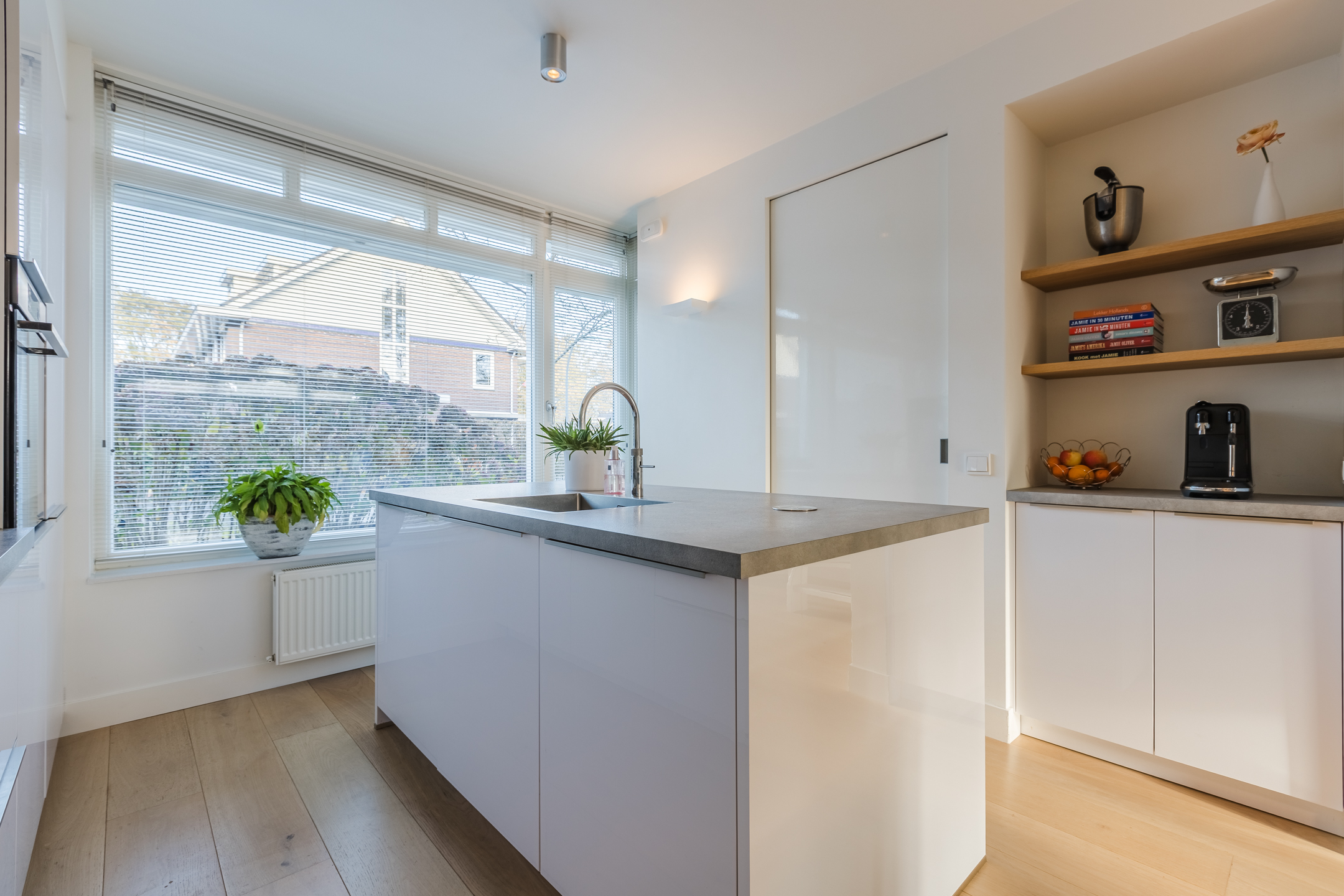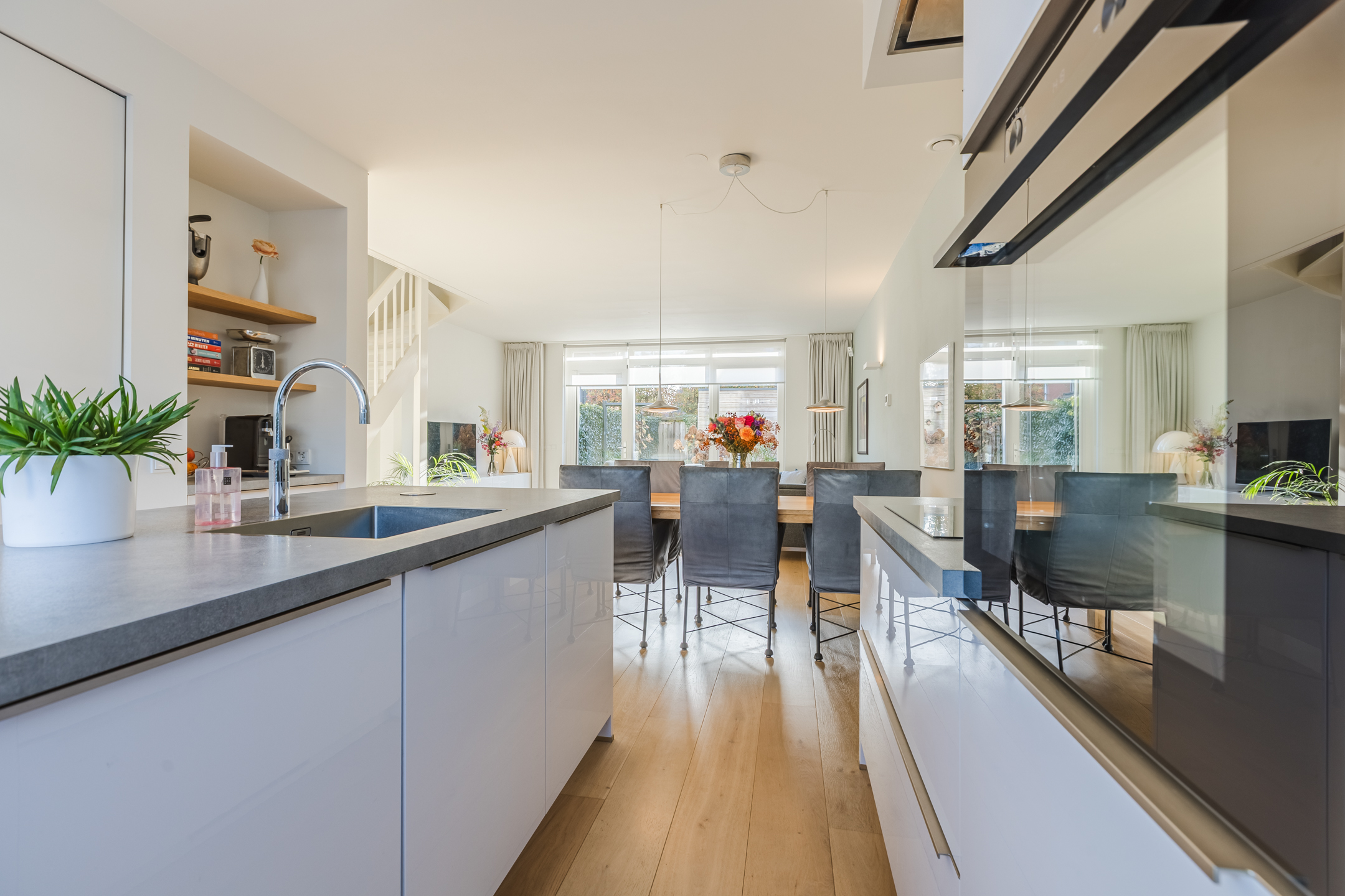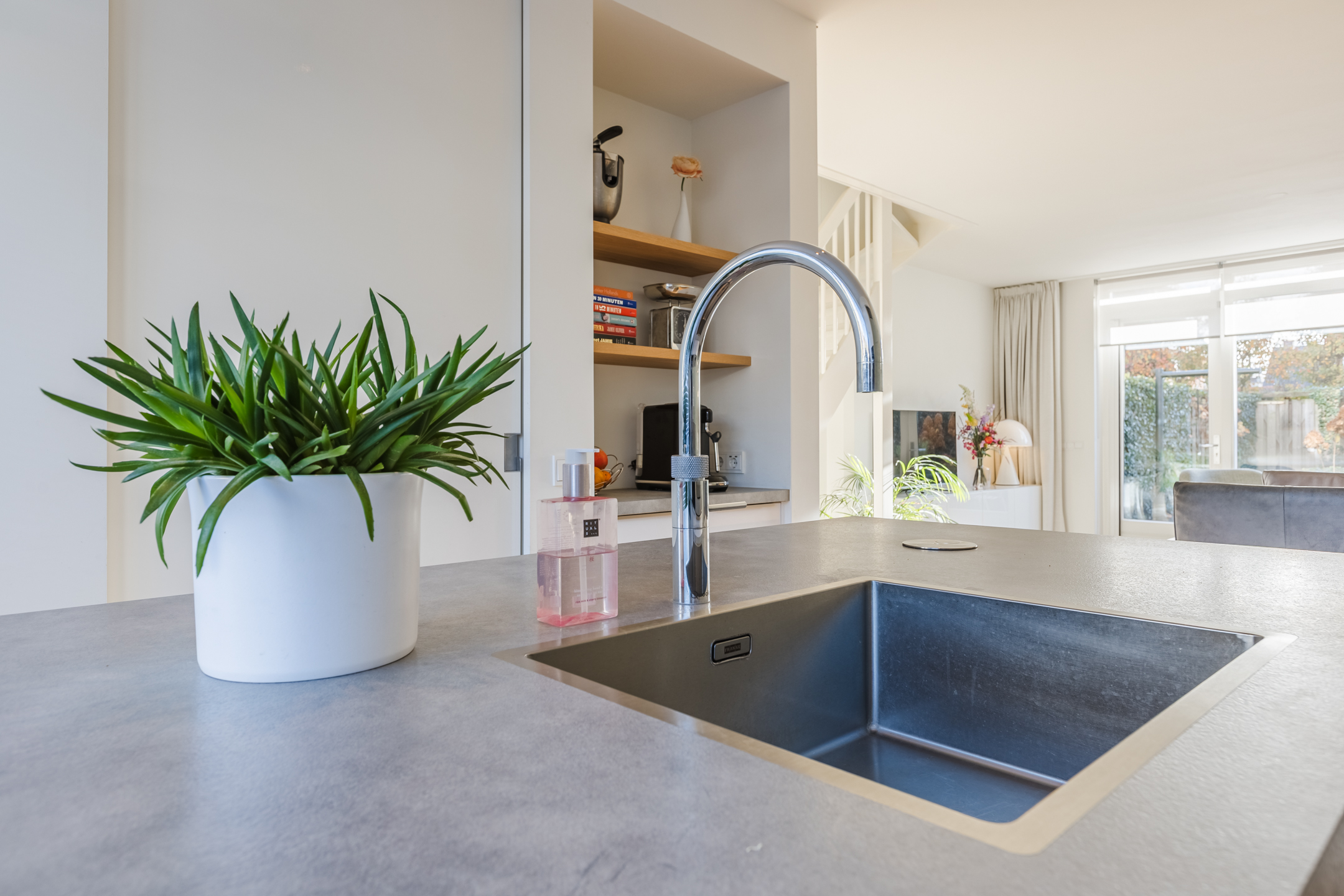 Entree/hal met uitgebreide meterkast en licht betegelde toiletruimte met vrijhangend closet en fontein. Praktische ruimtebesparende schuifdeur naar de living. Tuingerichte living (ca. 40m²) voorzien van een fraaie houten vloer en een aan de voorzijde van de woning gelegen open keuken met een luxe keukeninrichting met spoel/werkeiland voorzien van diverse inbouwapparatuur te weten: Quooker (kokend water kraan), een inductie-kookplaat, oven, vlakscherm afzuigkap, vaatwasmachine en een koel-/vriescombinatie. Vanuit de living is er middels een loopdeur toegang tot de zonnige op het zuiden gelegen achtertuin met houten berging en achterom.
