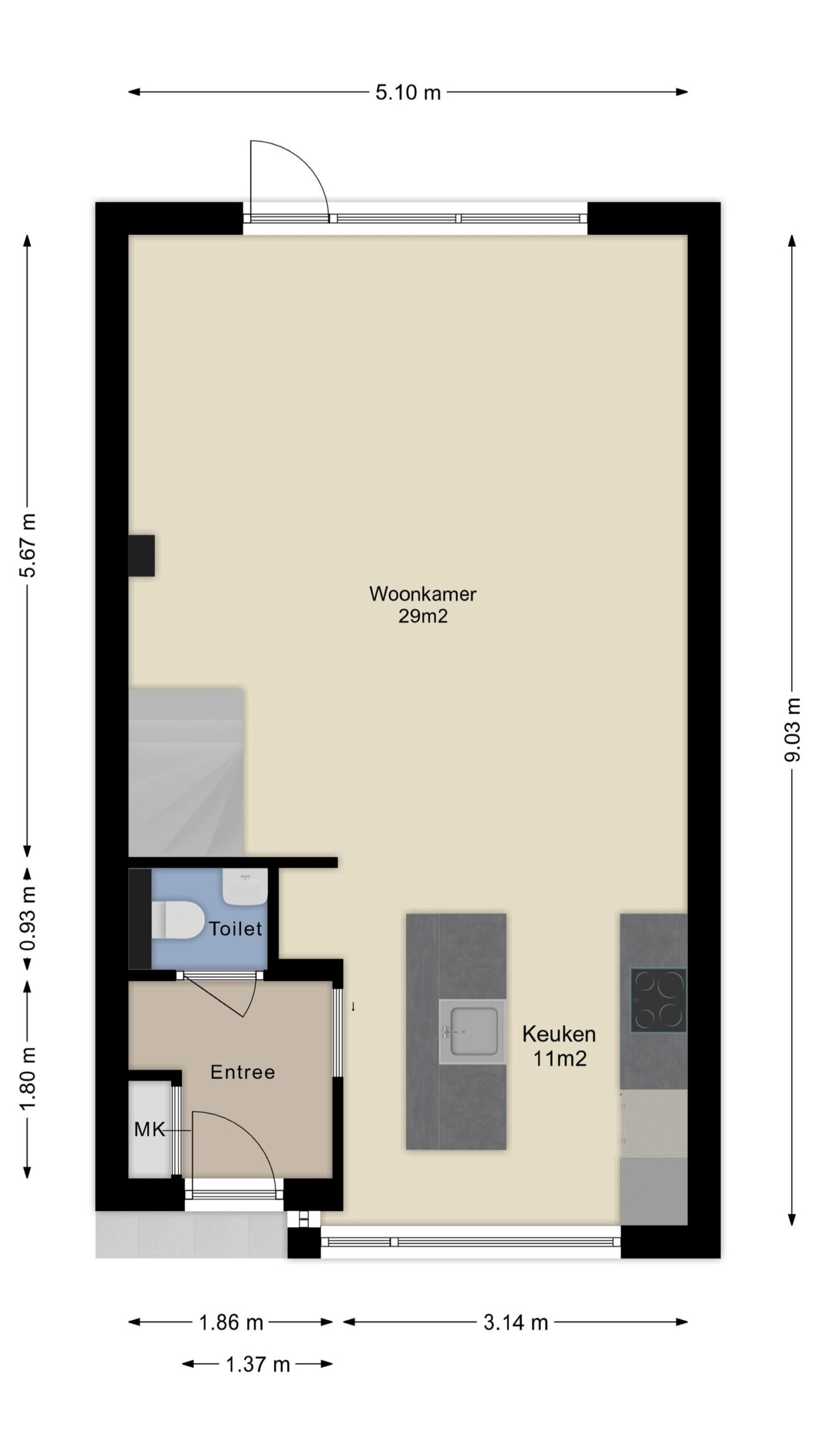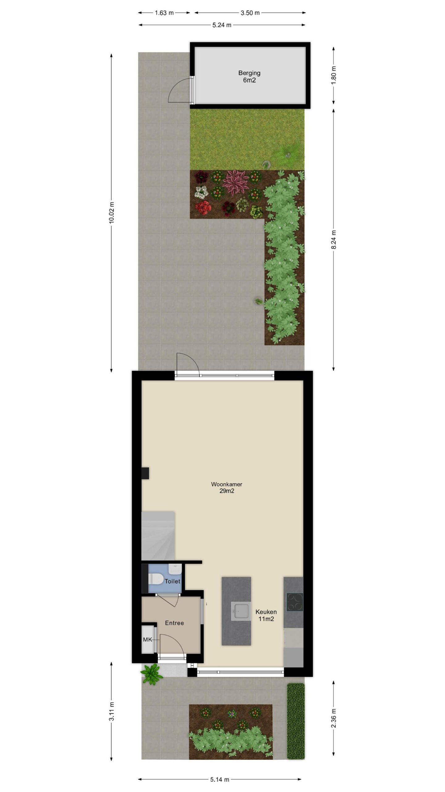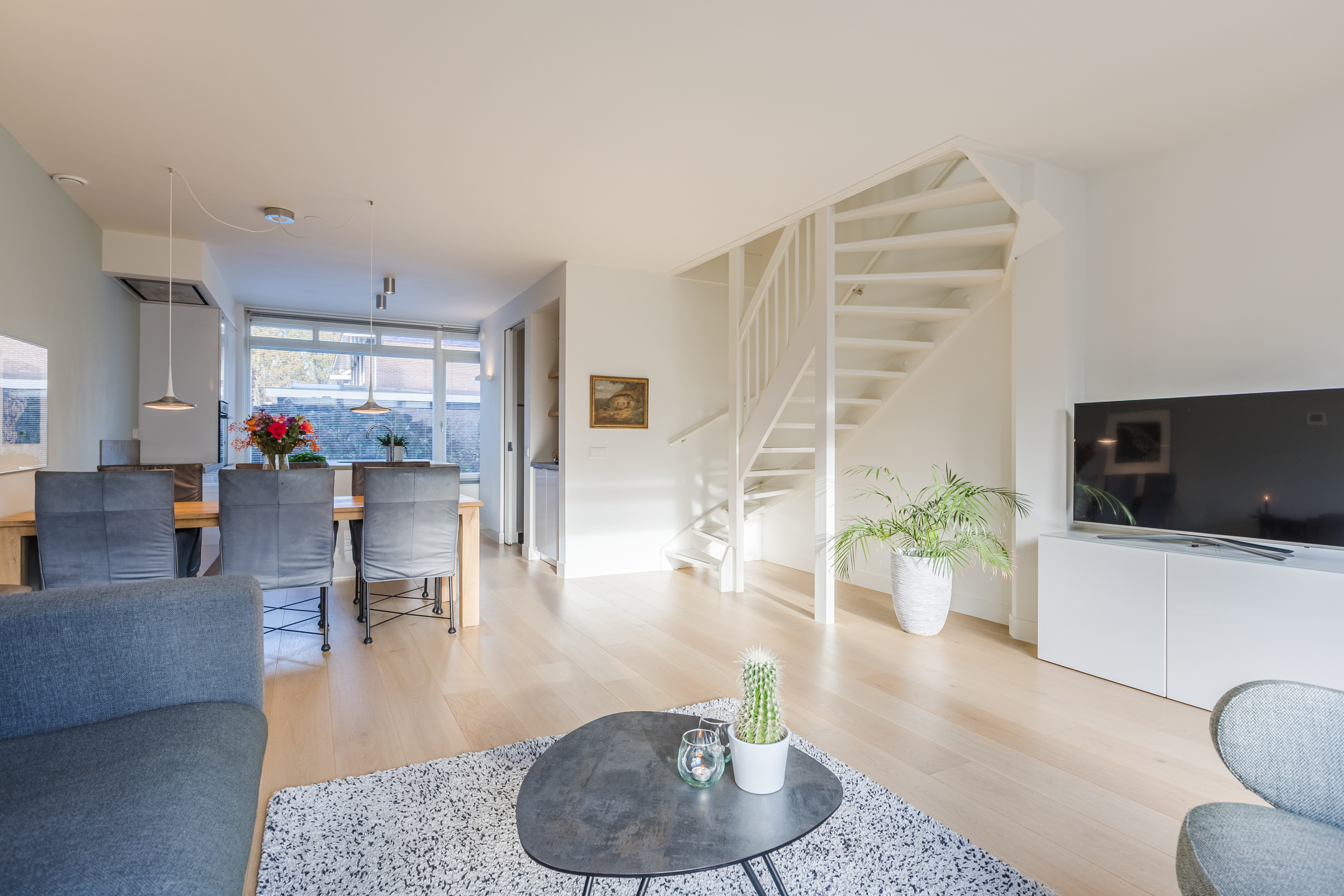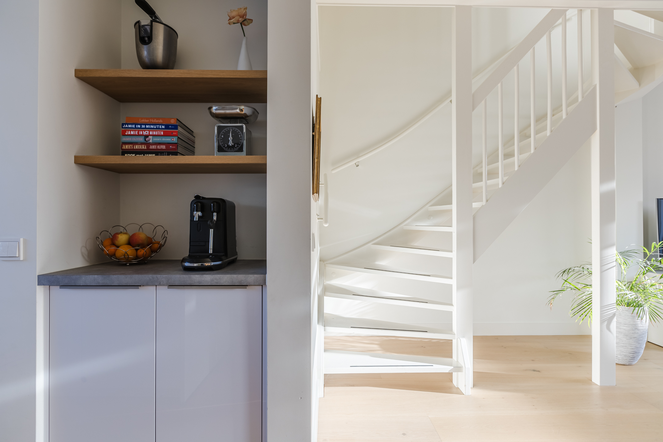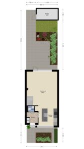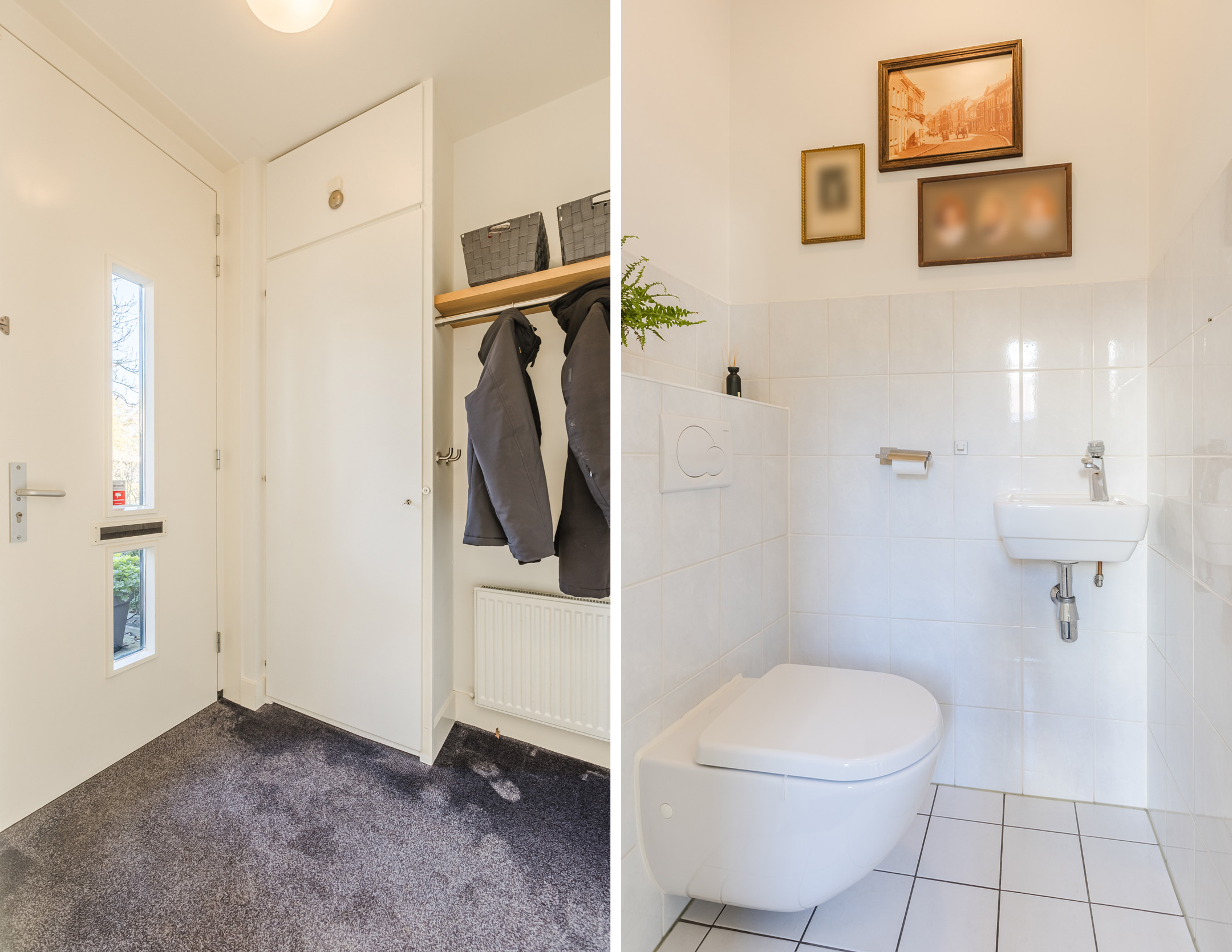 Entree/hal met uitgebreide meterkast en licht betegelde toiletruimte met vrijhangend closet en fontein. Praktische ruimtebesparende schuifdeur naar de living. Tuingerichte living (ca. 40m²) voorzien van een fraaie houten vloer en een aan de voorzijde van de woning gelegen open keuken met een luxe keukeninrichting met spoel/werkeiland voorzien van diverse inbouwapparatuur te weten: Quooker (kokend water kraan), een inductie-kookplaat, oven, vlakscherm afzuigkap, vaatwasmachine en een koel-/vriescombinatie. Vanuit de living is er middels een loopdeur toegang tot de zonnige op het zuiden gelegen achtertuin met houten berging en achterom.