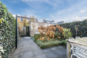Op het zuiden gesitueerde compleet fraai aangelegde tuin met sierbestraat terras, plantenborders, kunstgras-gazon, vaste schommel en een houten tuinberging. De tuin is ook middels een achterom bereikbaar. De woning is aan de achtertuin-zijde voorzien van een fraai zonnescherm. Ook is er een voortuin met beplanting.