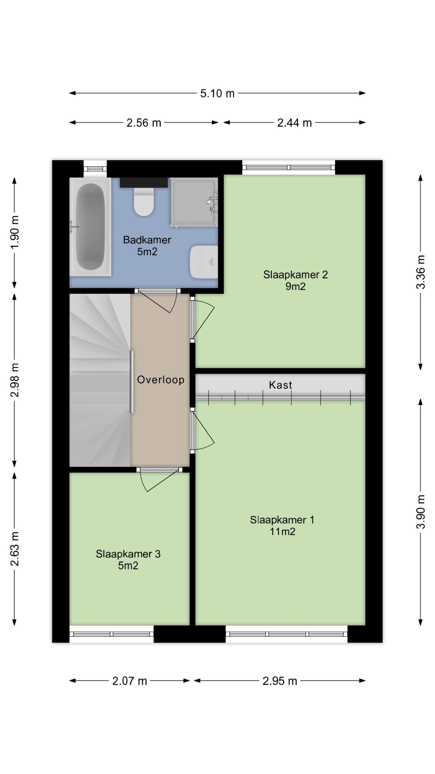 Overloop met vaste trapopgang naar de tweede verdieping, voorslaapkamer (ca. 2.63x2.07m), hoofd/voorslaapkamer (ca. 3.90x2.95m) met een grote vaste kastenwand, achterslaapkamer (ca. 3.36x2.95/2.44m). Compleet en geheel licht betegelde badkamer welke is ingericht met een ligbad, aparte douche, vaste wastafel en een tweede vrijhangend closet. De badkamer is voorzien van een raam voor een prettige daglichtinval en beluchting.