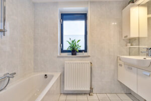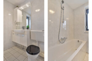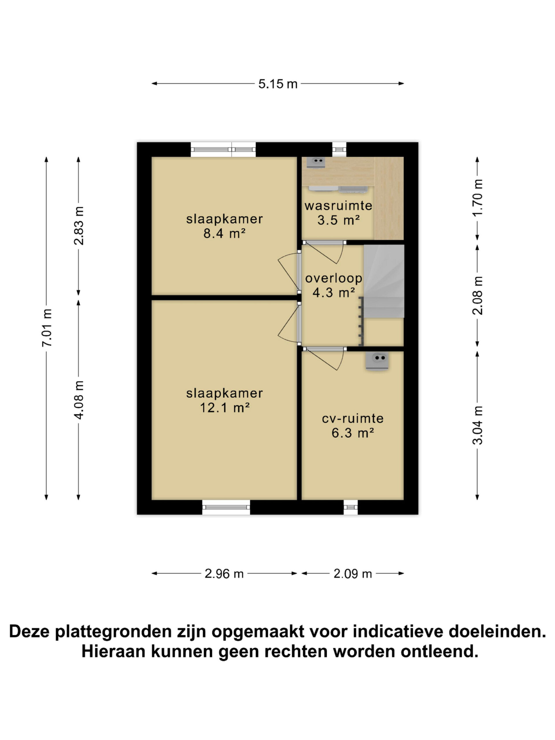Overloop met laminaatvloer, voorslaapkamer (ca. 4.08x2.96m) voorzien van laminaatvloer, achterslaapkamer (ca. 2.96x2.83m) voorzien van laminaatvloer. Praktische geheel betegelde wasruimte met aansluitingen ten behoeve van de wasapparatuur. Royale berging/cv-ruimte (ca. 3.04x2.09m) voorzien van opstelplaats van de c.v.-combiketel (Nefit) en de mechanische ventilatie-unit.
