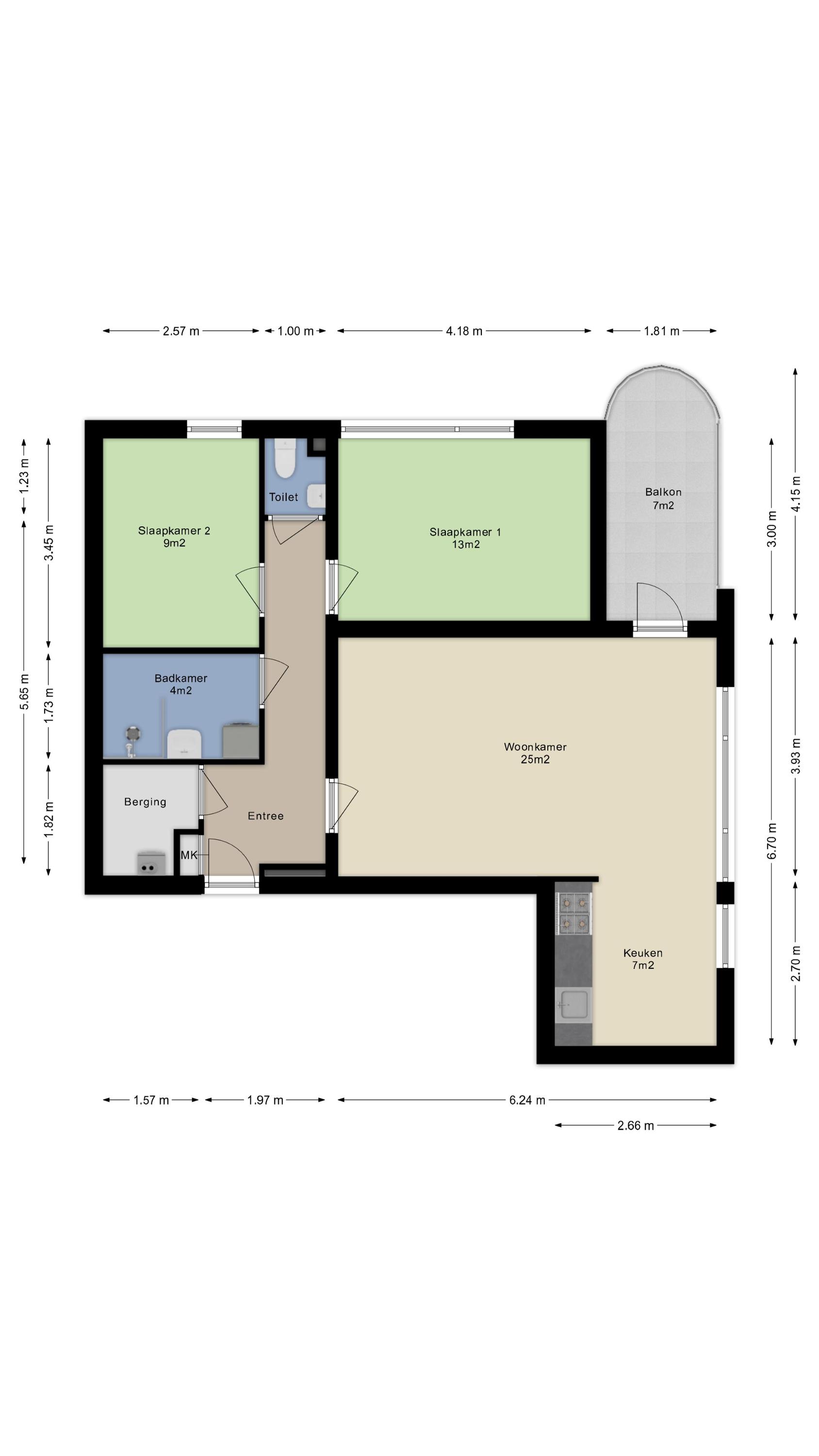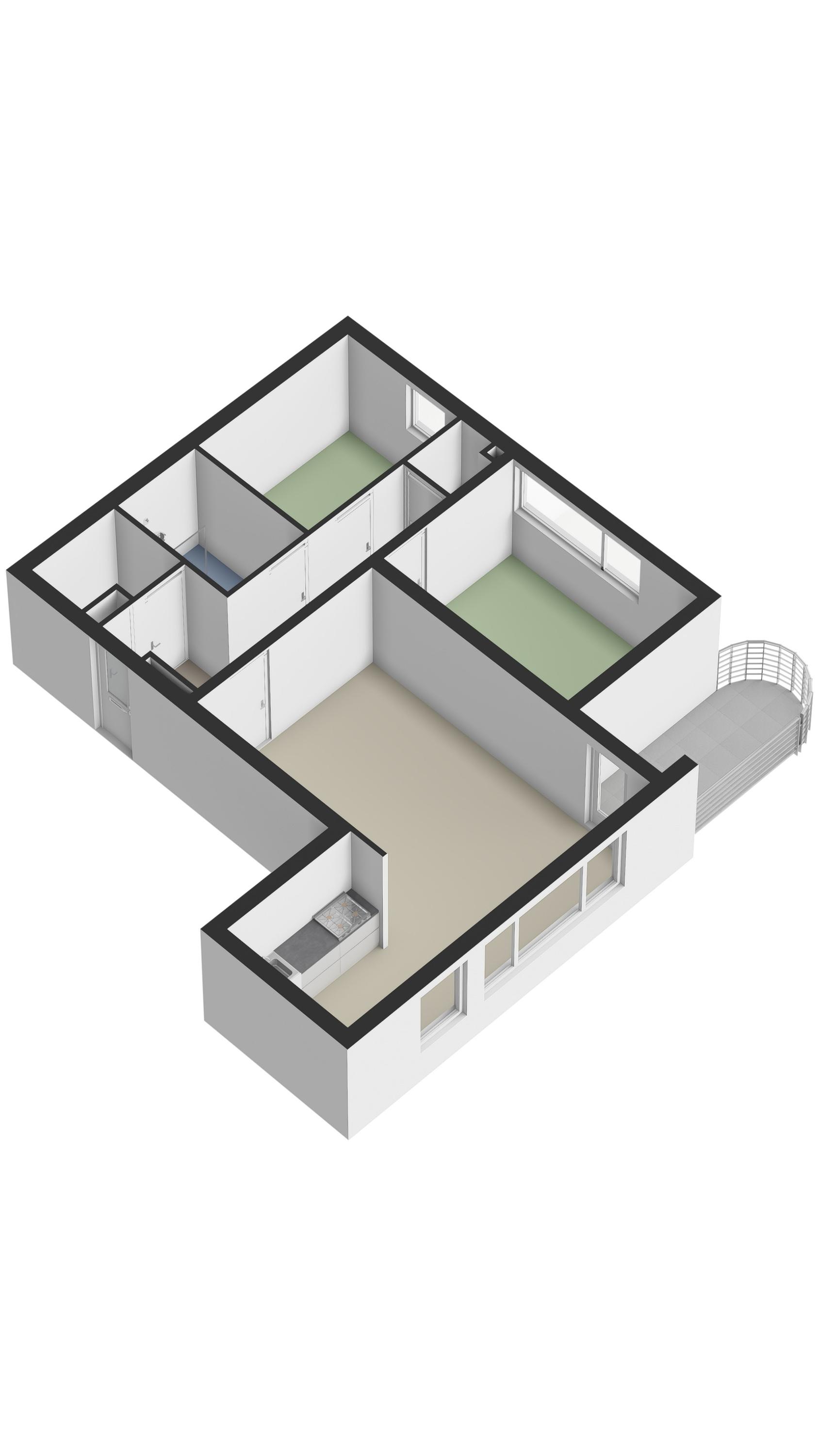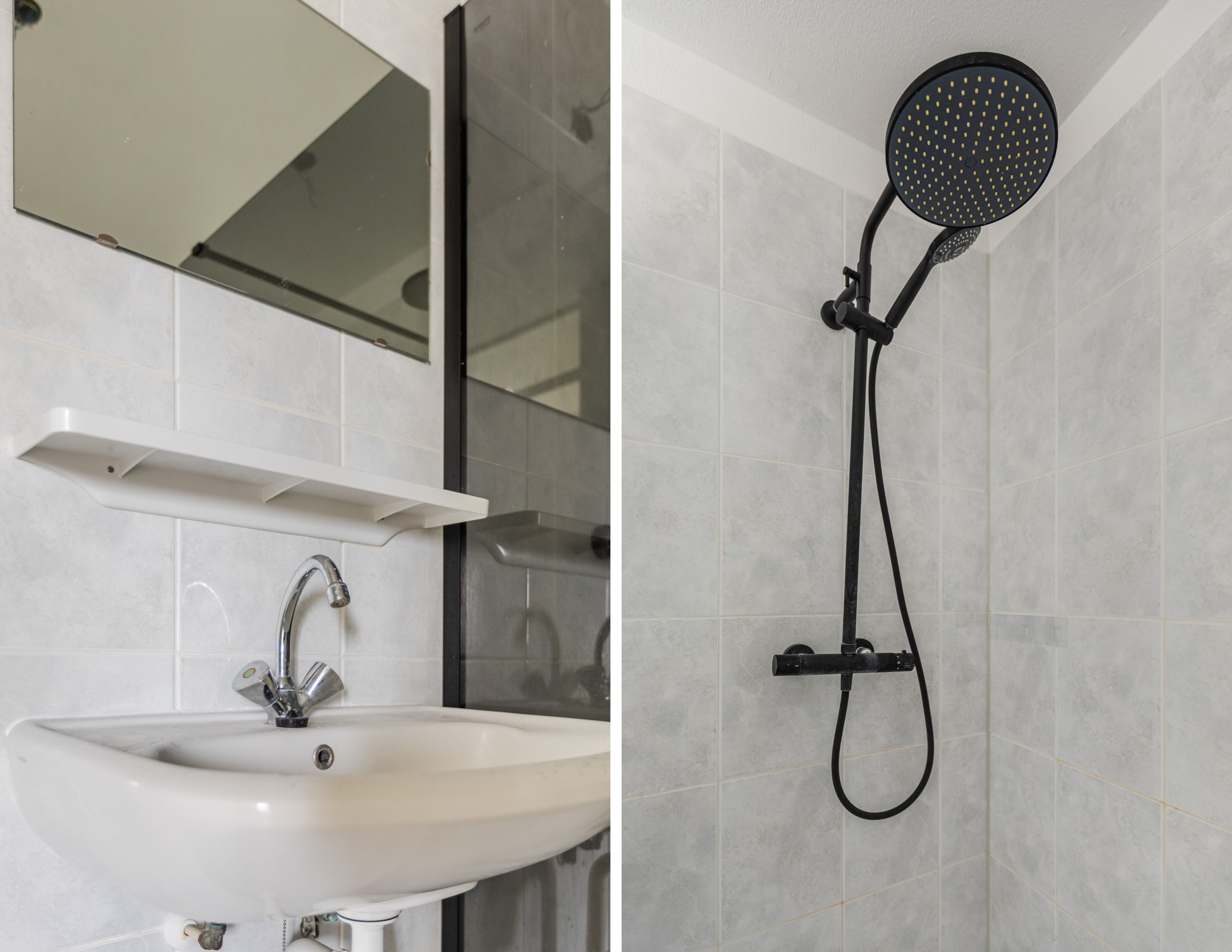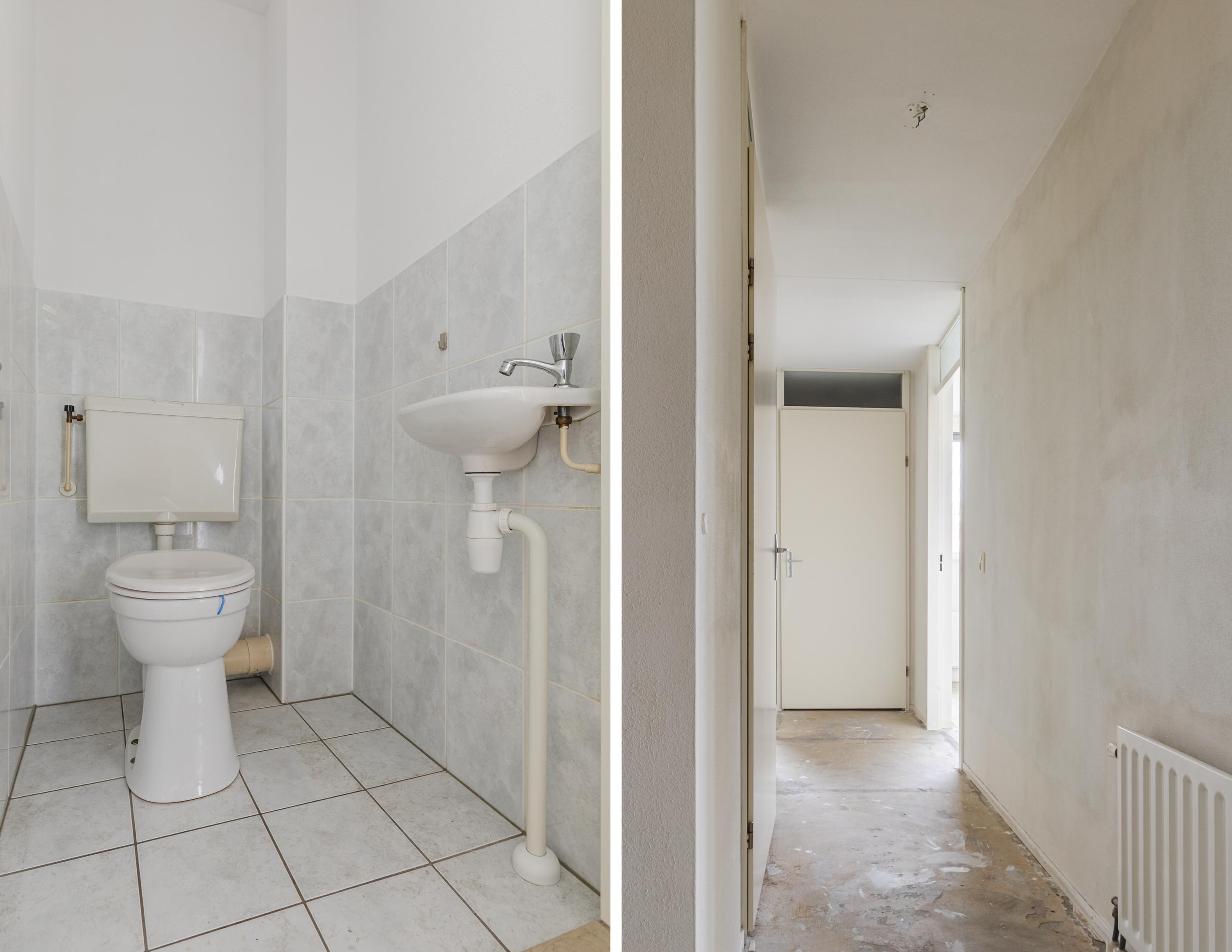Entree/hal met meterkast, vaste kast (opstelplaats cv-ketel in eigendom) en toiletruimte met fontein. Verder heeft u vanuit deze hal toegang tot de badkamer voorzien van een inloopdouche en de aansluitingen ten behoeve van de wasapparatuur, slaapkamer 1 (ca. 13m²), slaapkamer 2 (ca. 9m²) en de living.