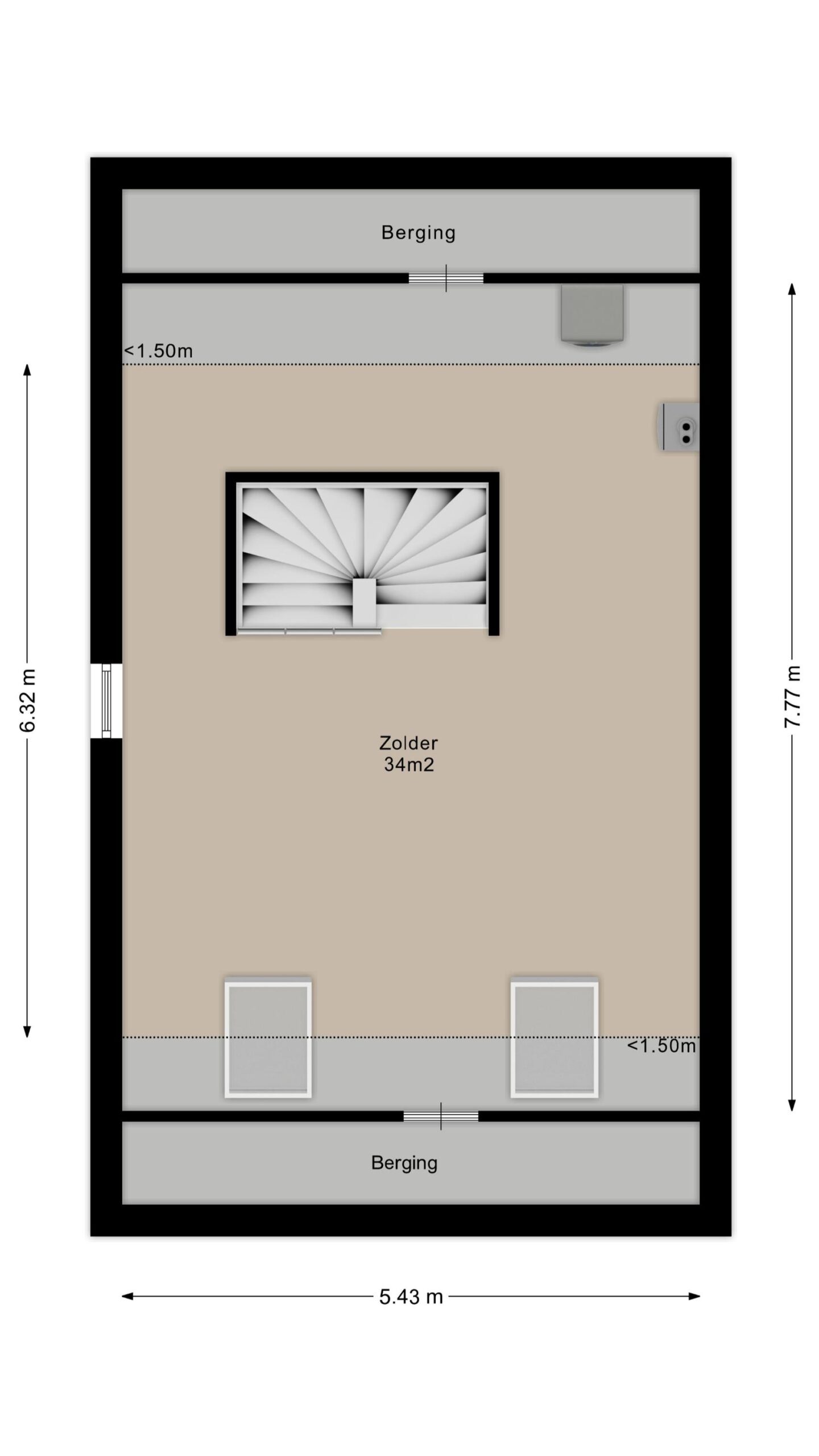 De royale zolderkamer van ca. 34m² is voorzien van twee dakramen en een zij-raam. Tevens bevinden zich hier de aansluitingen ten behoeve van de wasapparatuur, de technische installaties (incl. WTW-unit en de omvormer van de 10 zonnepanelen) en volop bergruimte achter de knieschotten. Het is gemakkelijk mogelijk om hier twee slaapkamers te creëren en/of een dakkapel te plaatsen voor nog meer leefruimte. Tevens zijn er afgedopte warm- en koudwaterleidingen en een afvoer aanwezig voor het realiseren van een wastafel. Daarnaast is in het plafond een afgemonteerde datakabel aanwezig ten behoeve van een access point, bekabeld met CAT5e en doorgelust naar de meterkast.