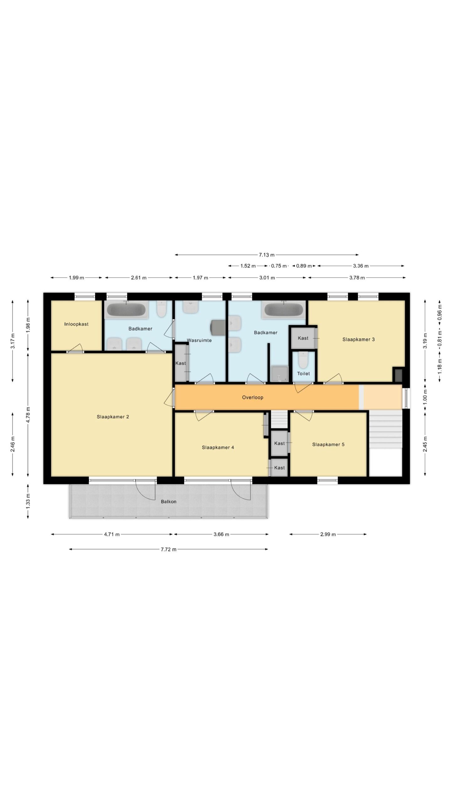 Op de eerste verdieping van het woonhuis bevinden zich de tweede, derde, vierde en vijfde slaapkamer, een toiletruimte met een staand toilet, twee badkamers en de witgoed ruimte. Alle slaapkamers beschikken over grote vaste inbouwkasten.