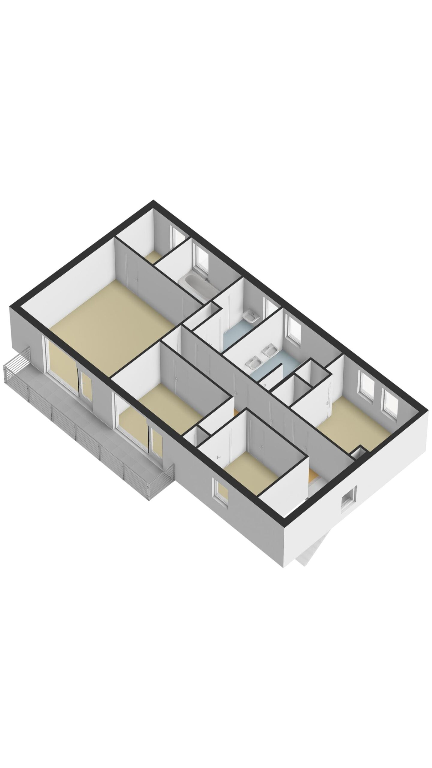 - Aan de voorzijde (zuiden) een balkon over 2 slaapkamers. Deze is ook toegankelijk via een buitentrap.