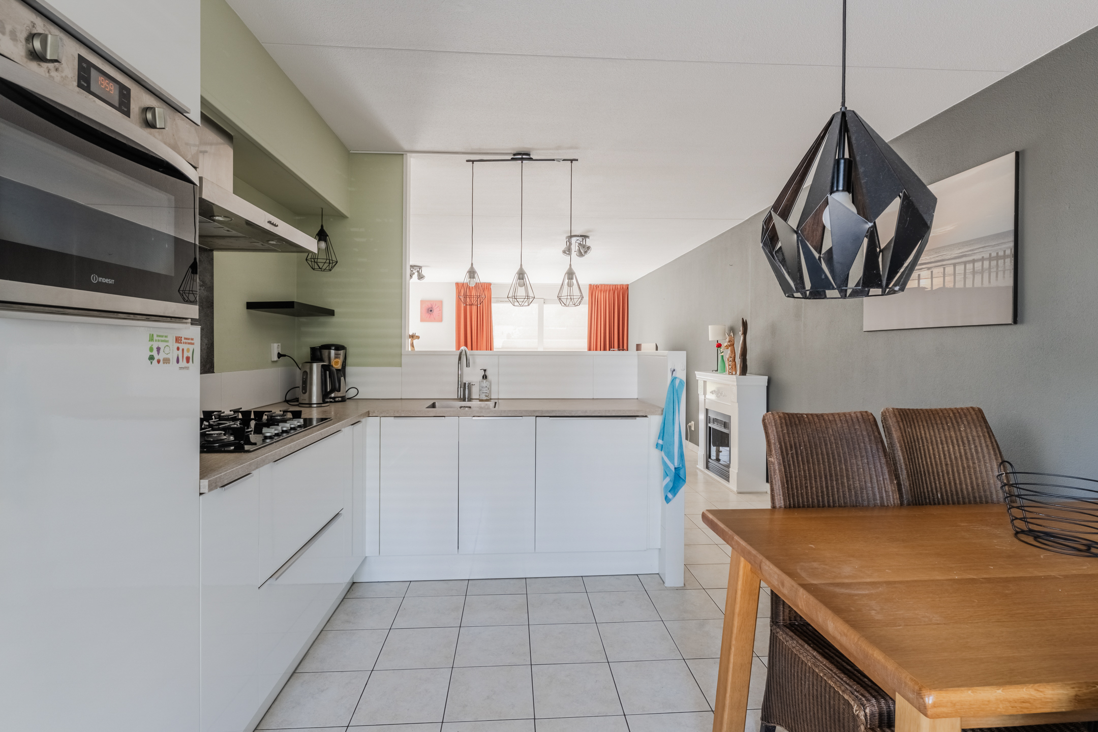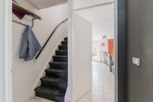 Entree/hal met toegang tot de meterkast, half betegelde toiletruimte met toilet en fonteintje en de trapopgang naar de eerste verdieping. Via de hal komt u in de ruime living welke is voorzien van een tegelvloer, praktische trapkast, schuifpui (met screen) en een loopdeur (met rolluik) naar de achtertuin. De keuken bevindt zich aan de voorzijde en is voorzien van een nette keukeninrichting met diverse lades, kastjes en inbouwapparatuur, te weten: een 5-pits gaskookplaat, afzuigkap, koelkast, oven en een vaatwasmachine (defect).