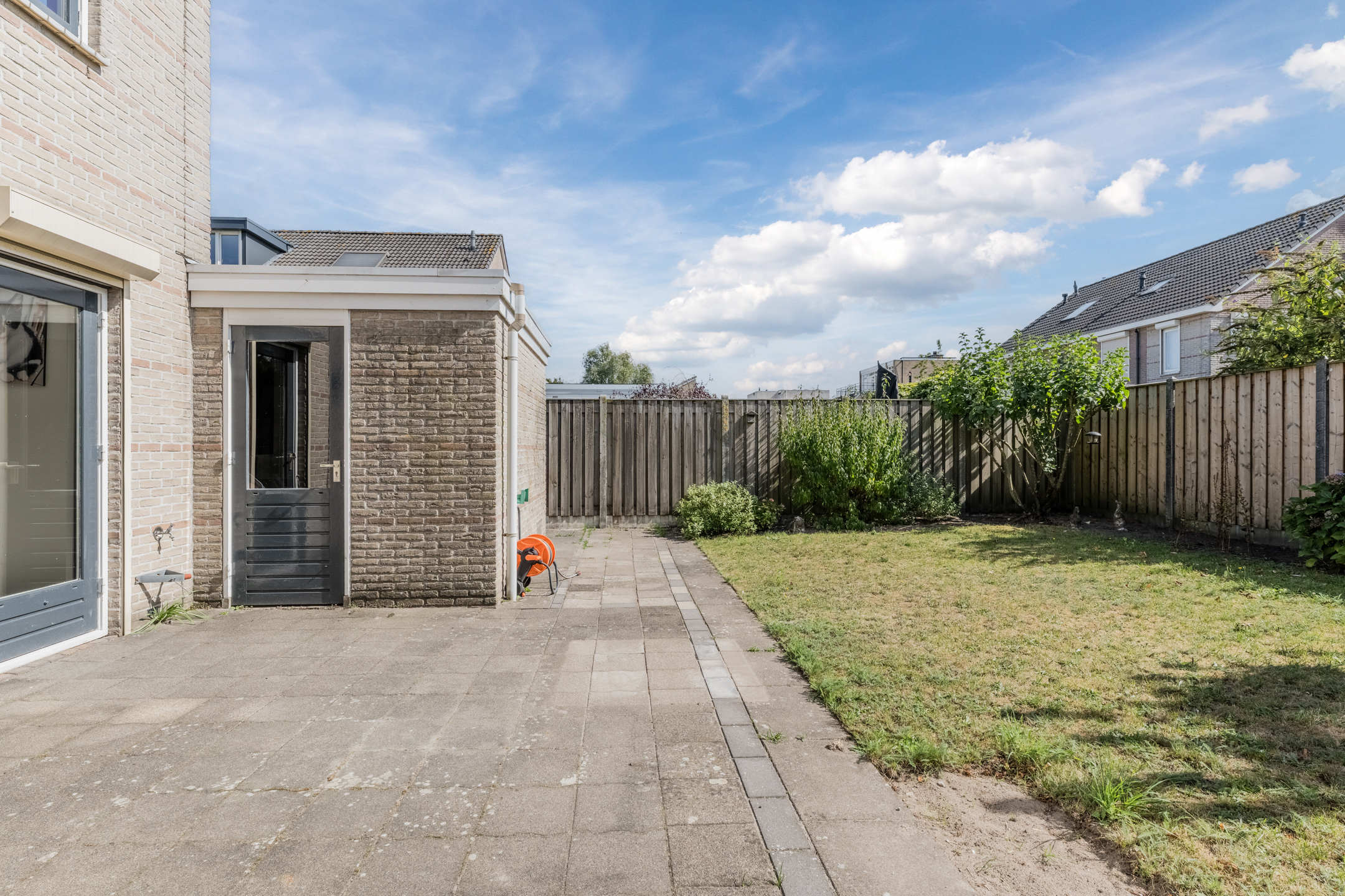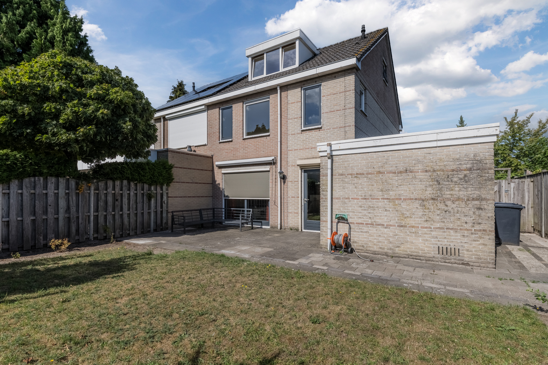 De woning is voorzien van een nette voortuin met eigen oprit en een ruime achtertuin op het zonnige zuiden met achterom. Aan de achtergevel van de woning is een zonnescherm gemonteerd. De aanpandige garage met elektra is zowel via de voorzijde (middels een stalen kanteldeur) alsook via de achterzijde (middels een loopdeur) bereikbaar.