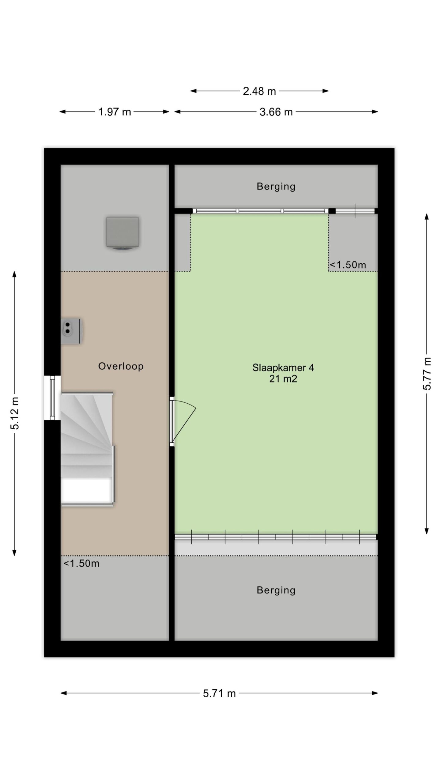 Overloop/voorzolder met de opstelplaats van de c.v.-ketel (Nefit Topline, bwj. 2010) en de aansluiting voor de wasapparatuur. Via de overloop komt u in de vierde ruime slaapkamer van ca. 21m² met volop bergruimte achter de knieschotten, vinyl vloer en een dakkapel aan de achterzijde met elektrische rolluiken. Het is mogelijk om hier 2 kamers te creëren.
