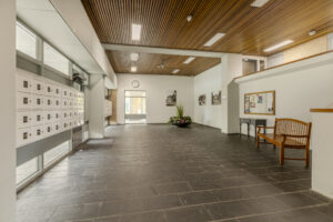 Centrale entree met bellentableau, video intercom-installatie en brievenbussen. Vanuit de entree heeft u toegang tot het trappenhuis en de lift. Er is tevens nog een andere ingang aan de zijkant van het gebouw met eveneens een liftinstallatie. Deze ingang ligt dichtbij het betreffende appartement en bevat geen trappen ten opzichte van de centrale entree en is derhalve ook geschikt voor mensen met een rolstoel.