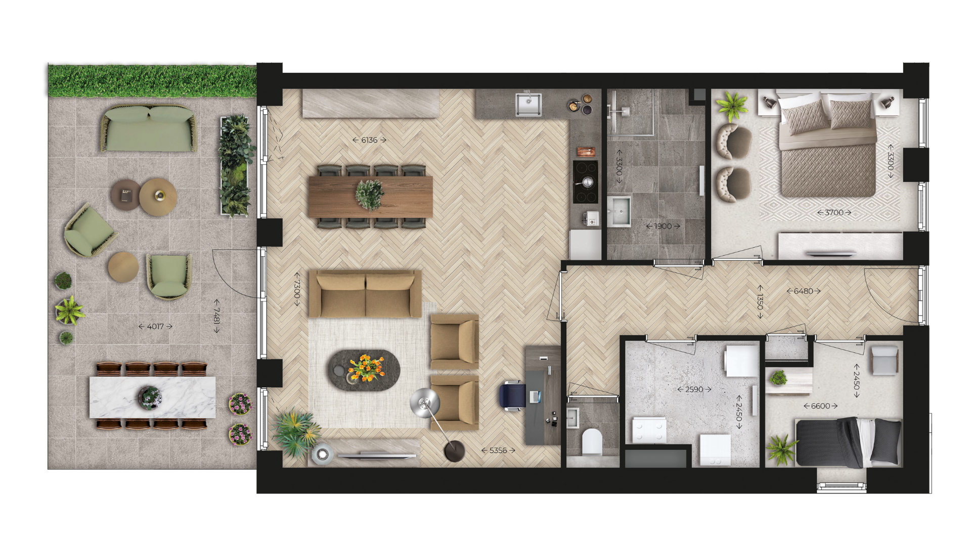 Tien grotere appartementen komen vooral op de begane grond en eerste verdieping aan de Bizetlaan. Twee van de grotere appartementen vormen hierop een uitzondering. Die komen op de begane grond en tweede verdieping aan de zijde van de Bachstraat en het binnenterrein. Deze grotere appartementen krijgen twee (slaap)kamers en variëren in oppervlak van 63 tot 100 m2. Ze beschikken bovendien ieder over een eigen berging op de begane grond.