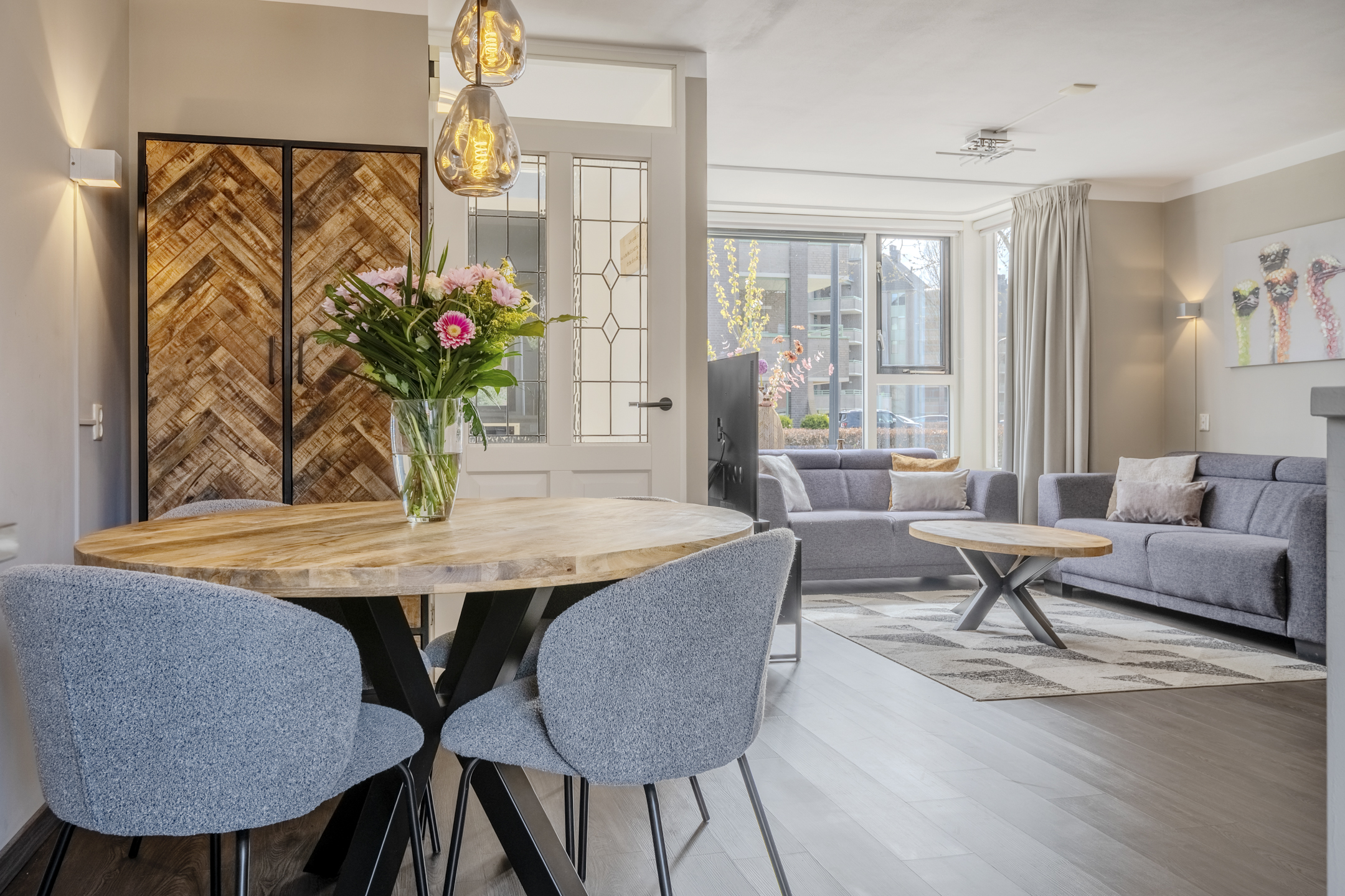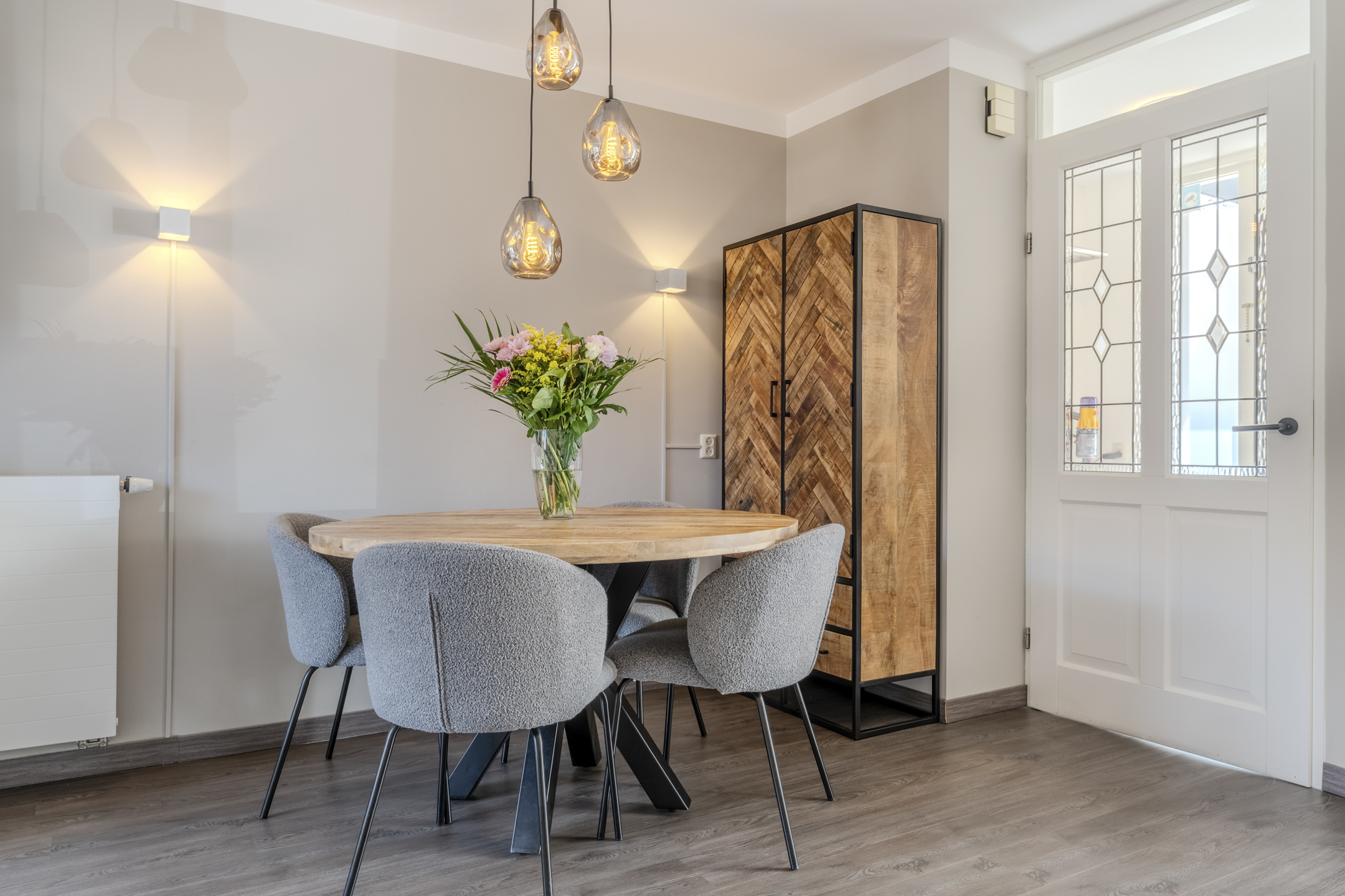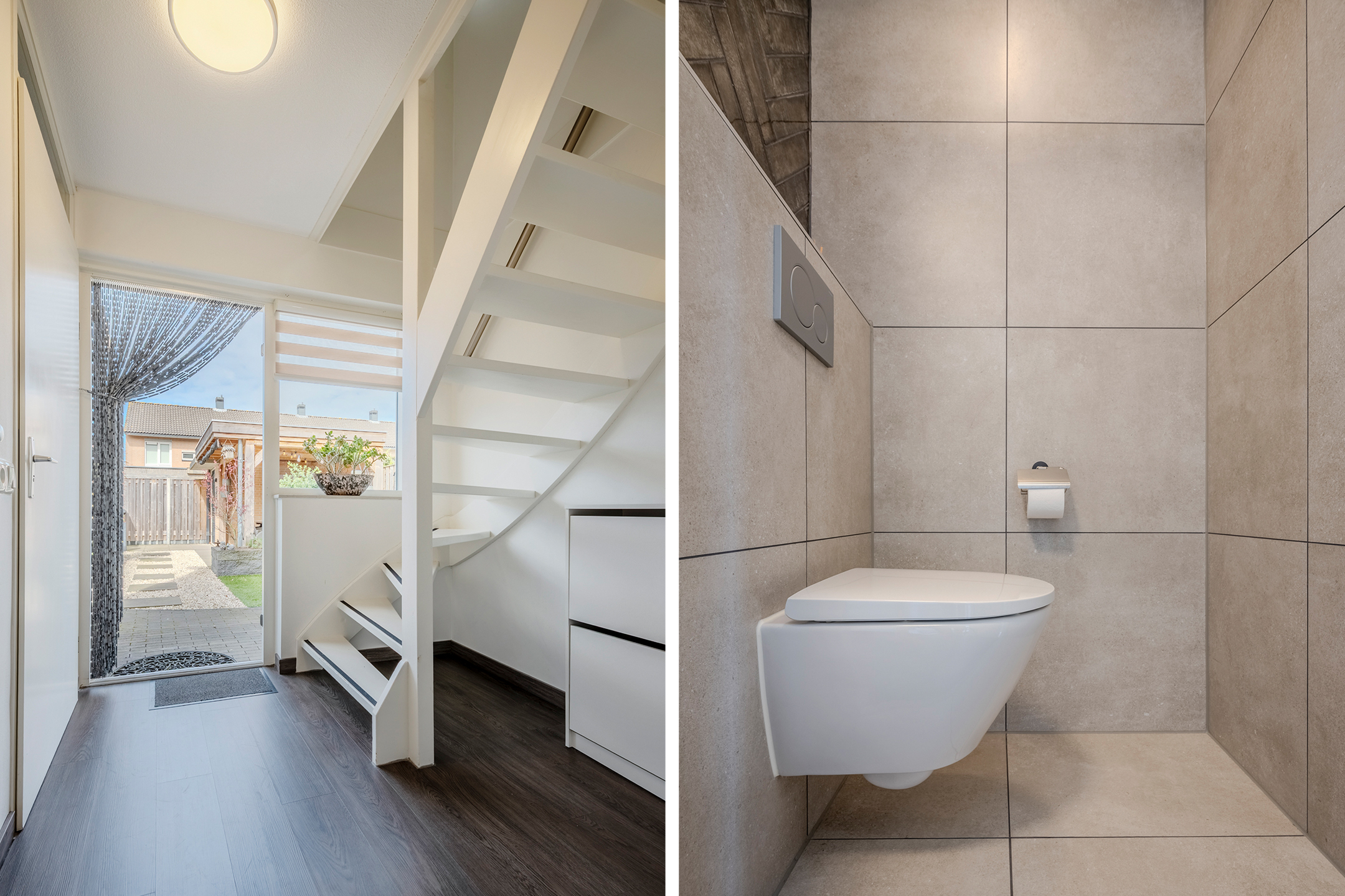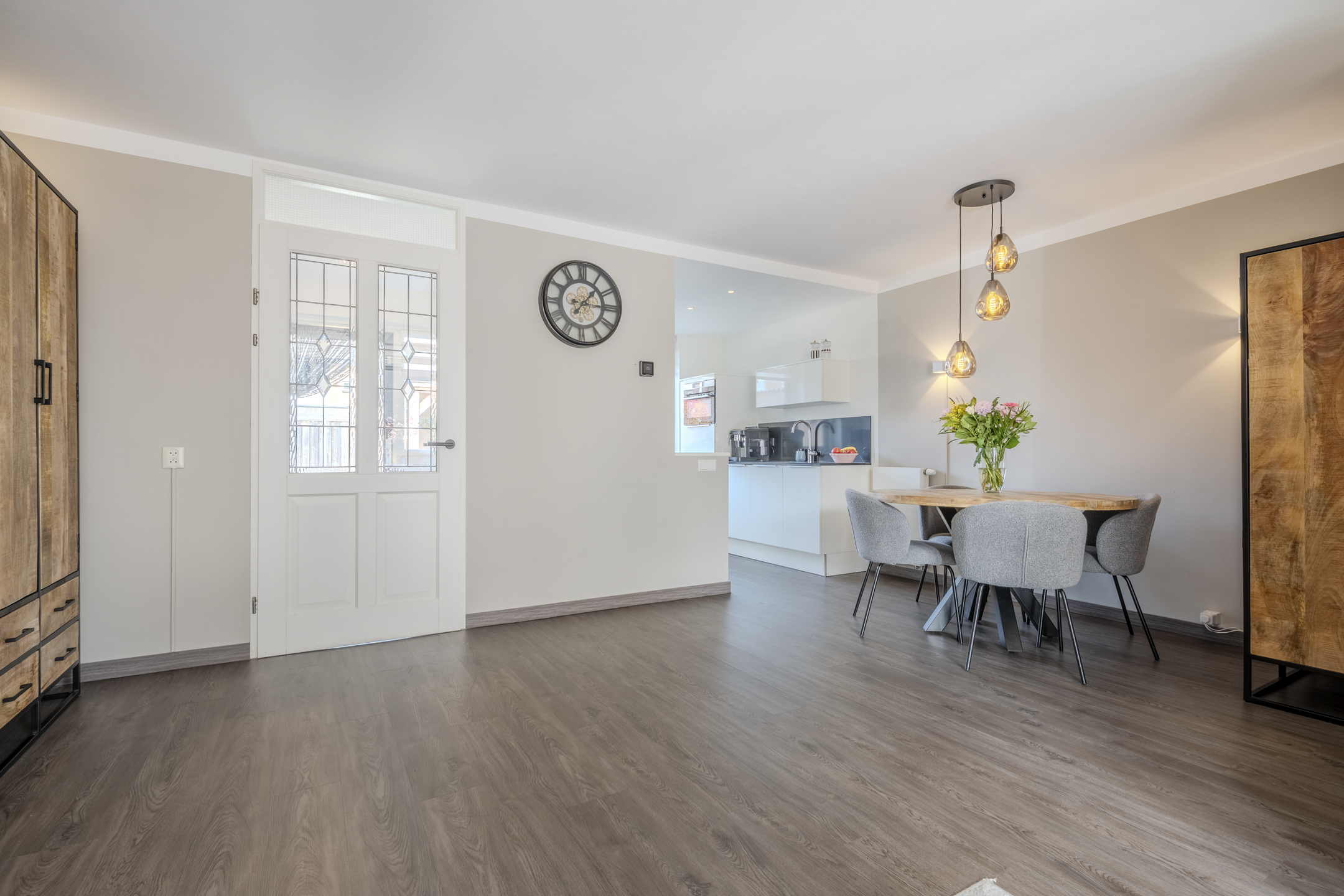 Entree/hal met toegang tot de meterkast en de sfeervolle living welke is voorzien van een fraaie klik PVC vloer, strakke wanden en plafond en een erker aan de voorzijde. Het zitgedeelte bevindt zich aan de voorzijde van de woning en het eetgedeelte en de keuken aan de achterzijde. De open keuken is voorzien van een nette keukeninrichting (geplaatst in 2020) met diverse inbouwapparatuur, te weten: een inductiekookplaat, afzuigkap, vaatwasser, koelkast en combi-oven/magnetron. Via de living bereikt u een tussenhal met de trapopgang naar de eerste verdieping, een loopdeur naar de achtertuin, een praktische kast en een nette, in 2024 vernieuwde en volledig betegelde toiletruimte met vrijhangend closet.