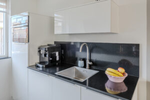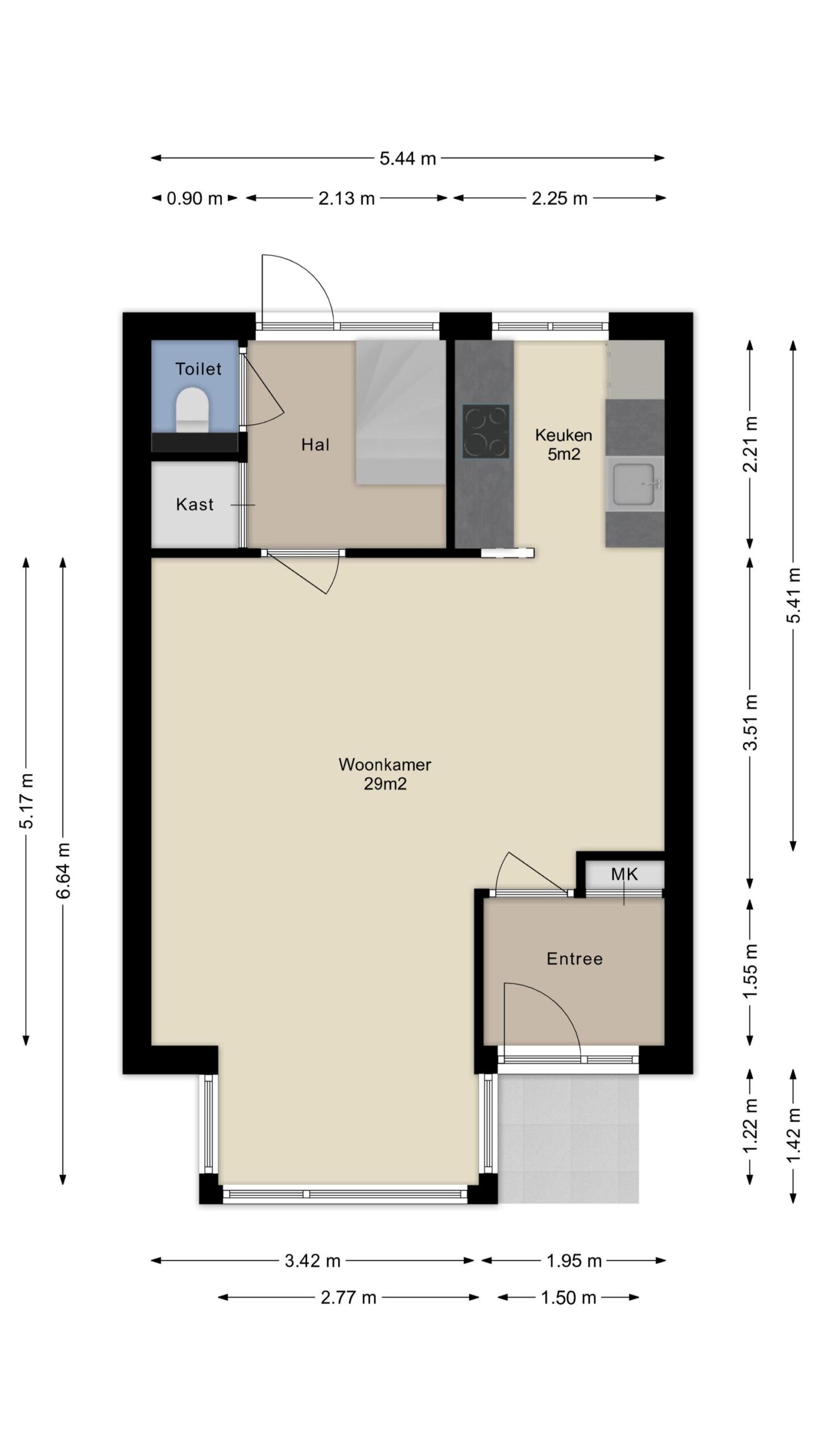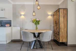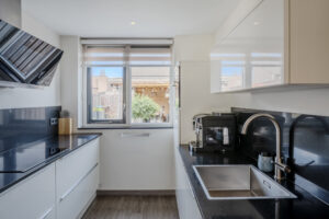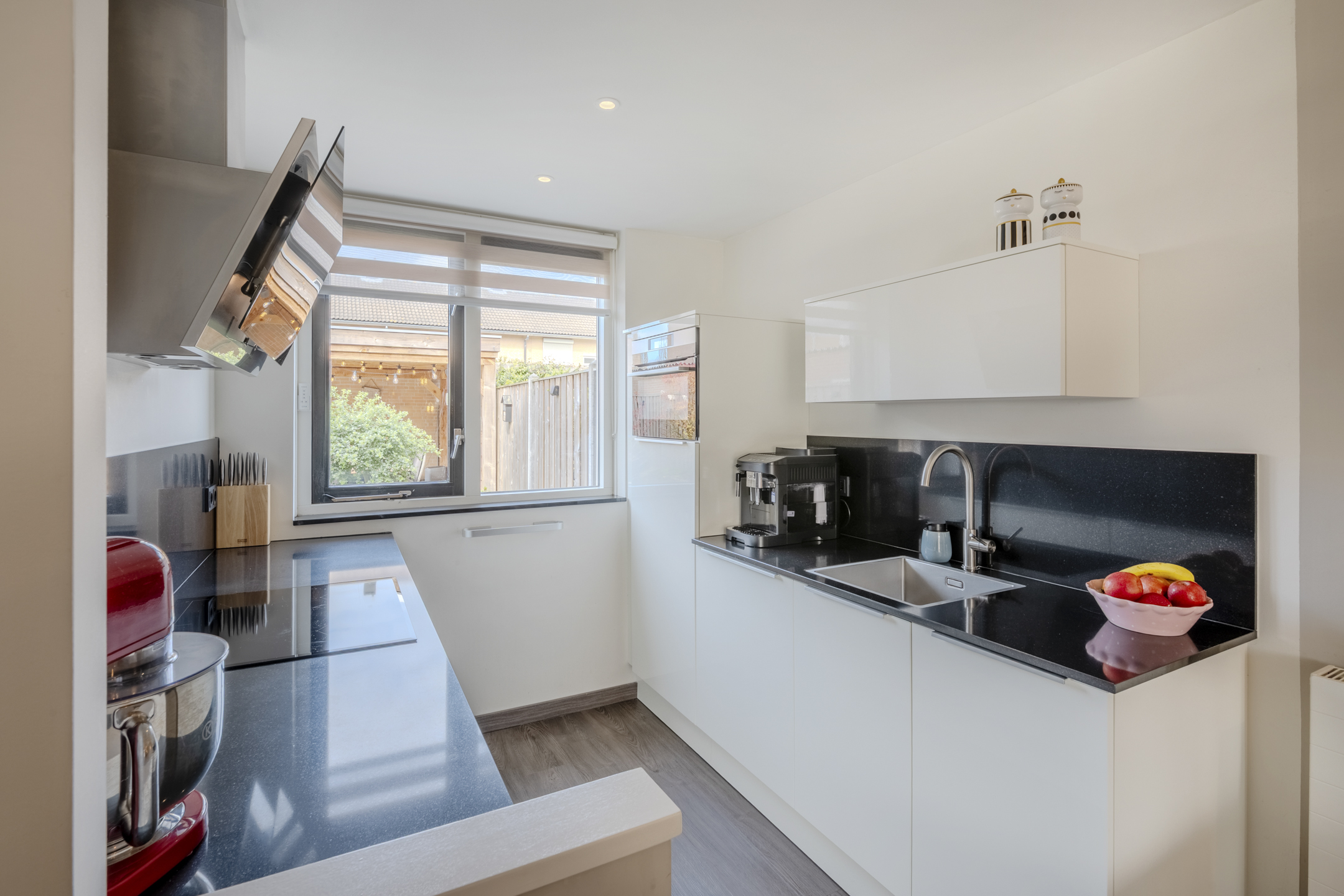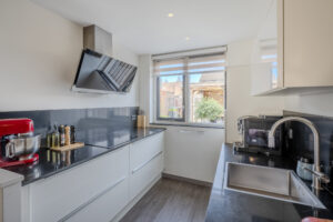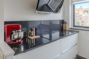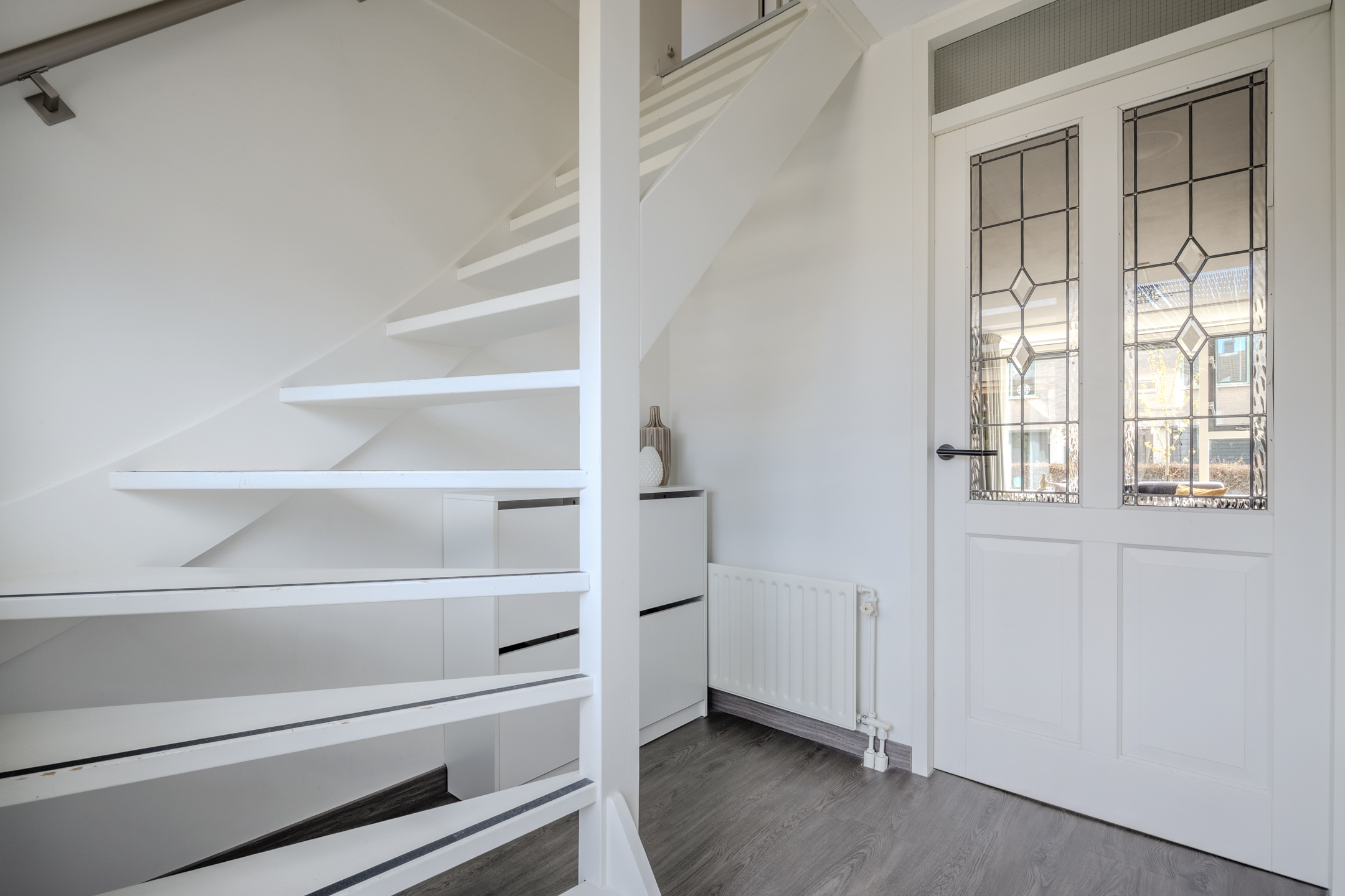 Entree/hal met toegang tot de meterkast en de sfeervolle living welke is voorzien van een fraaie klik PVC vloer, strakke wanden en plafond en een erker aan de voorzijde. Het zitgedeelte bevindt zich aan de voorzijde van de woning en het eetgedeelte en de keuken aan de achterzijde. De open keuken is voorzien van een nette keukeninrichting (geplaatst in 2020) met diverse inbouwapparatuur, te weten: een inductiekookplaat, afzuigkap, vaatwasser, koelkast en combi-oven/magnetron. Via de living bereikt u een tussenhal met de trapopgang naar de eerste verdieping, een loopdeur naar de achtertuin, een praktische kast en een nette, in 2024 vernieuwde en volledig betegelde toiletruimte met vrijhangend closet.
