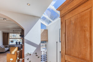 Entree/hal met toegang tot de vernieuwde meterkast en trapopgang naar de eerste verdieping. Vanuit de hal heeft u toegang tot de ruime, uitgebouwde living welke is voorzien van een fraaie tegelvloer, een vaste kast, praktische kelderkast, rolluiken en een hoog plafond. De open keuken aan de achterzijde is voorzien van diverse kastjes, lades en apparatuur. Tevens is de keuken voorzien van een prachtige lichtstraat met zonwering en dubbele openslaande deuren naar de achtertuin. Via de keuken komt u in een portaal met de opstelplaats van de CV-combiketel (Vaillant, bwj. 2003) en de aansluitingen ten behoeve van de wasapparatuur. Vervolgens bereikt u de moderne, volledig betegelde toiletruimte (uit 2018) met hangend closet en fonteintje en de moderne, volledig betegelde badkamer (uit 2018) met een inloopdouche, wastafelmeubel en designradiator.