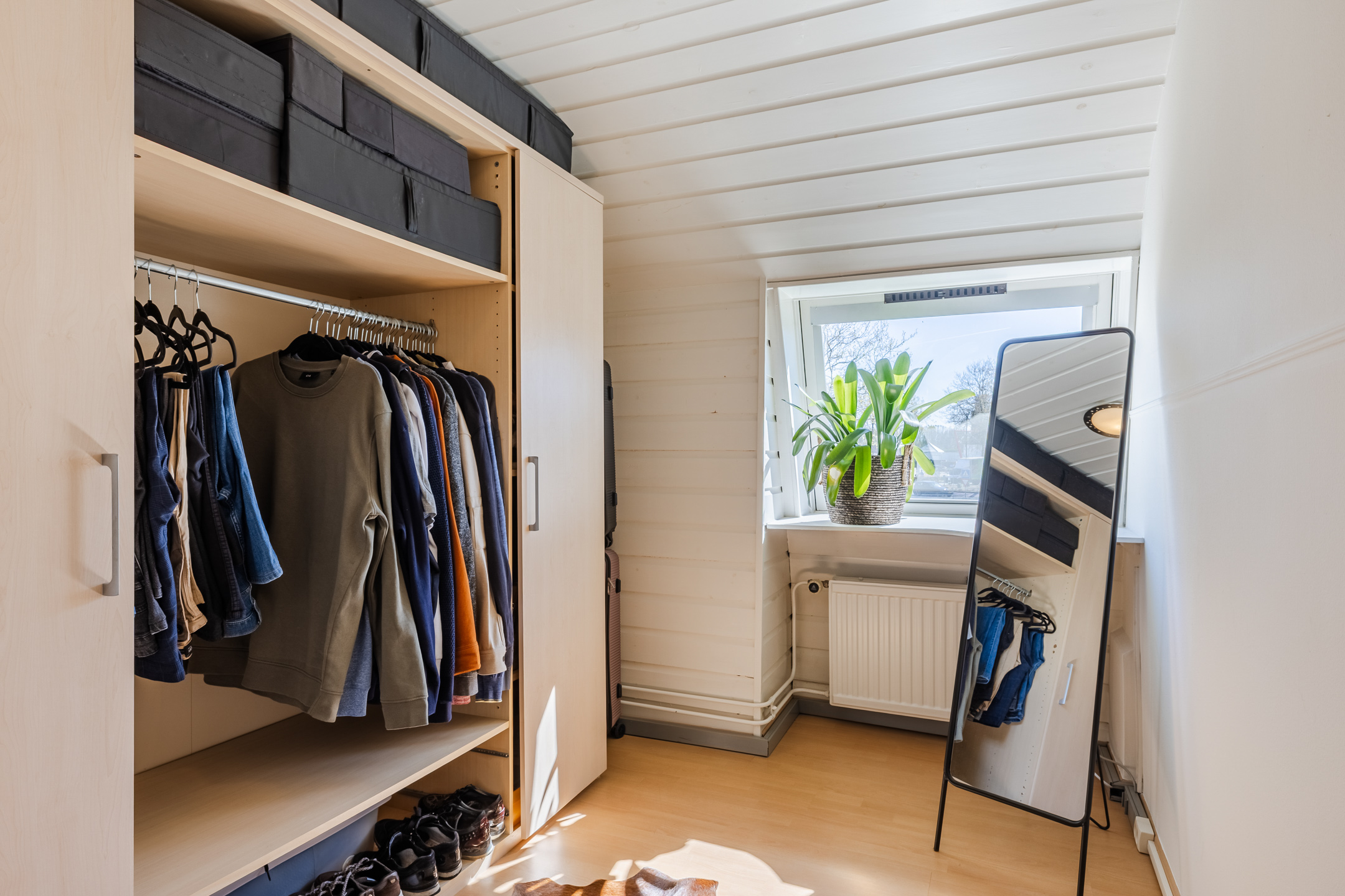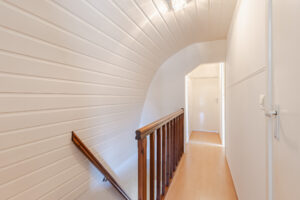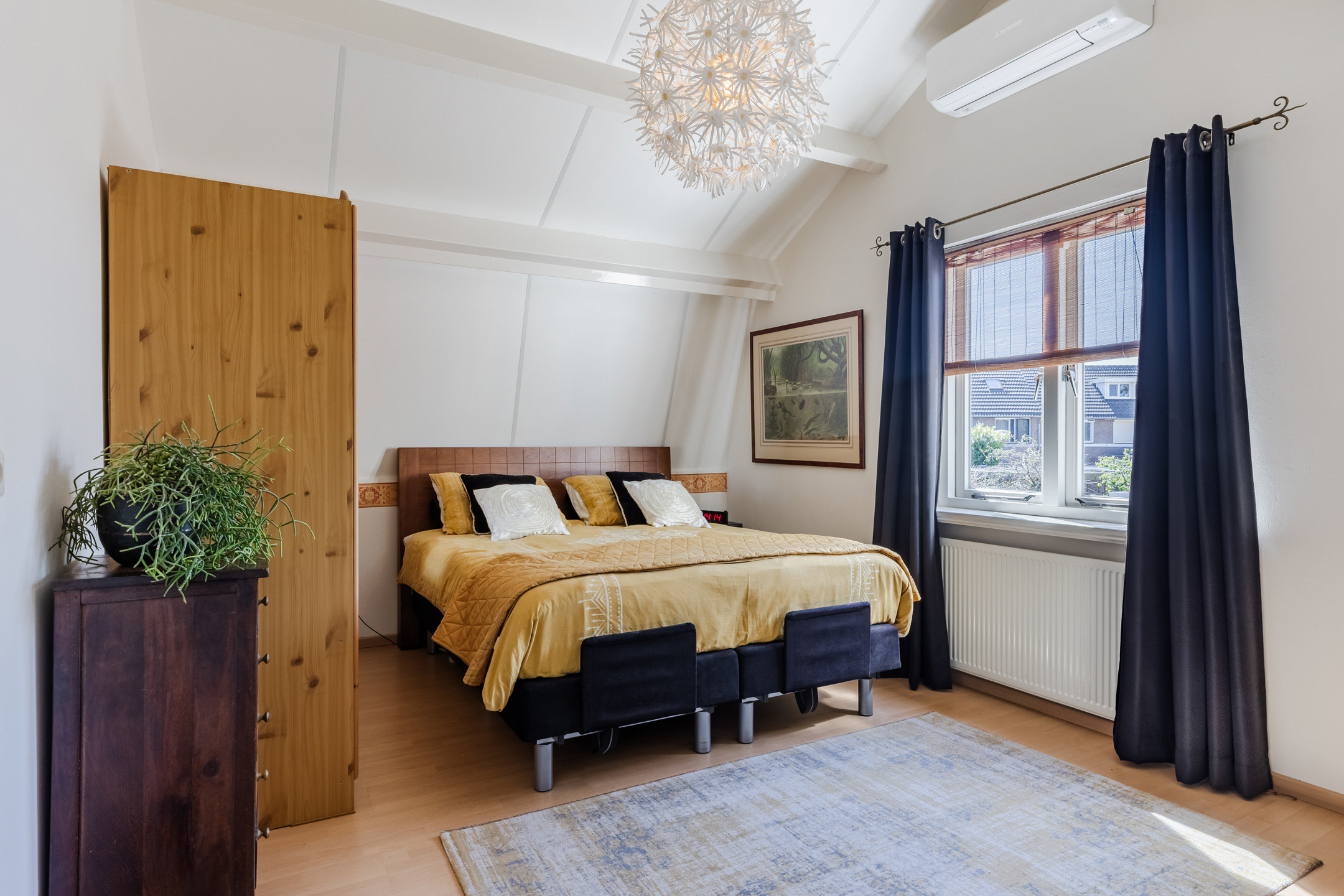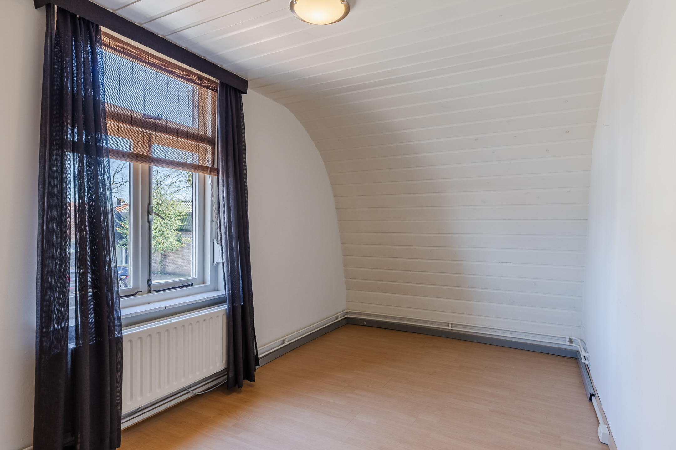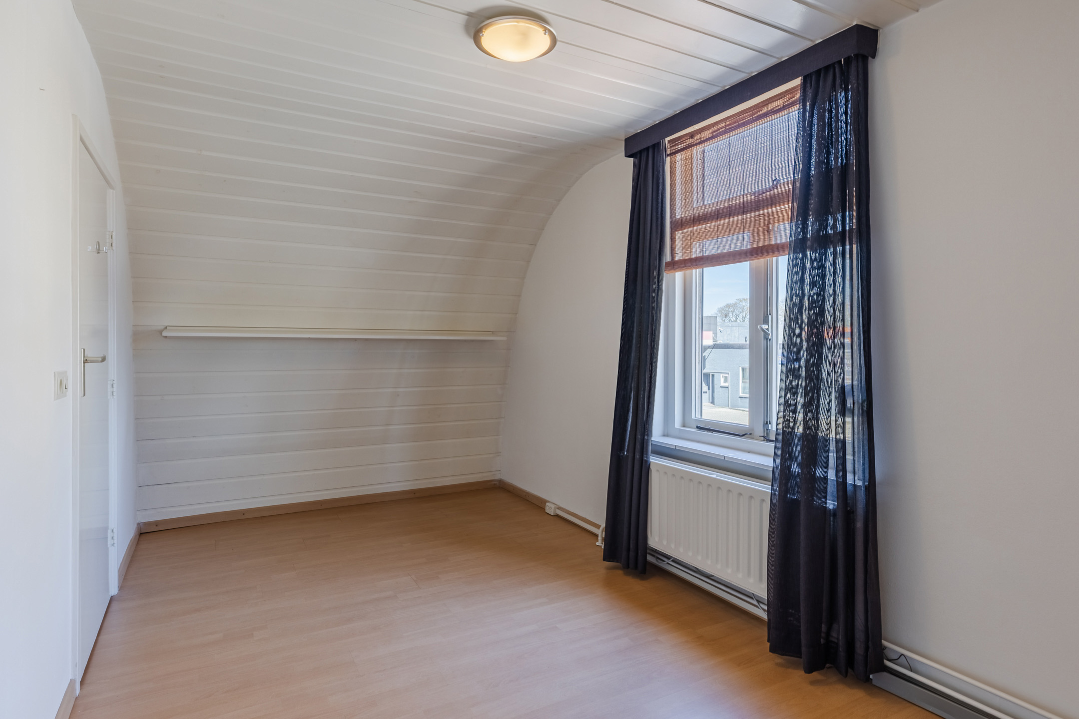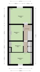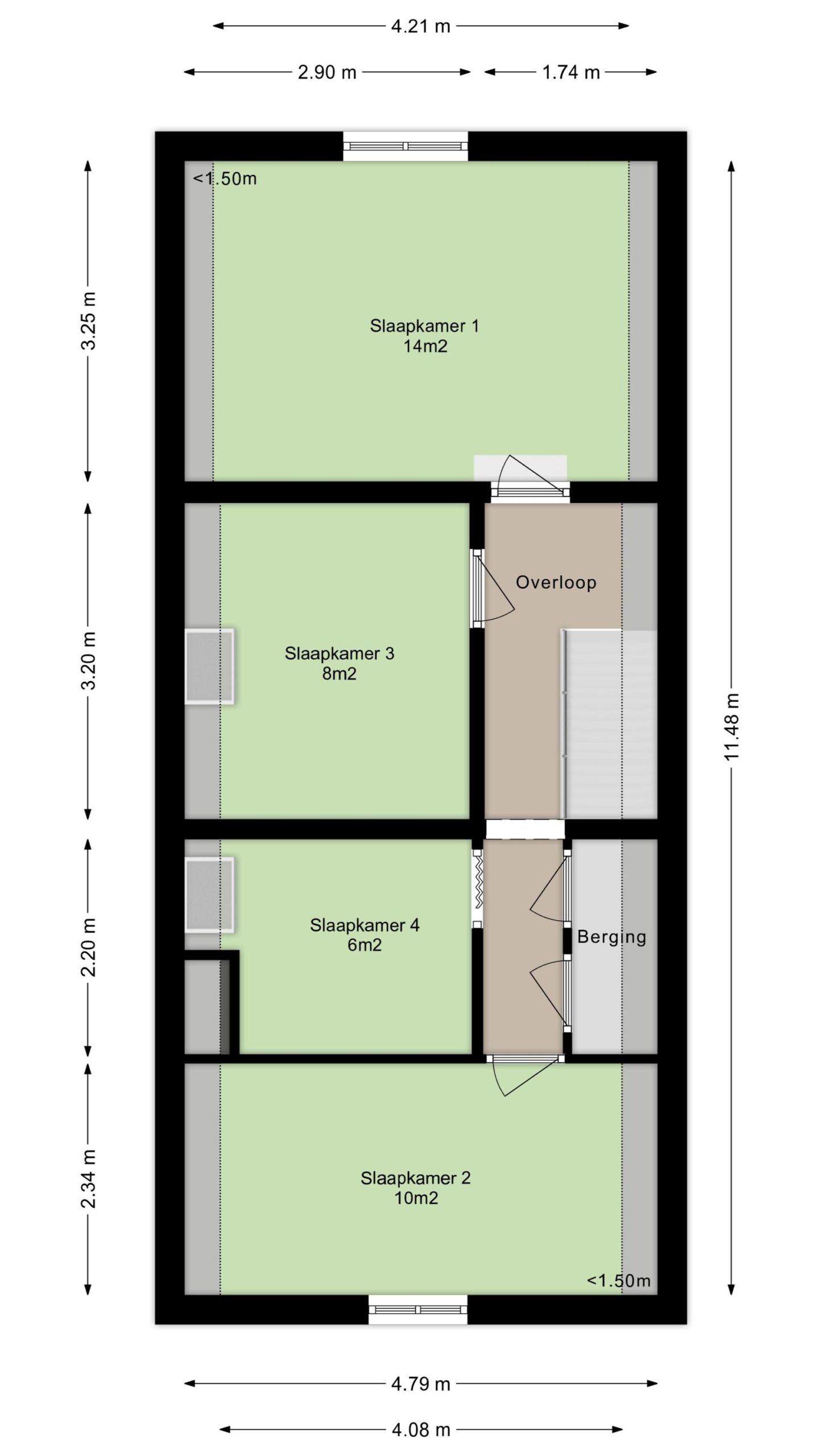 Overloop met vaste kasten en toegang tot 4 slaapkamers. Hoofdslaapkamer 1 van ca. 14m² bevindt zich aan de achterzijde en is voorzien van een airconditioning, slaapkamer 2 van ca. 10m² bevindt zich aan de voorzijde en is voorzien van een rolluik, slaapkamer 3 van ca. 8m² en slaapkamer 4 van ca. 6m² bevinden zich in het midden van de woning. De gehele verdieping is voorzien van een laminaatvloer.