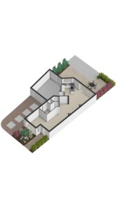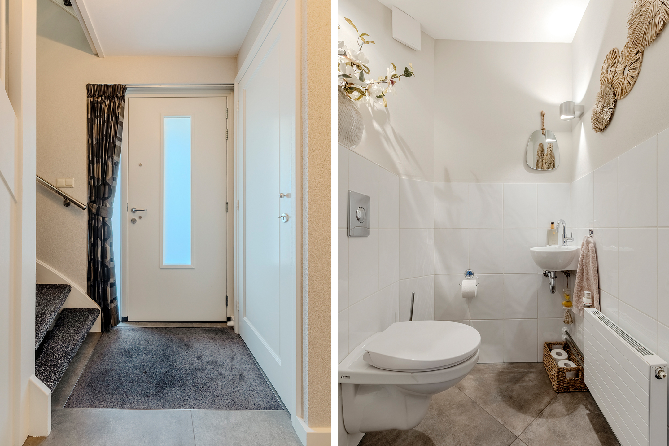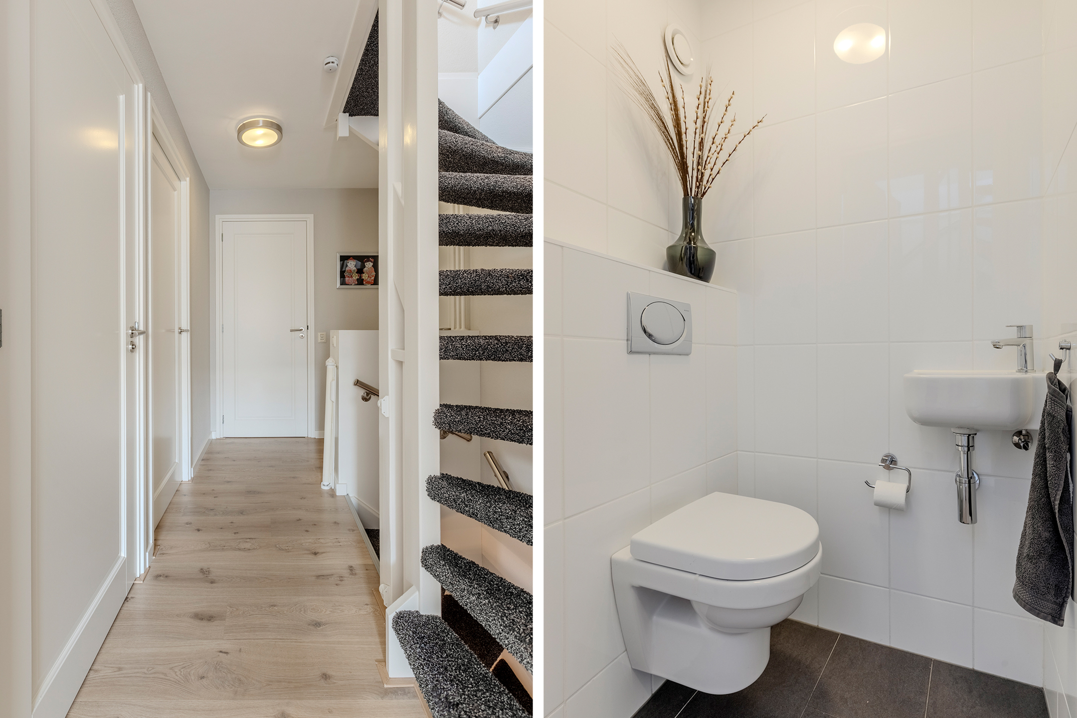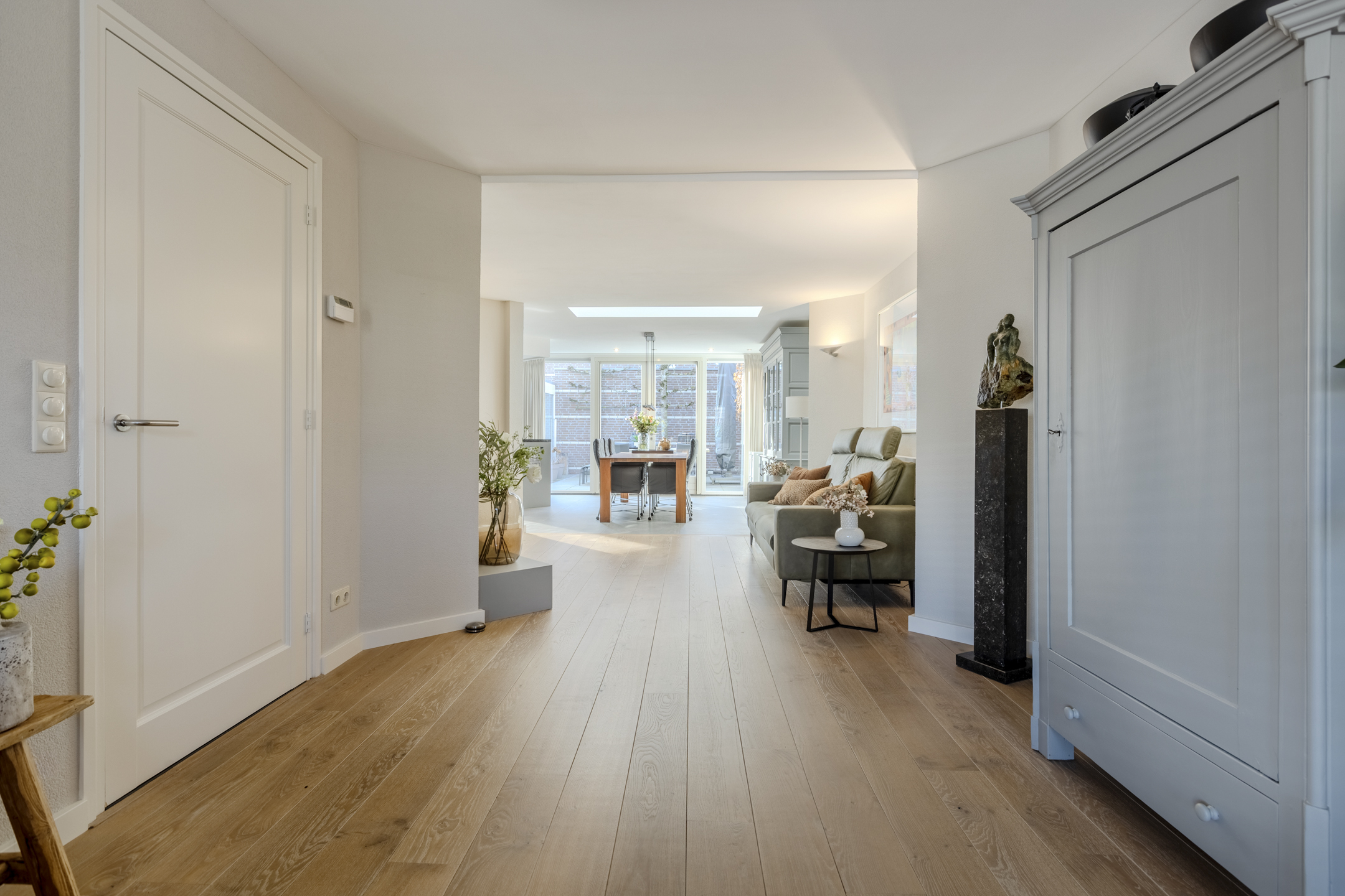 Overdekte zij/entree, hal met tegelvloer, uitgebreide meterkast, modern licht betegeld toilet met een vrijhangend closet en fontein, trapopgang naar de eerste verdieping en toegang tot de living van maar liefst ca. 67m². De indeling van de living is als volgt: het aan de voorzijde van de living gelegen zitgedeelte is voorzien van een houten vloer en een leuke erker. Aan de achtertuin-zijde bevindt zich de leefkeuken met het eetgedeelte. Deze ruimte is speels ingedeeld en voorzien van een fraaie tegelvloer met vloerverwarming, airconditioning (verwarmen en koelen) en een prachtige lichtstraat. Deze lichtstraat draagt zorg voor een prettige lichtinval in o.a de uitbouw.