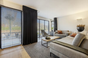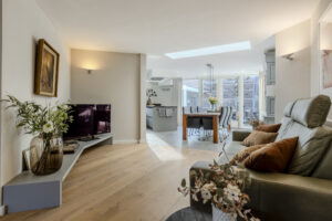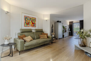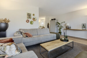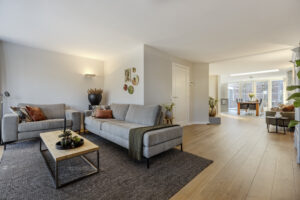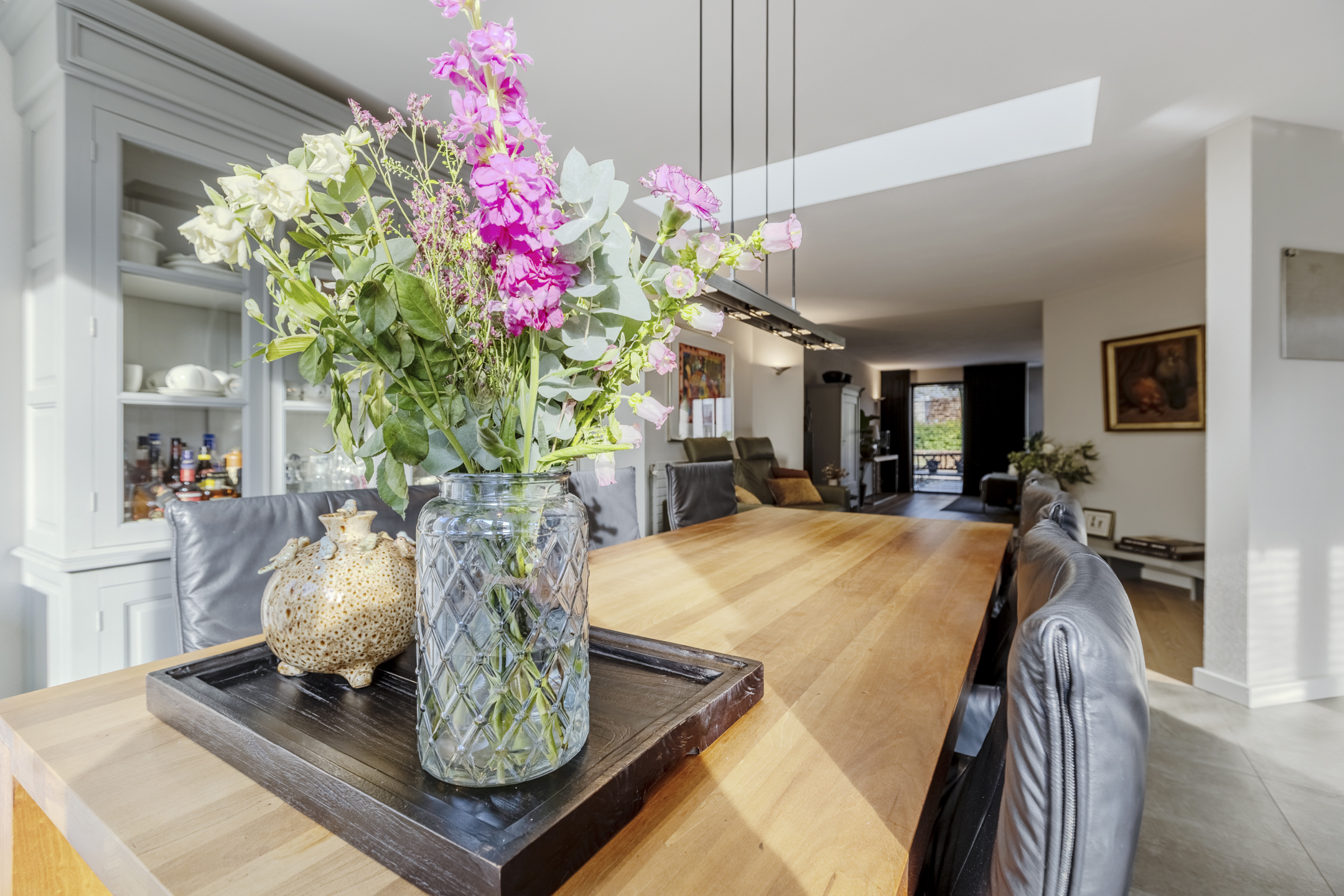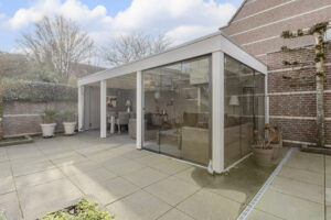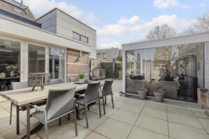 - Aan de tuinzijde over de volle breedte uitgebouwde living met openslaande tuindeuren.