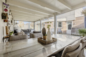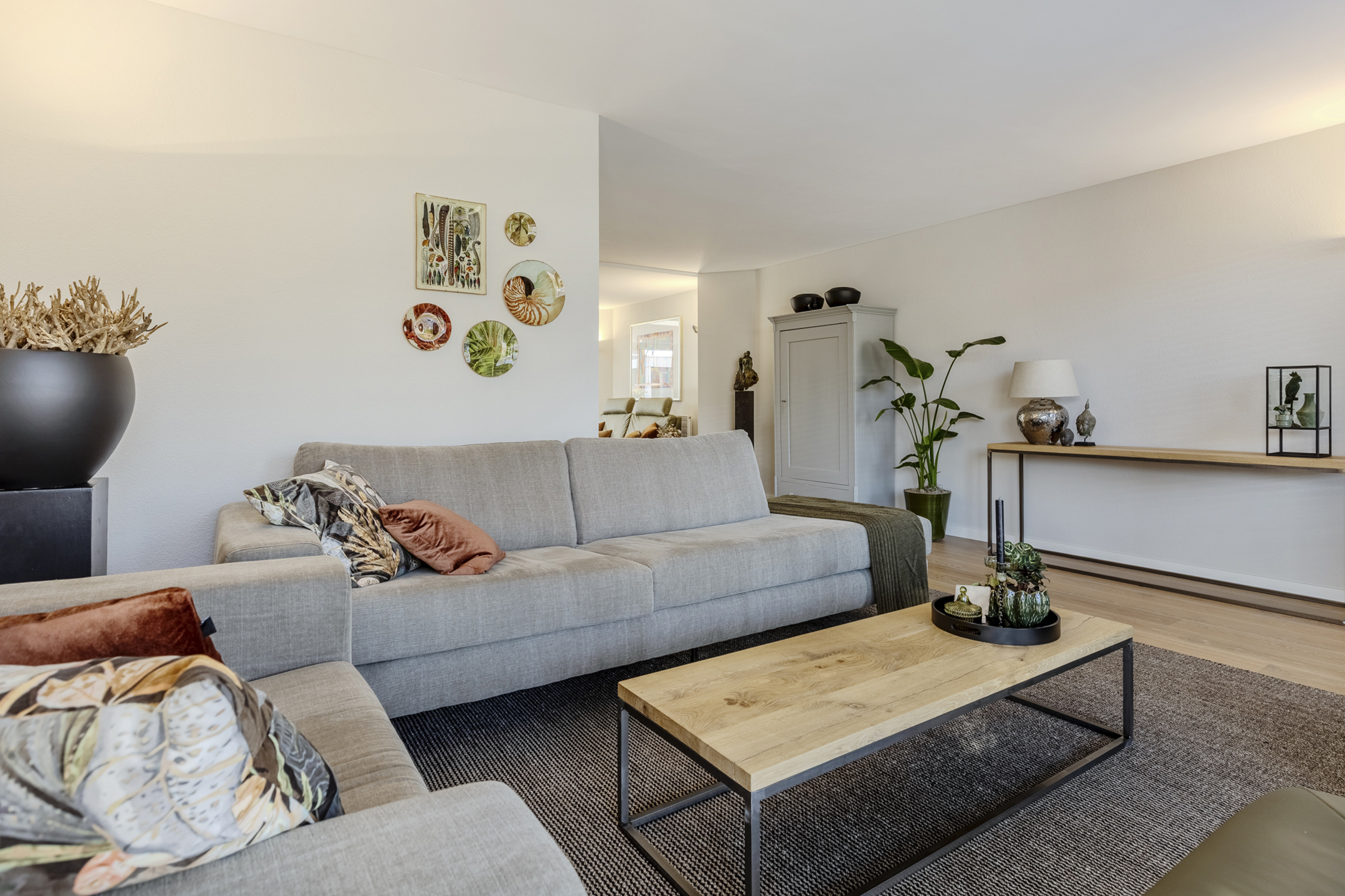 - Living gedeeltelijk voorzien van een houten vloer (zitgedeelte) en gedeeltelijk van een fraaie keramische tegelvloer (eetkamer/keuken).