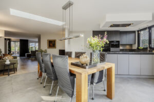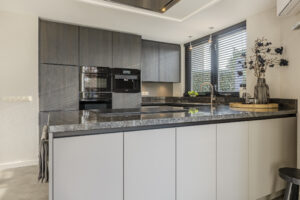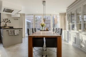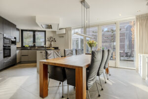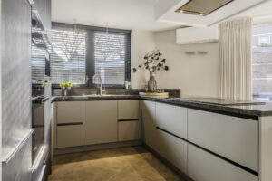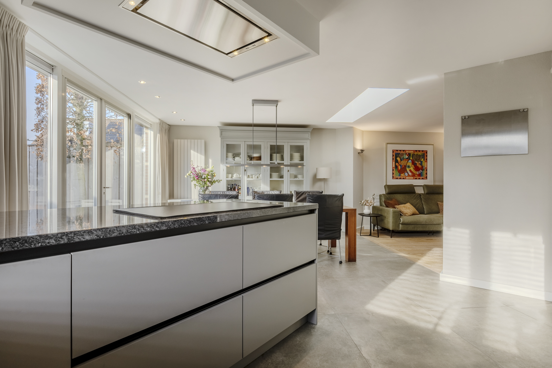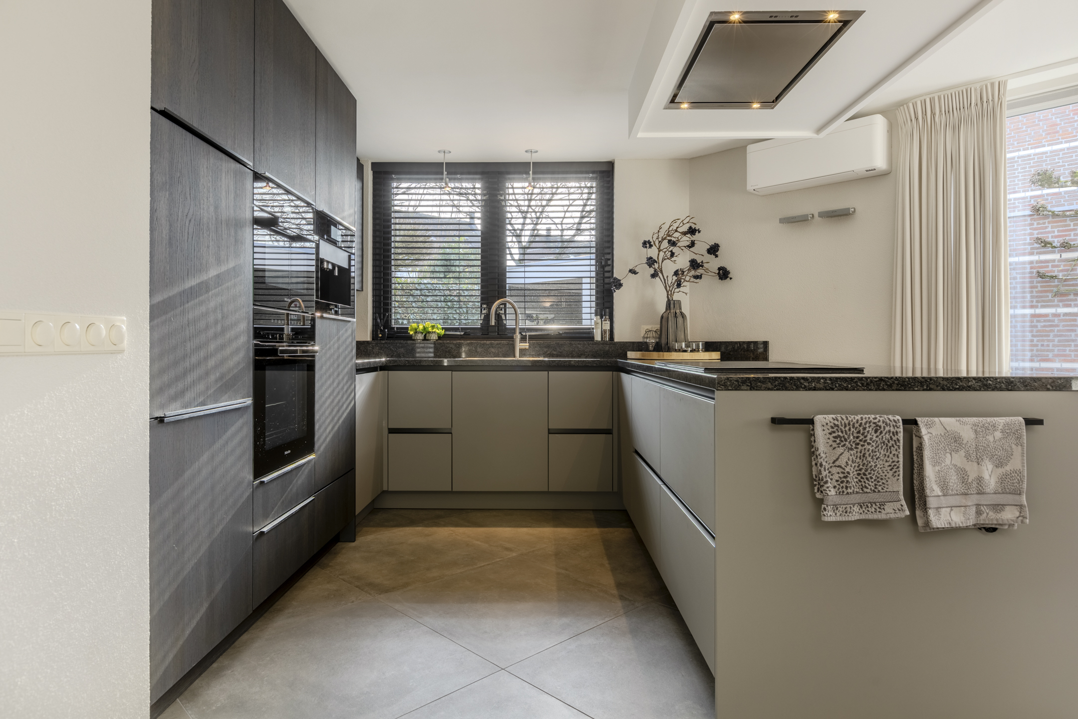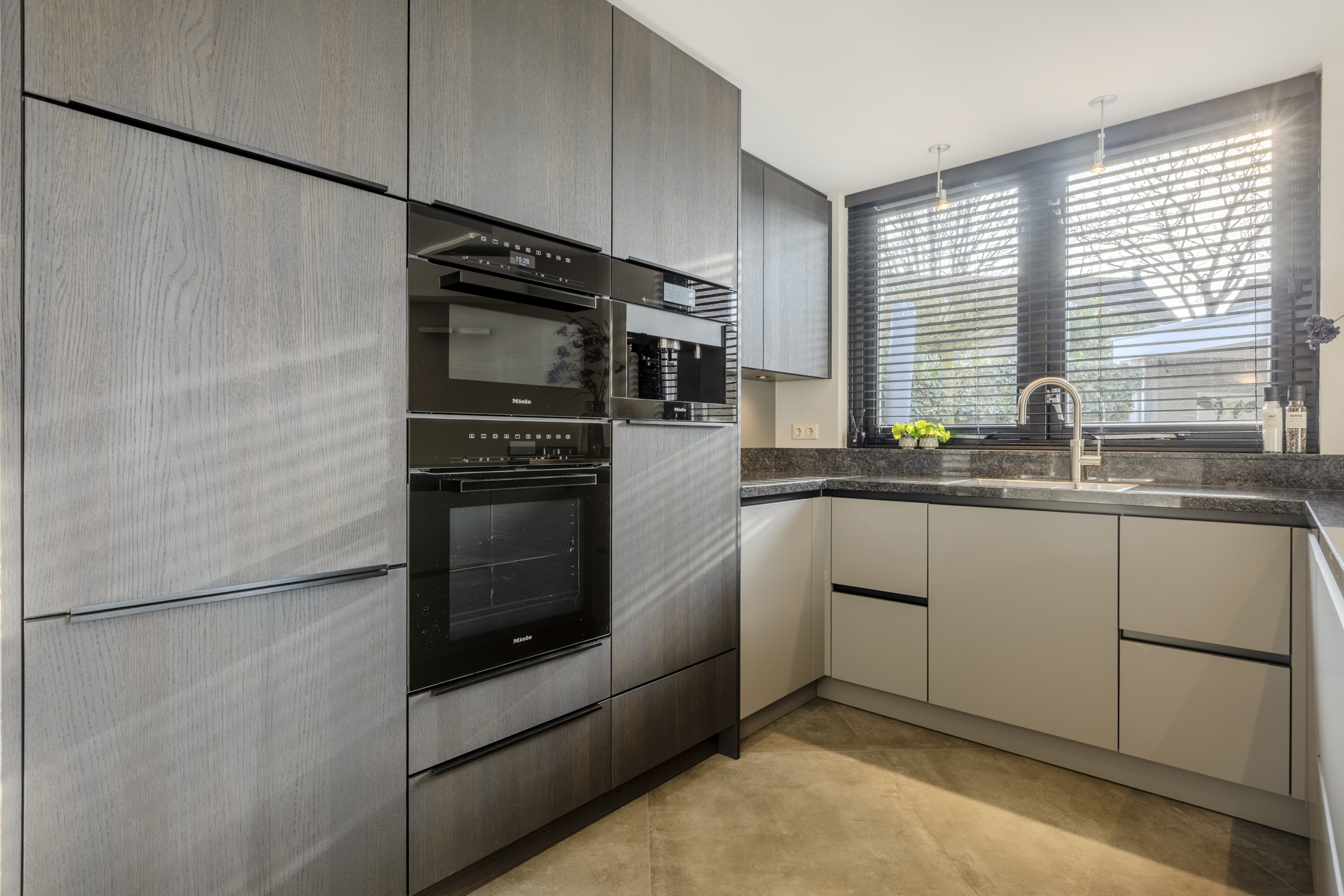 Direct in verbinding met het eetgedeelte staat de recent compleet vernieuwde hoogwaardige keukeninrichting in U-opstelling. De keukeninrichting is voorzien van veel kastruimte en lades en tevens van de navolgende hoogwaardige inbouwapparatuur te weten: inductie-kookplaat, in het verlaagd plafond geïntegreerde afzuiging, Quooker, oven, combi-oven, koelkast, koffiemachine en een vaatwasmachine op werkhoogte.