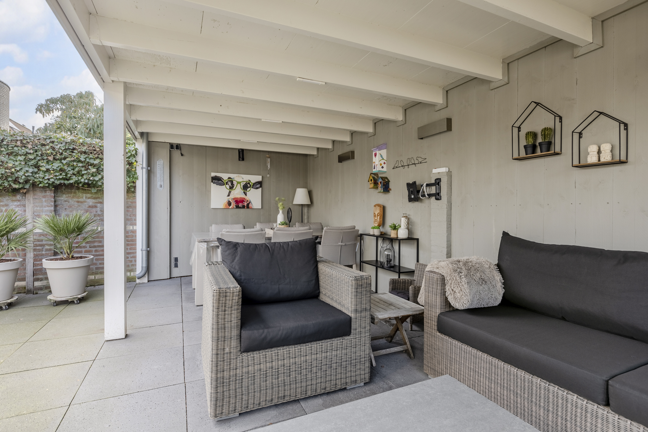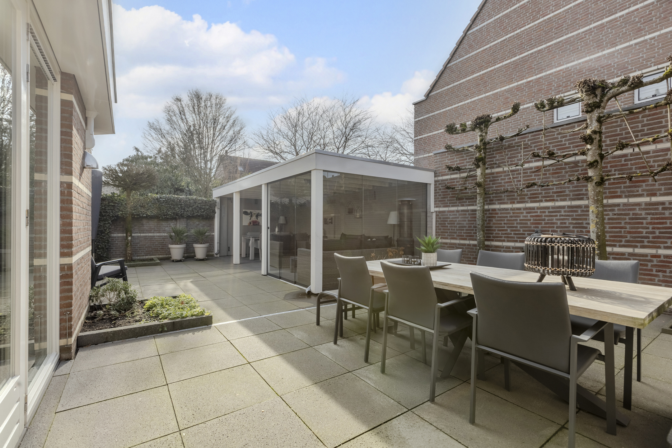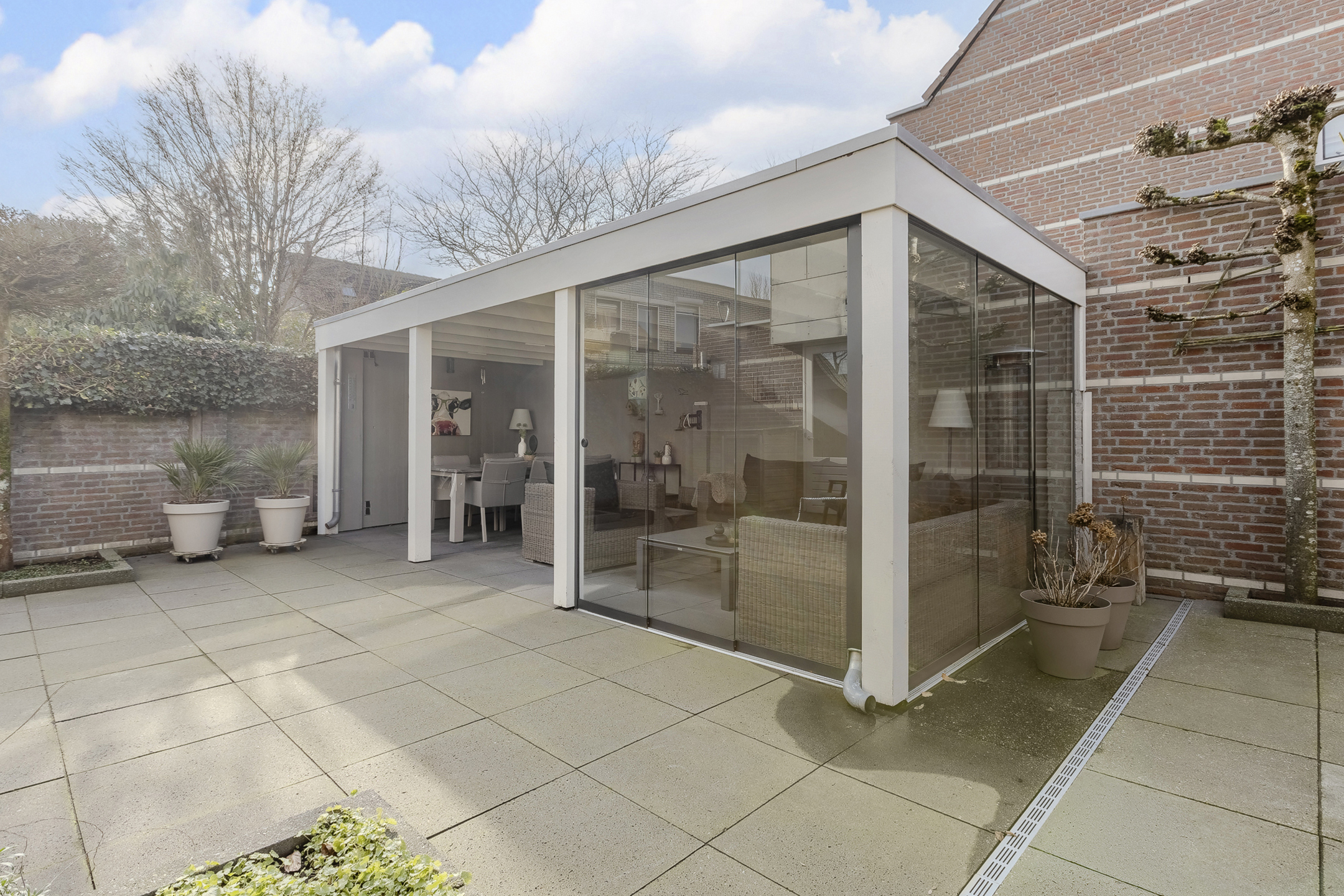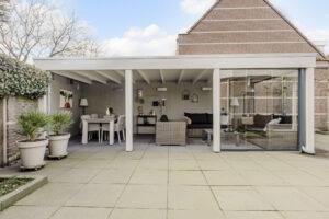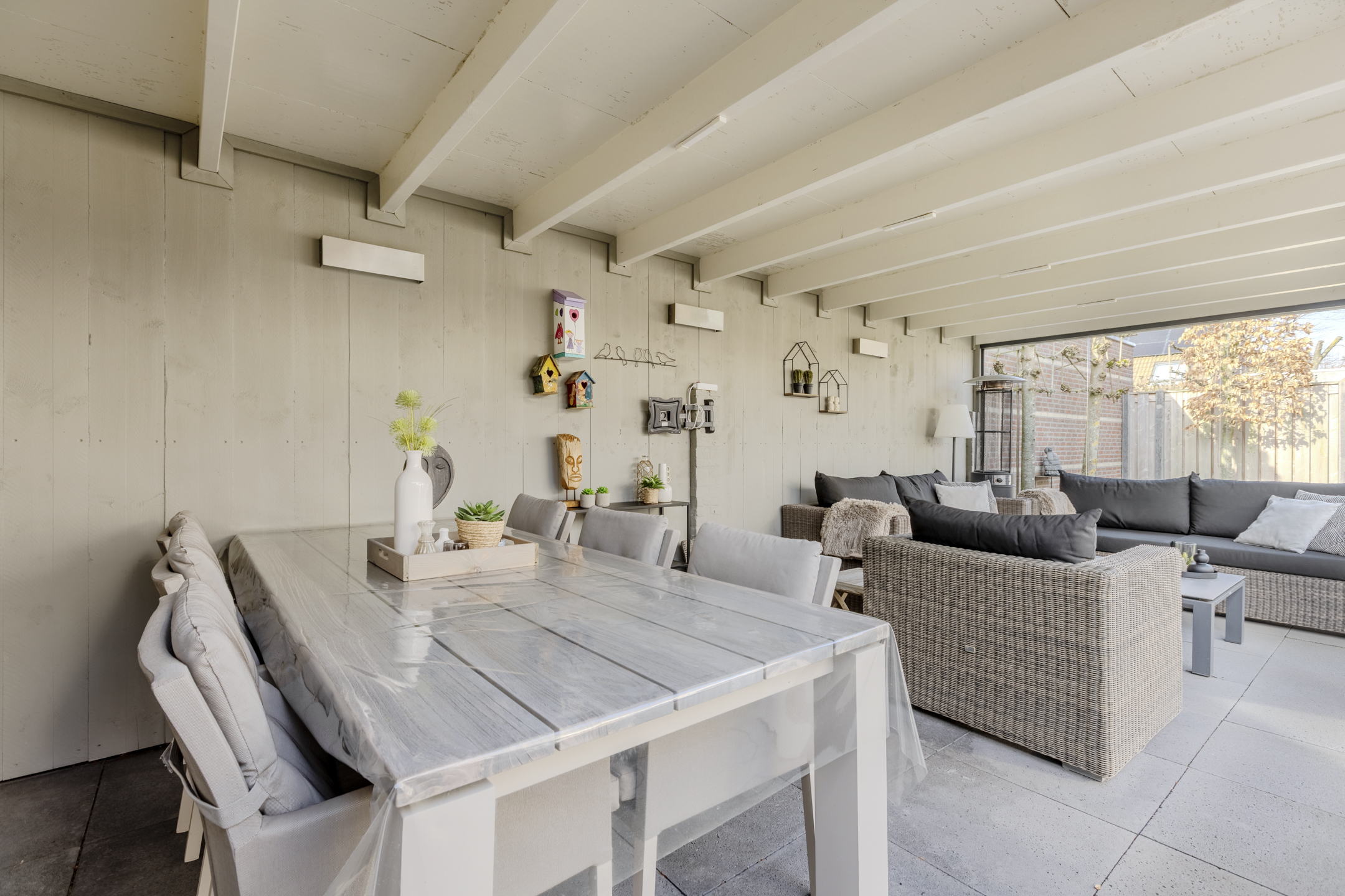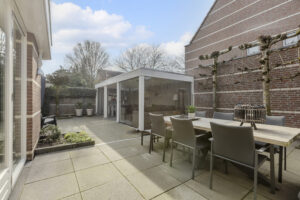Geheel omsloten onderhoudsvriendelijke aangelegde tuin op het zonnige westen. De aanwezige, grotendeels met glas afsluitbare overkapping/tuinkamer staat garant voor heel veel extra woongenot.