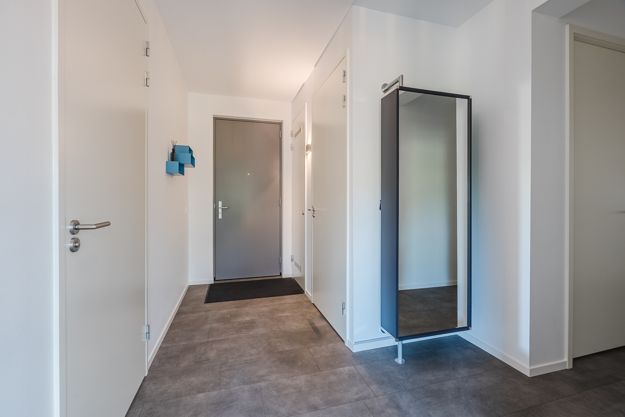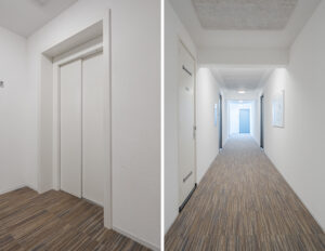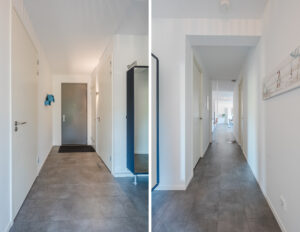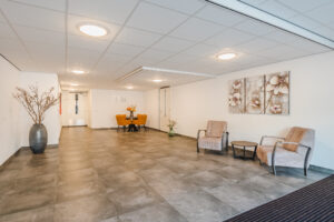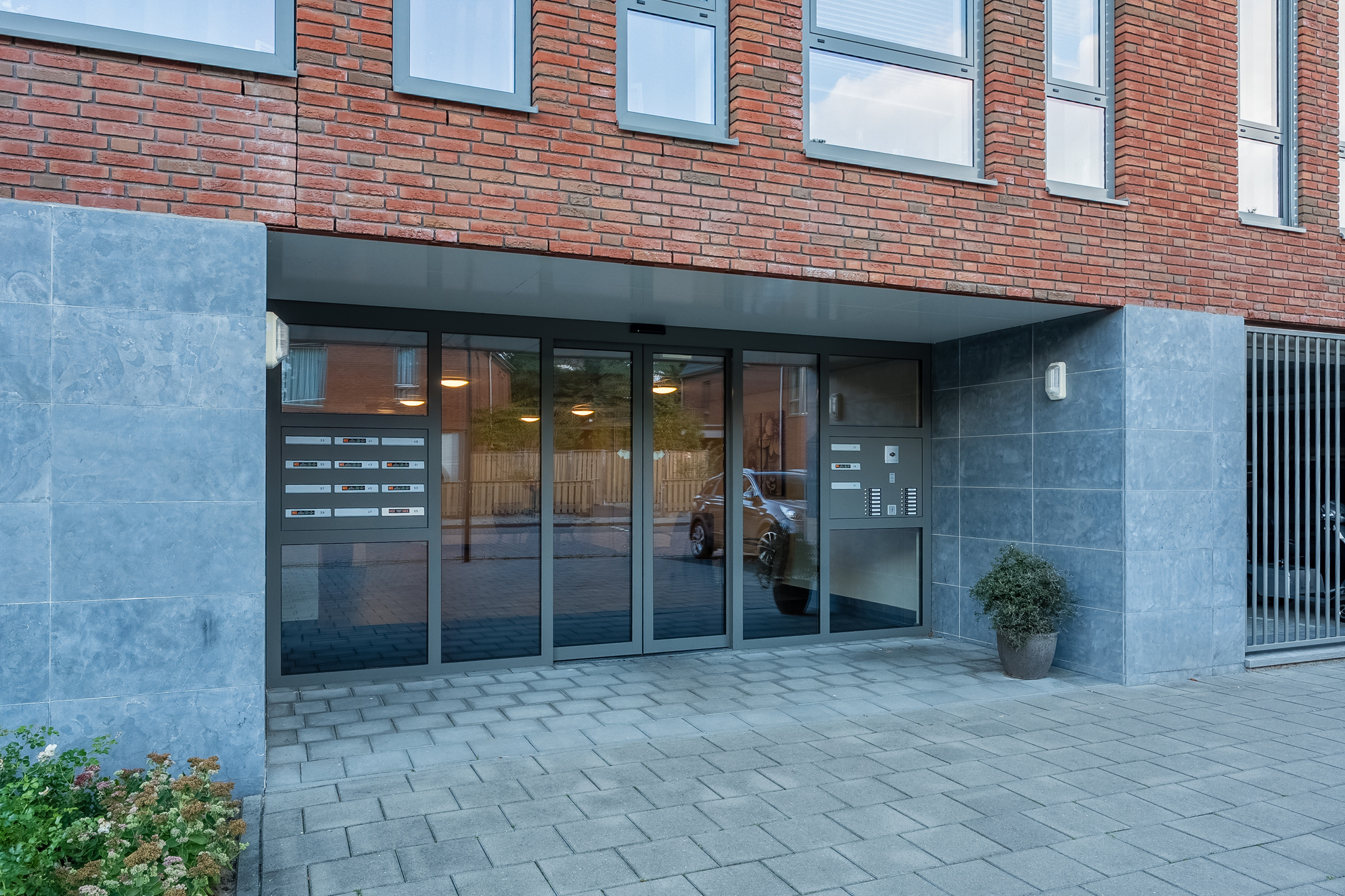 Overdekte, afgesloten entree met bel-plateau, video-intercominstallatie en brievenbussen. Centrale hal met trappenhuis en liftpartij naar de verdiepingen.
