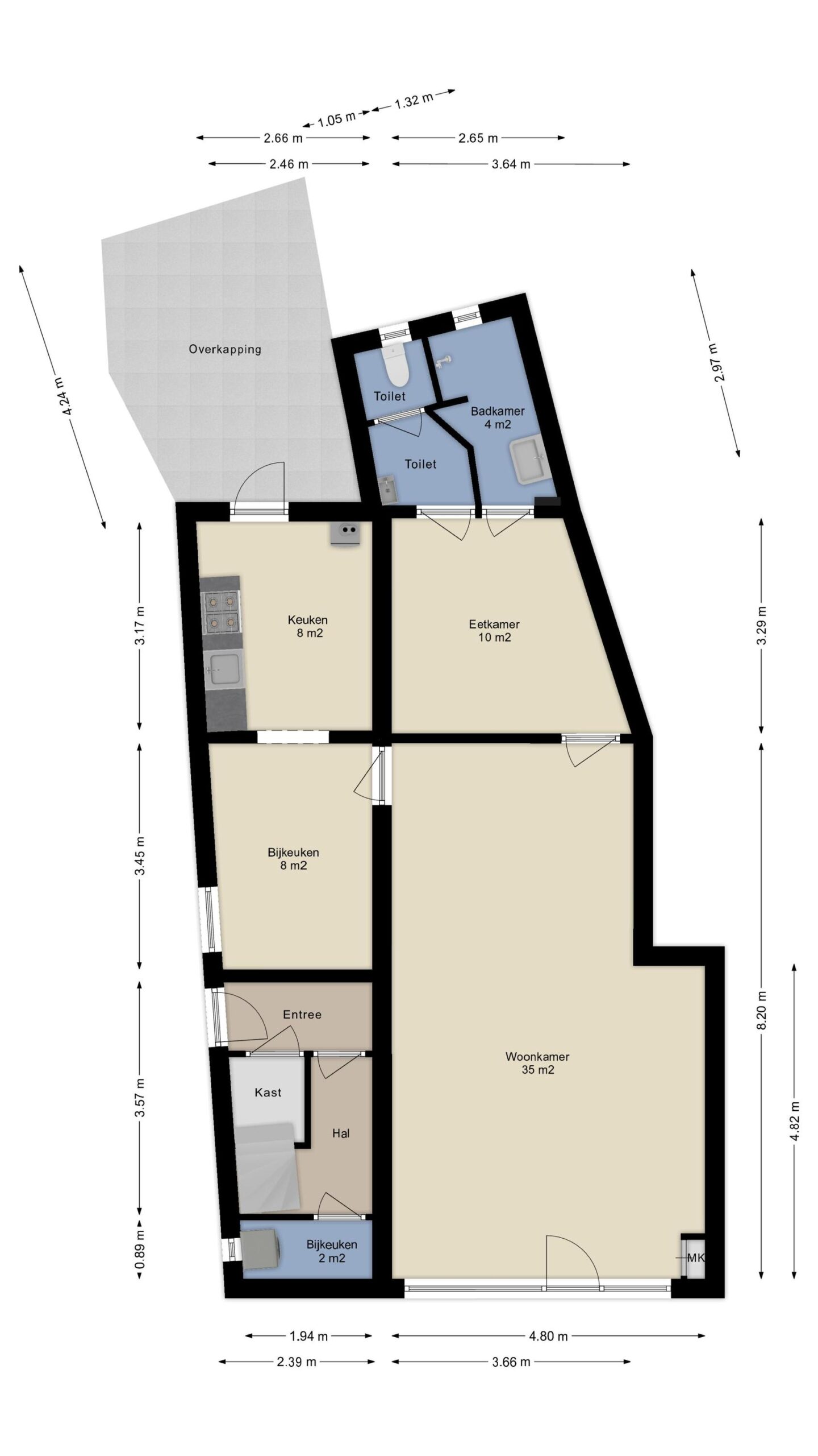 Zij-entree/hal met toegang tot een praktische trapkast, tussenportaal met de trapopgang naar de eerste verdieping en een wasruimte. De ruime woonkamer van ca. 35m² is toegankelijk via een aparte voordeur aan de straatzijde en is voorzien van een laminaatvloer. De meterkast bevindt zich in de hoek van de kamer. Grenzend aan de woonkamer bevindt zich een extra eet-/werk-/hobby-/speelkamer van ca. 10m² met toegang tot de toiletruimte met fonteintje en de badkamer. De badkamer is volledig betegeld en voorzien van een douche, wastafelmeubel met spiegelkastje en een designradiator. Vanuit de woonkamer bereikt u de praktische bijkeuken/extra kamer van ca. 8m² met toegang tot de keuken. De keuken van ca. 8m² is voorzien van diverse apparatuur, te weten: een 4-pits gaskookplaat, afzuigkap, oven en een losse koel-/vriescombinatie. Tevens hangt hier de c.v.-ketel en is er een loopdeur naar de achtertuin.