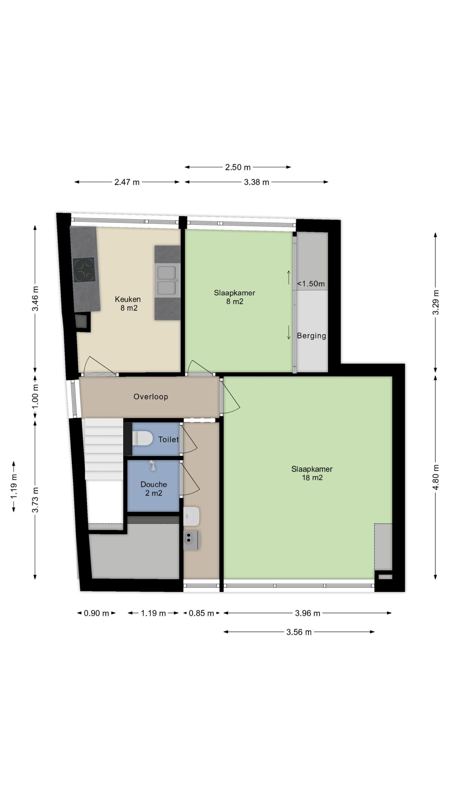 Overloop met toegang tot een tweede keuken van ca. 8m² (welke weer eenvoudig teruggezet kan worden naar een slaapkamer) en nog 2 kamers aan de voor- en achterzijde van resp. ca. 18m² en 8m². De grootste kamer aan de voorzijde is voorzien van een dakkapel. Op deze verdieping is er eveneens een douche aanwezig, aparte toiletruimte, een wastafel en de c.v.-ketel.