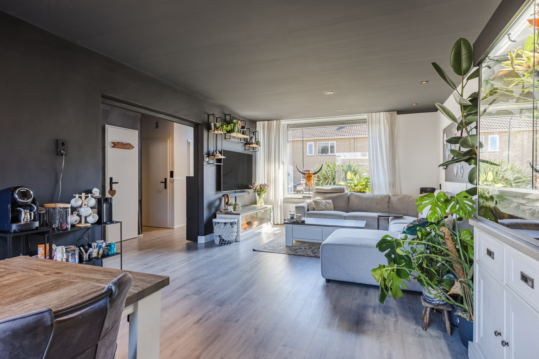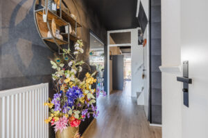 Entree met zeer ruime hal, trapopgang en modern afgewerkte toiletruimte met een vrijhangend toilet en een fonteintje. Vanuit de hal is er via een open verbinding toegang tot de woonkamer. De woonkamer is voorzien van een fraaie pvc-vloer en heeft een geweldige lichtinval. Vanuit de hal is er een open doorgang naar de uitgebouwde keuken aan de achterzijde. Aan de achterzijde is de ruime moderne keuken gelegen. De keuken is voorzien van een fraaie keukeninrichting met de navolgende inbouwapparatuur te weten: 6-pits gaskookstel met oven, combi-oven/magnetron, rvs-afzuiging, koelkast, vriezer en een vaatwasmachine. Verder heeft de keuken lekker veel bergruimte en is voorzien van een composiet werkblad. Vanuit de keuken is er via een loopdeur toegang tot de achtertuin.