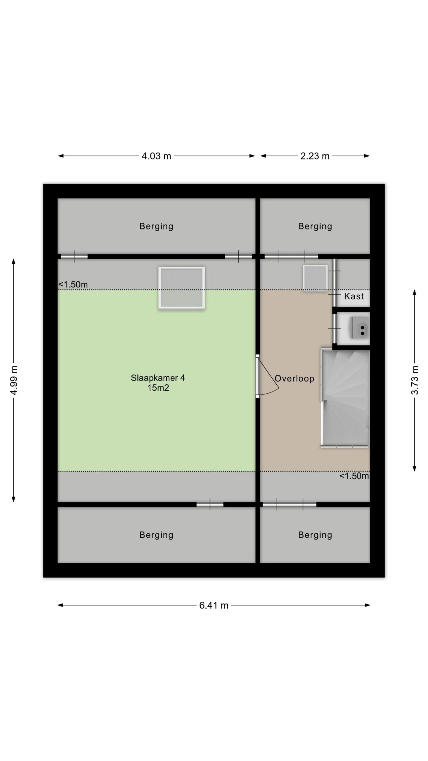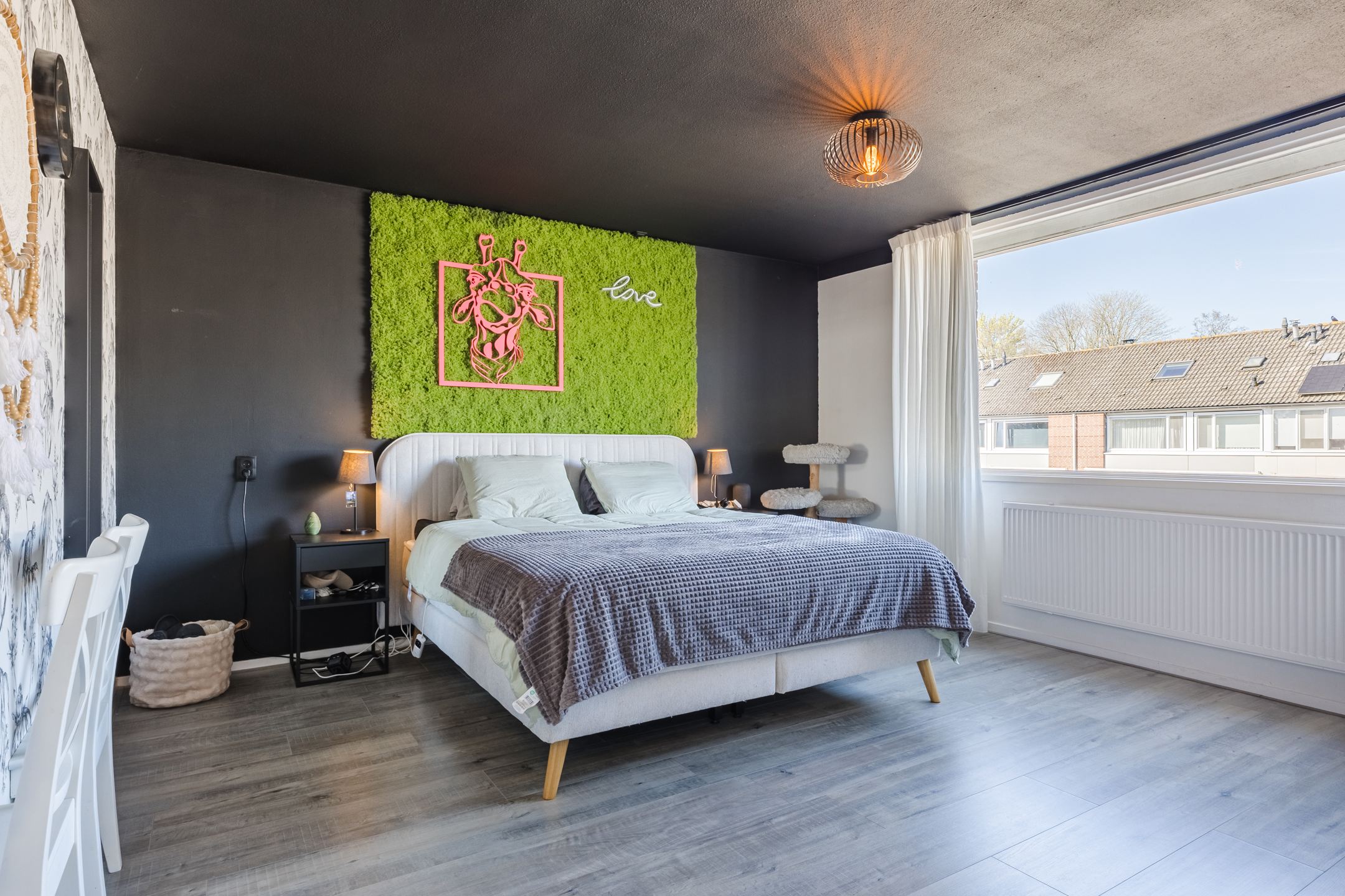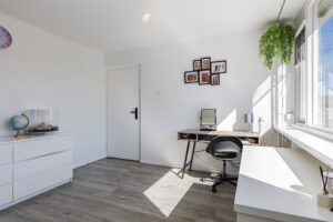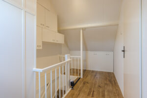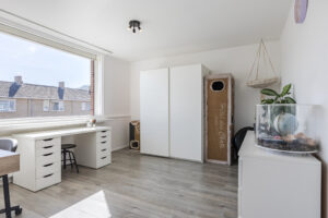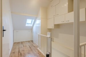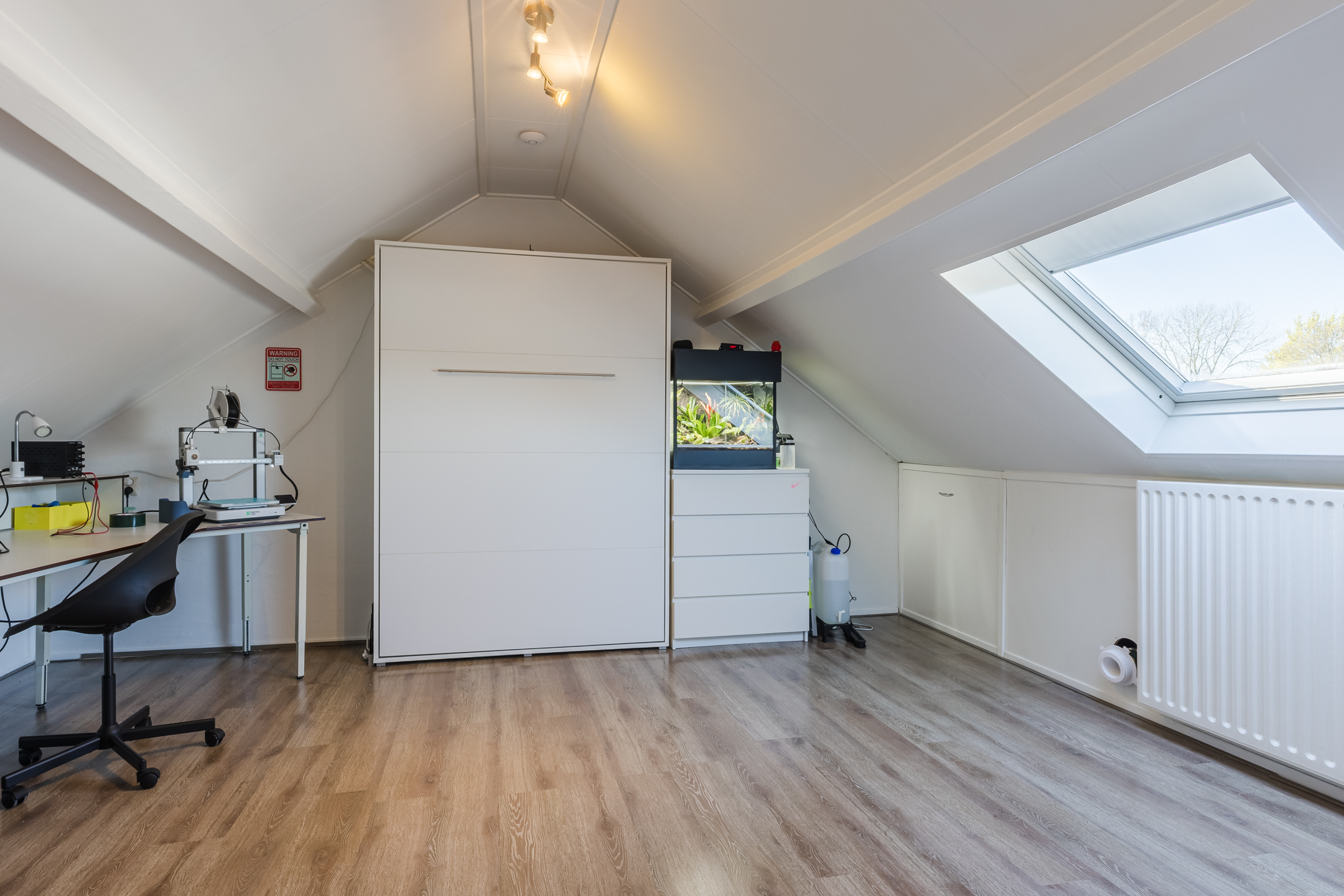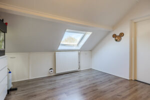 Ruime voorzolder met de opstelling van de HR-combiketel (Vaillant 2018). Zeer ruime 4e slaapkamer met laminaatvloer en een groot dakraam. Aan beide zijden is er veel bergruimte achter schotten beschikbaar.