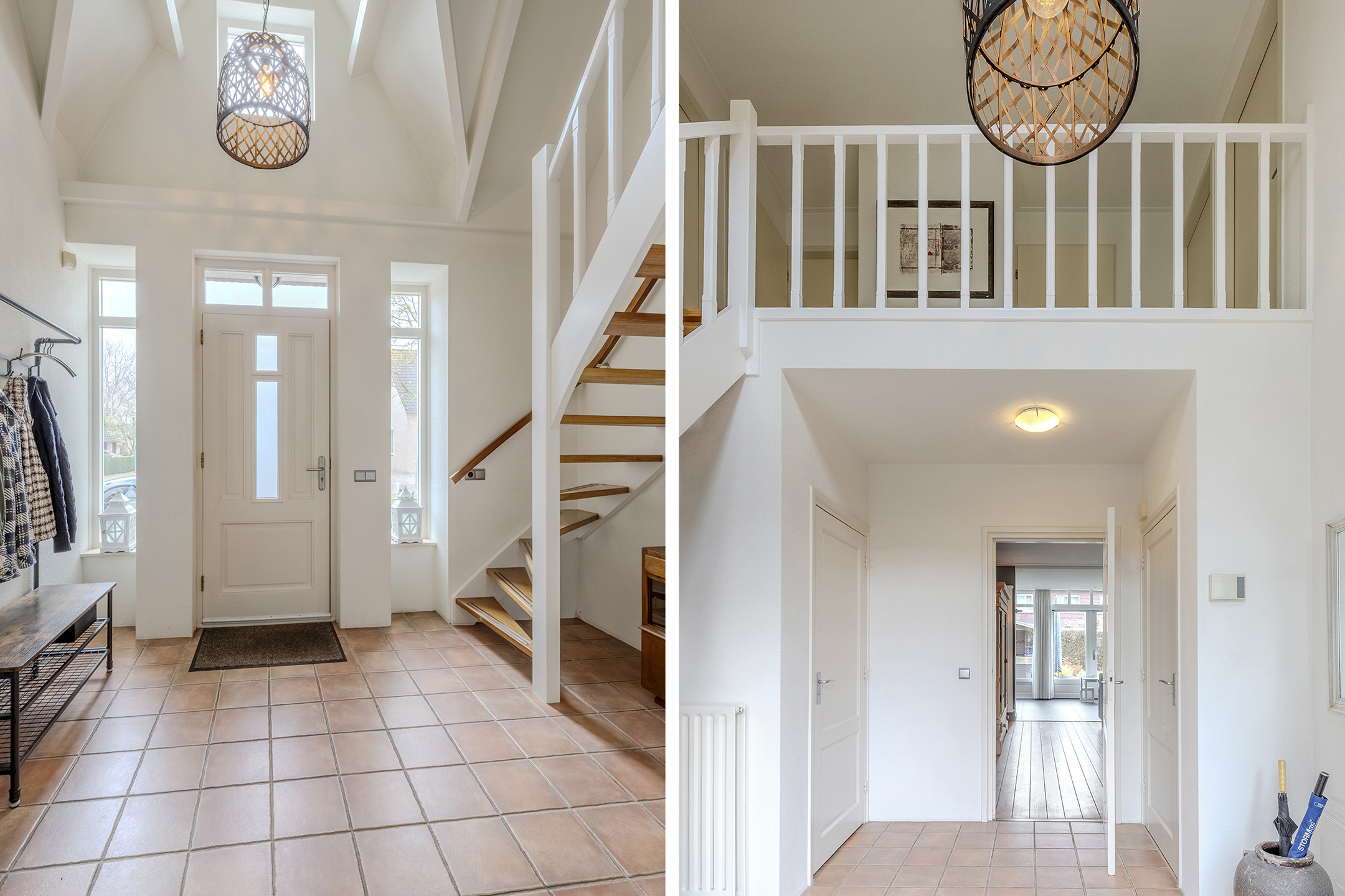 Entree, hal met prachtige vide, tegelvloer, uitgebreide meterkast (met glasvezelaansluiting) en een geheel betegelde toiletruimte voorzien van een vrij hangend toilet met fontein.