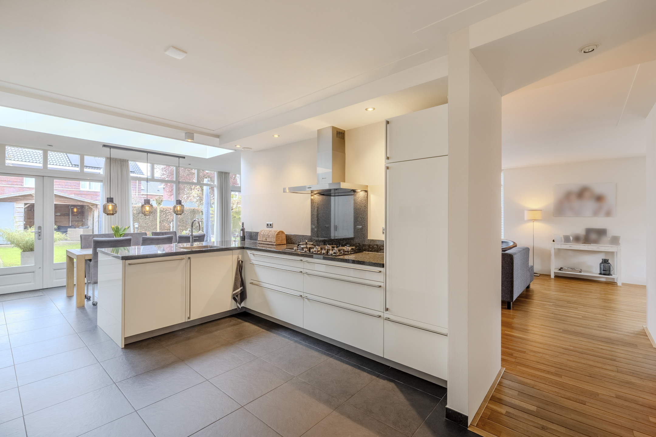 Royale en speels ingedeelde, uitgebouwde woonkamer circa 86m² (inclusief keuken) met eiken vloer die in de uitbouw overloopt in een fraaie tegelvloer met vloerverwarming, strak stucwerk wand- en plafondafwerking, twee dubbele openslaande tuindeuren en een design gashaard. De lichtstraat in de uitbouw en de vele raampartijen zorgen voor extra veel lichtinval.