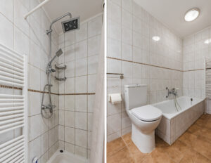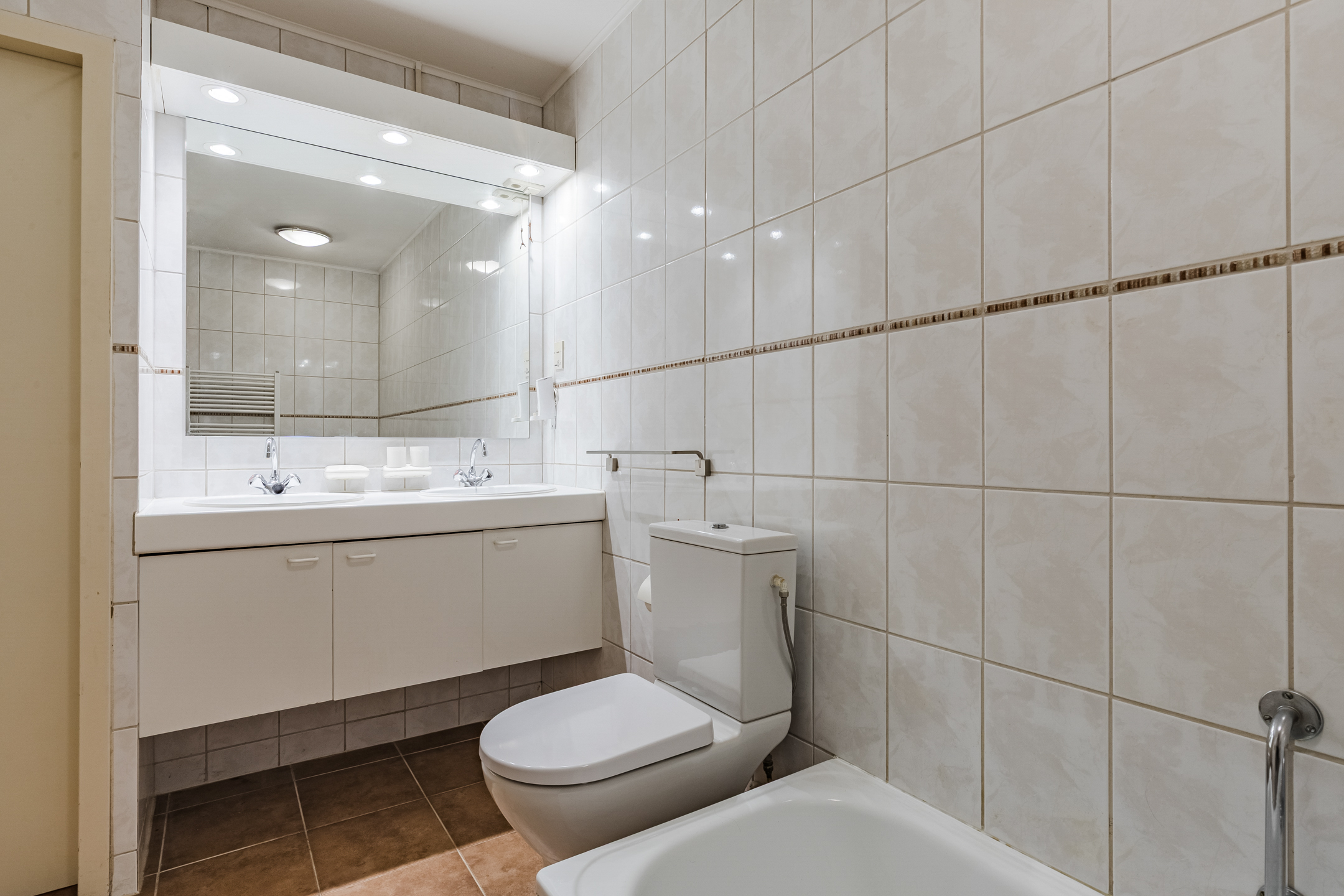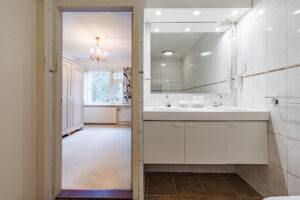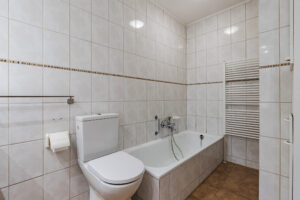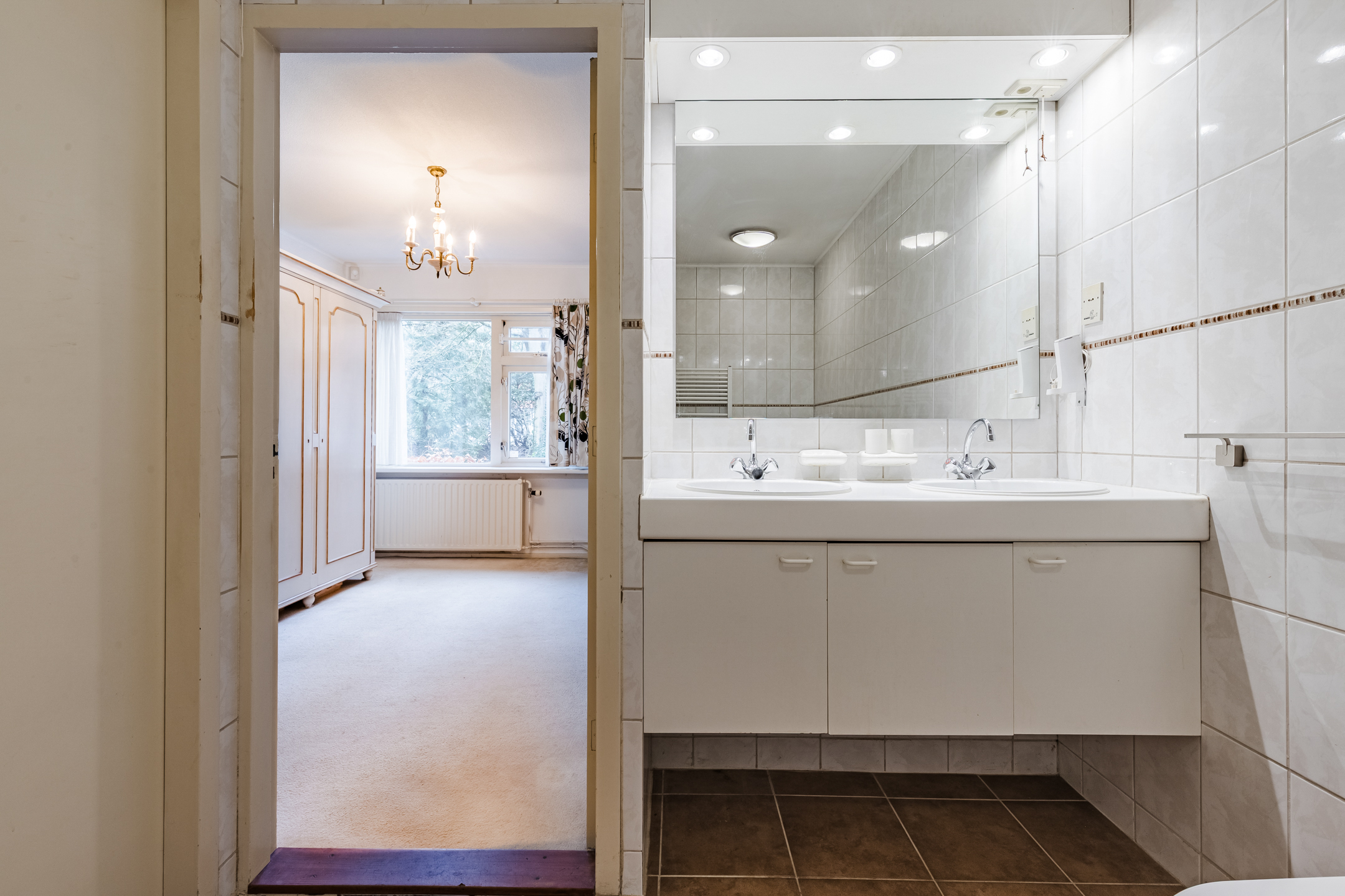 Vanuit de eerder genoemde hal toegang tot een royale slaapkamer ca. 18 m² met toegang tot een geheel betegelde badkamer ca. 7 m² voorzien van ligbad, separate douche, toilet en een dubbele wastafel in meubel.