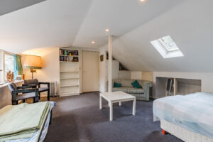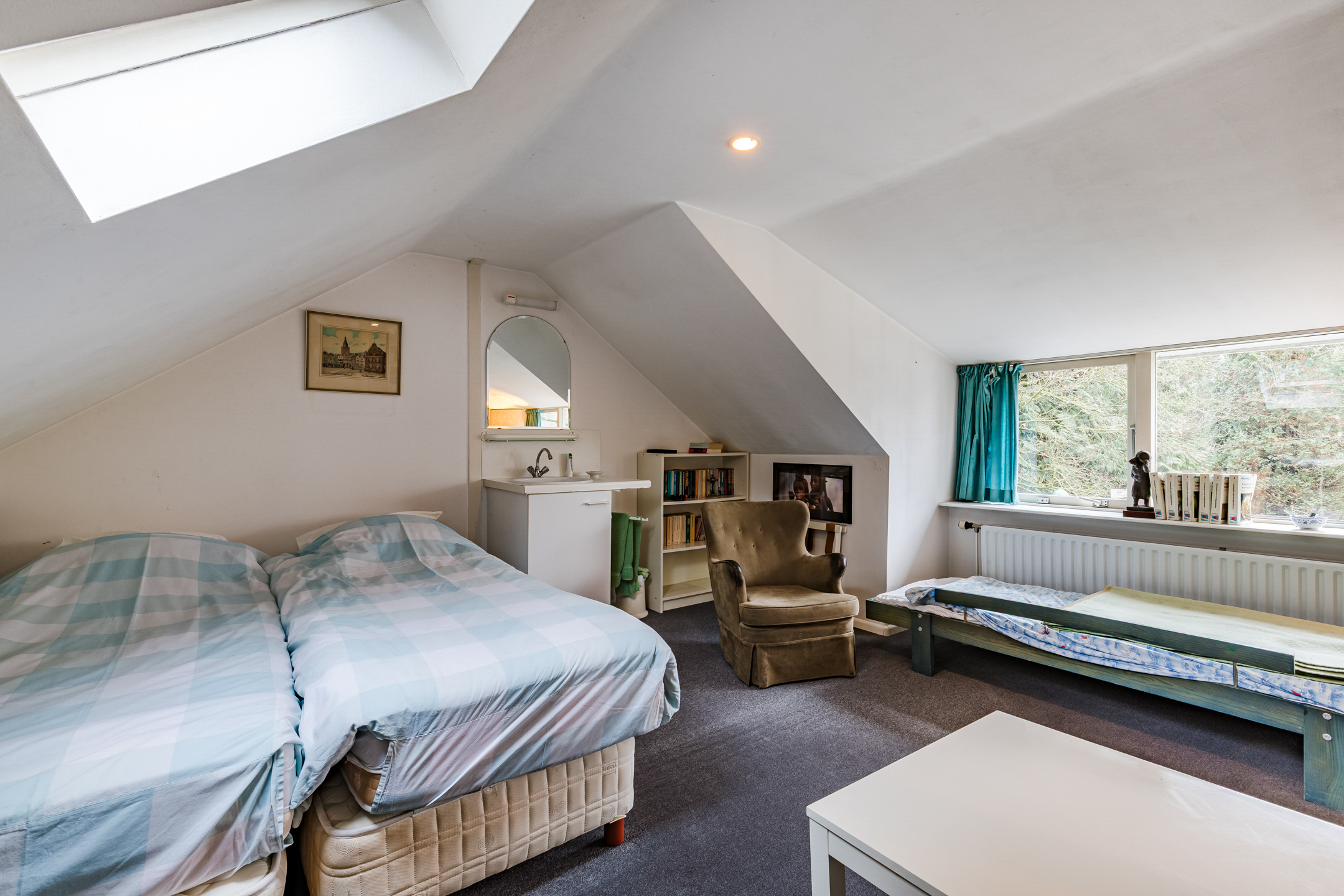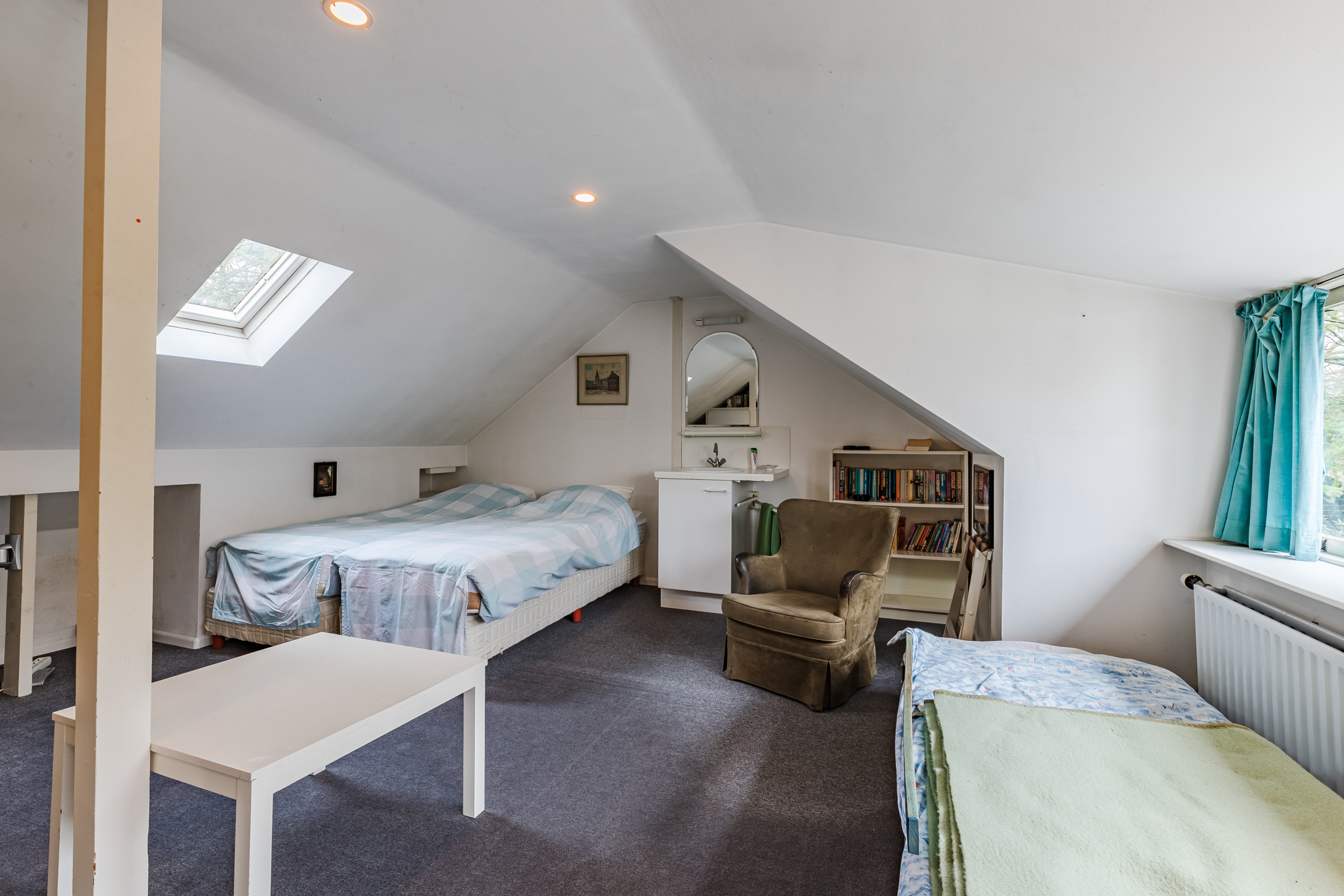 Overloop met bergruimte en dakraam; slaapkamer ca. 20 m² met dakkapel, dakraam, wastafel, vaste kasten en bergruimte; multi-functionele zolderruimte ca. 14 m² met dakraam en bergruimte. Hier kan men eventueel een extra slaapkamer realiseren.