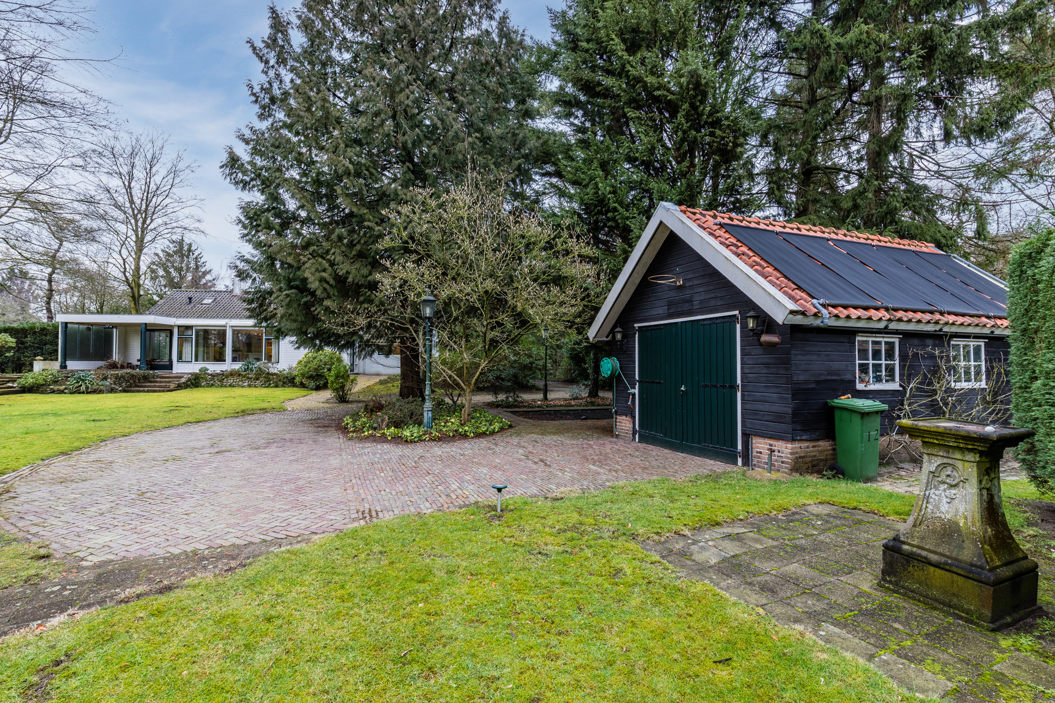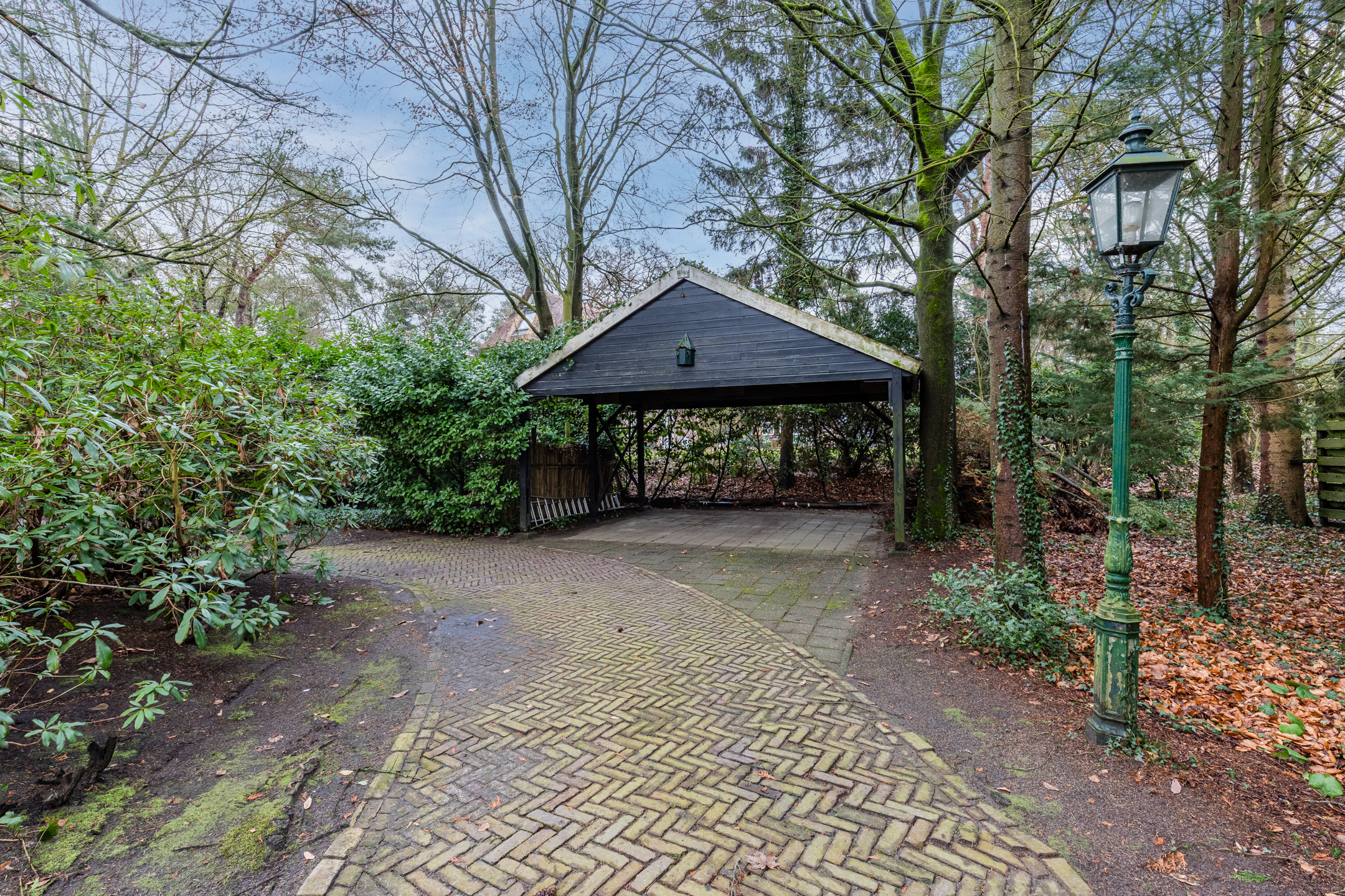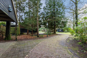 Royale oprit naast de woning met ruimte voor meerdere auto's en toegang tot een dubbele carport.
