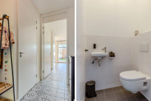 Entree, hal met in Portugese stijl uitgevoerde tegelvloer, meterkast en een moderne toiletruimte voorzien van een vrij hangend toilet met fontein.