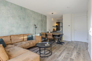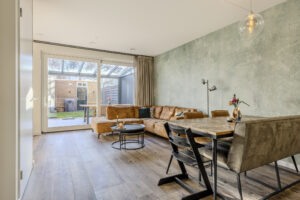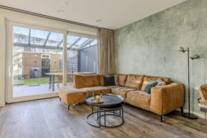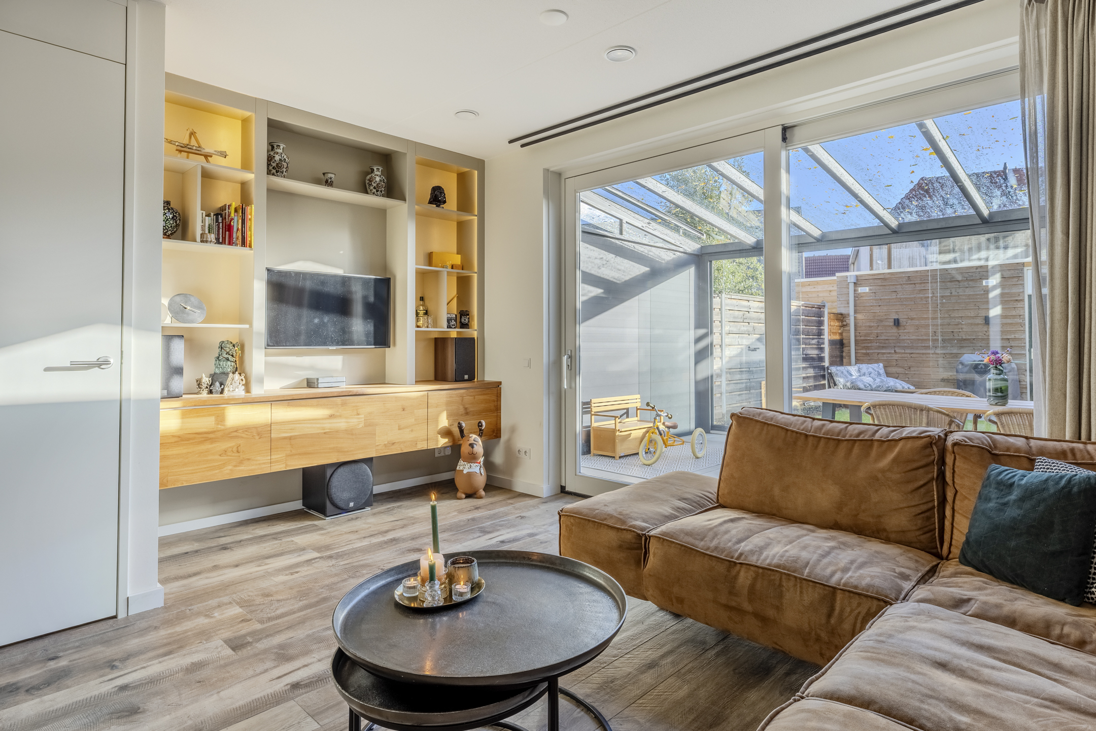 Sfeervolle en over de volle breedte uitgebouwde woonkamer circa 30m² (inclusief keuken) voorzien van een moderne tegelvloer, een praktische trapkast en een schuifpui naar de overkapping en achtertuin.