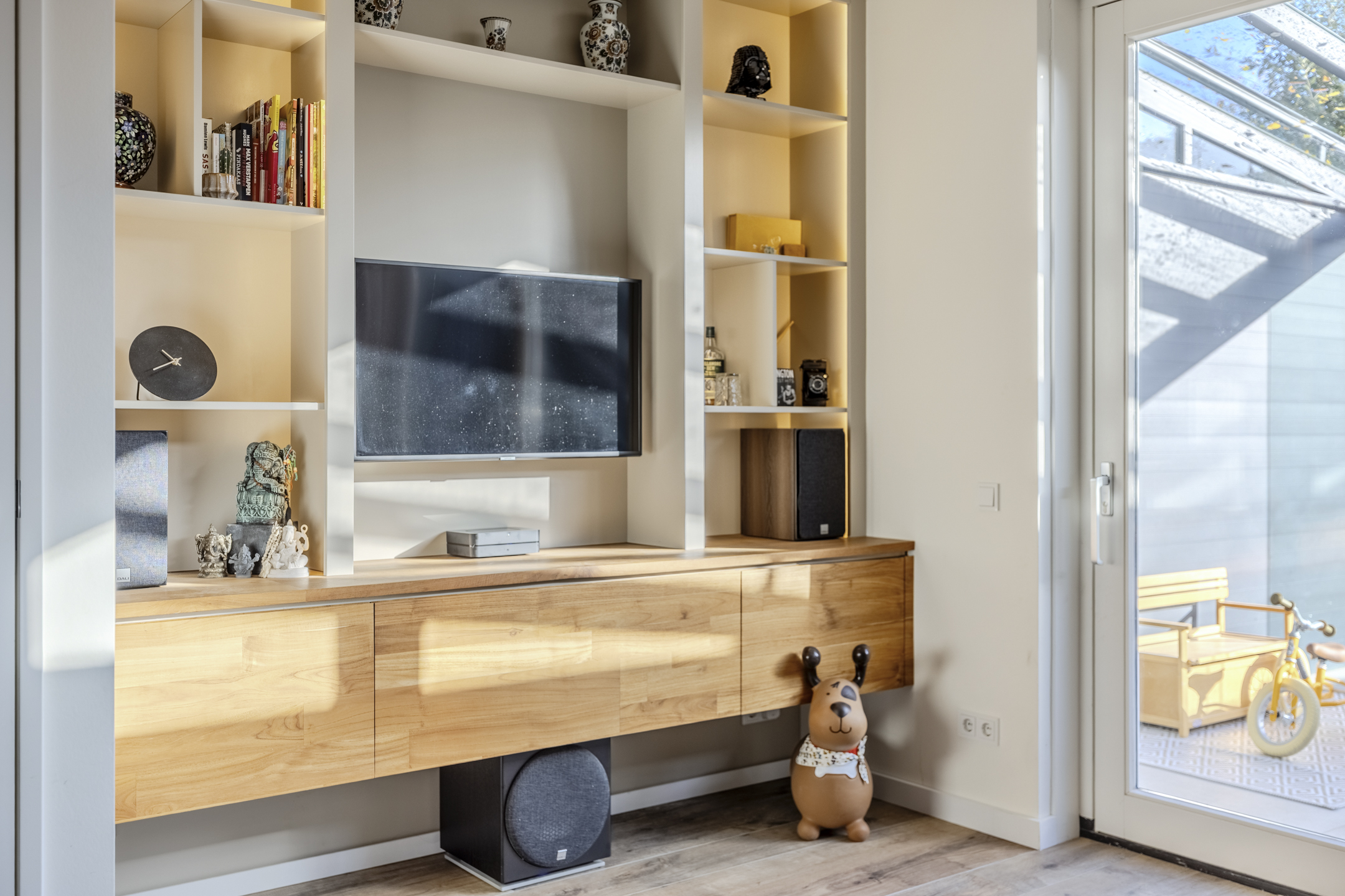 In de woonkamer is een prachtig, op maat gemaakt televisie meubel aanwezig.