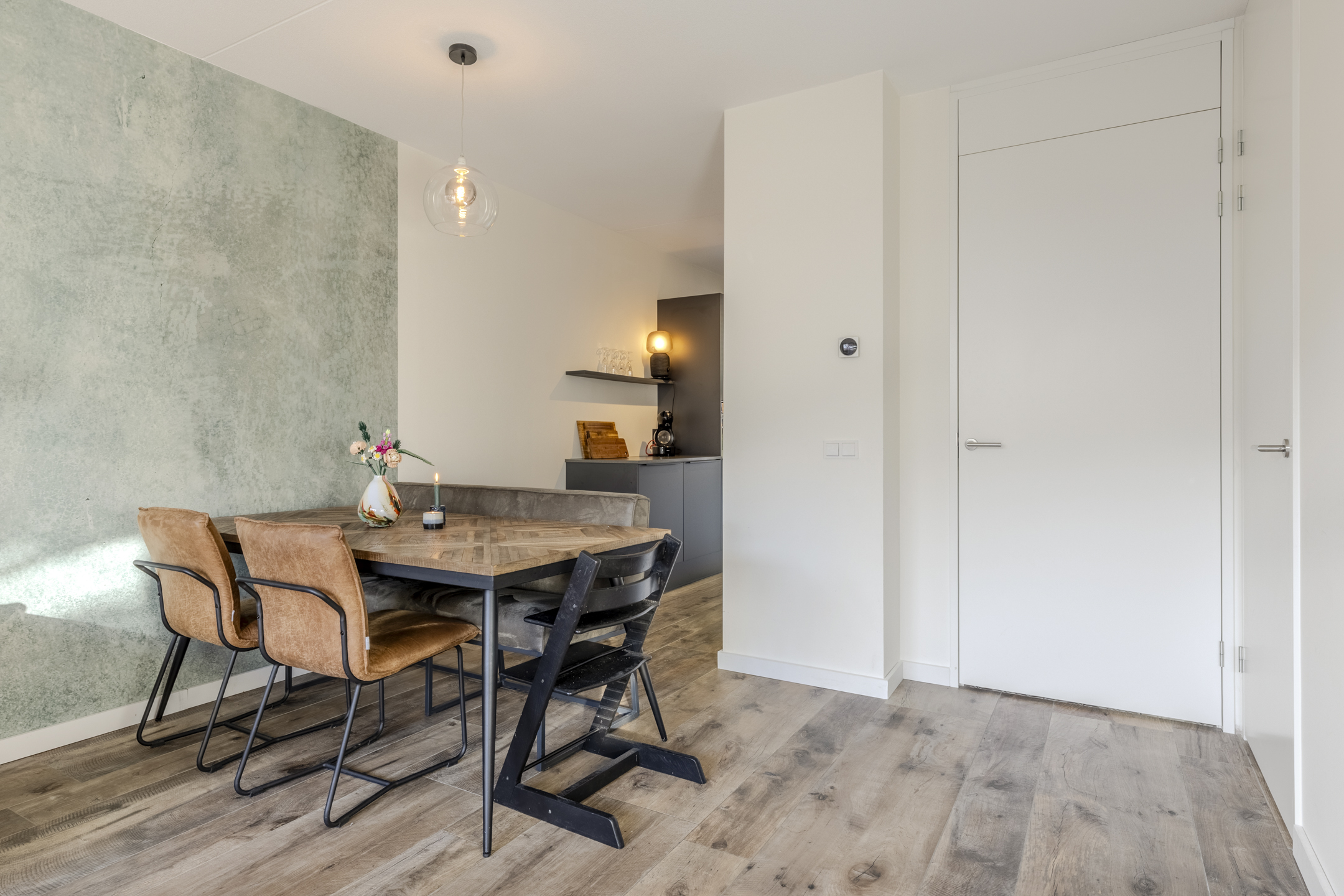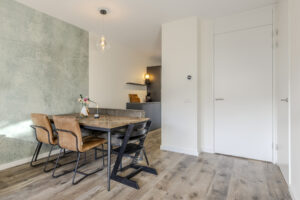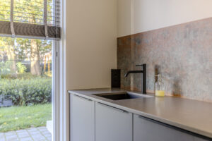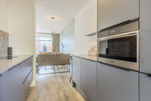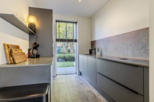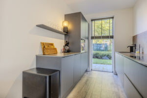 De keukeninrichting is voorzien van een natuurstenen blad, inductie kookplaat met geïntegreerde afzuiging (BORA), koel-/ vriescombinatie, combi oven met stoomfunctie en een vaatwasser. Het raam wat tot de vloer doorloopt biedt een fraai uitzicht over groen en zorgt voor extra lichtinval.