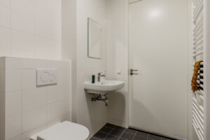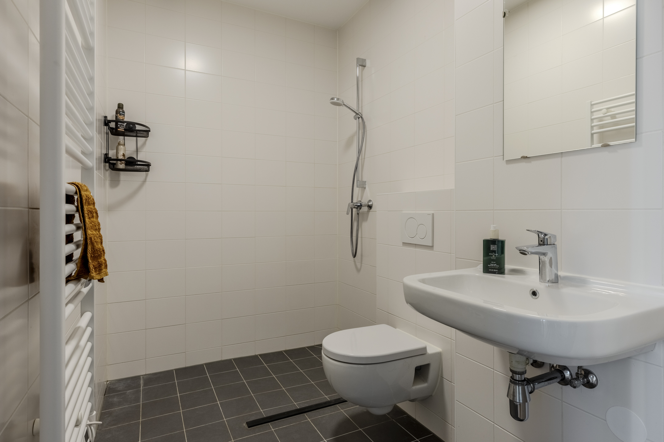 Licht betegelde badkamer voorzien van een vaste wastafel, inloopdouche, vrij hangend toilet en een design radiator.