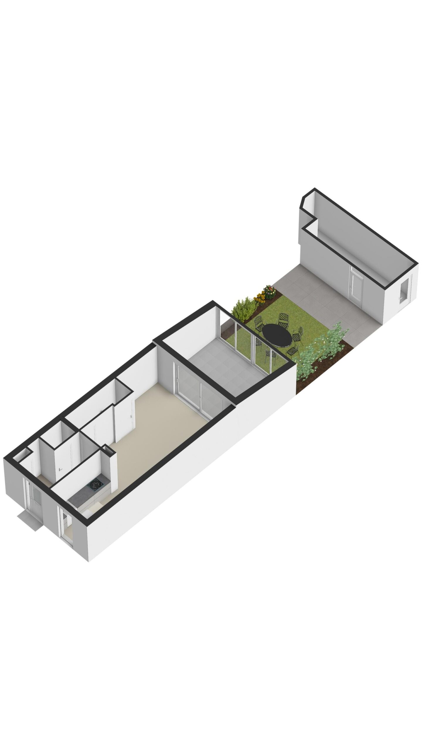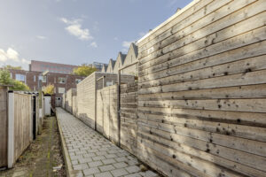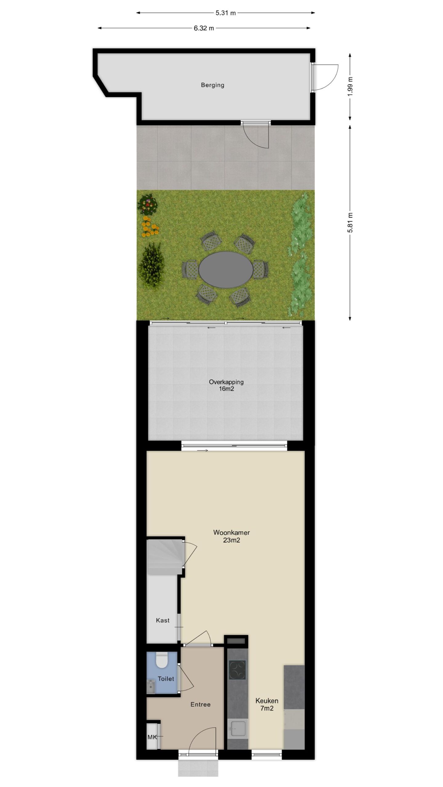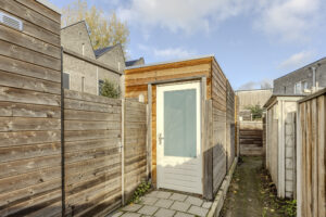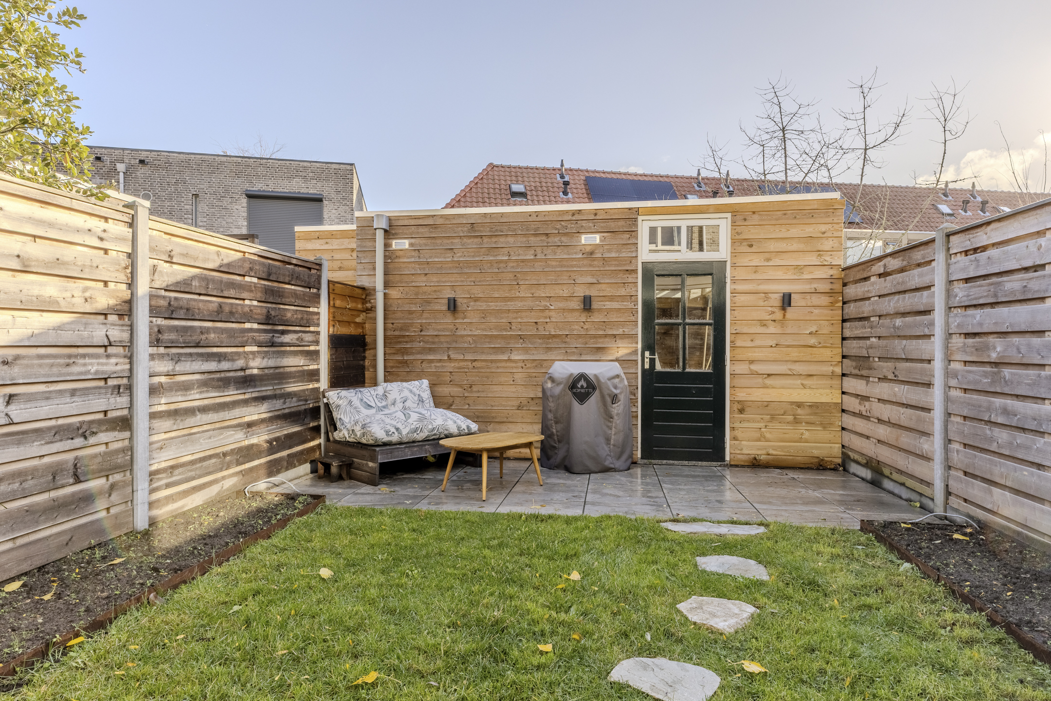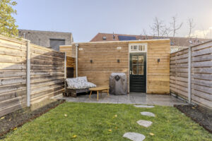 De tuin is verder voorzien van een terras, graspartij, een vergrote houten berging en een achterom.