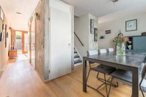 Entree, speels ingedeelde woonkamer circa 40m² (inclusief keuken) die verdeeld is in een eetgedeelte aan de voorzijde, tuingericht zitgedeelte, de keuken en een doorloop.