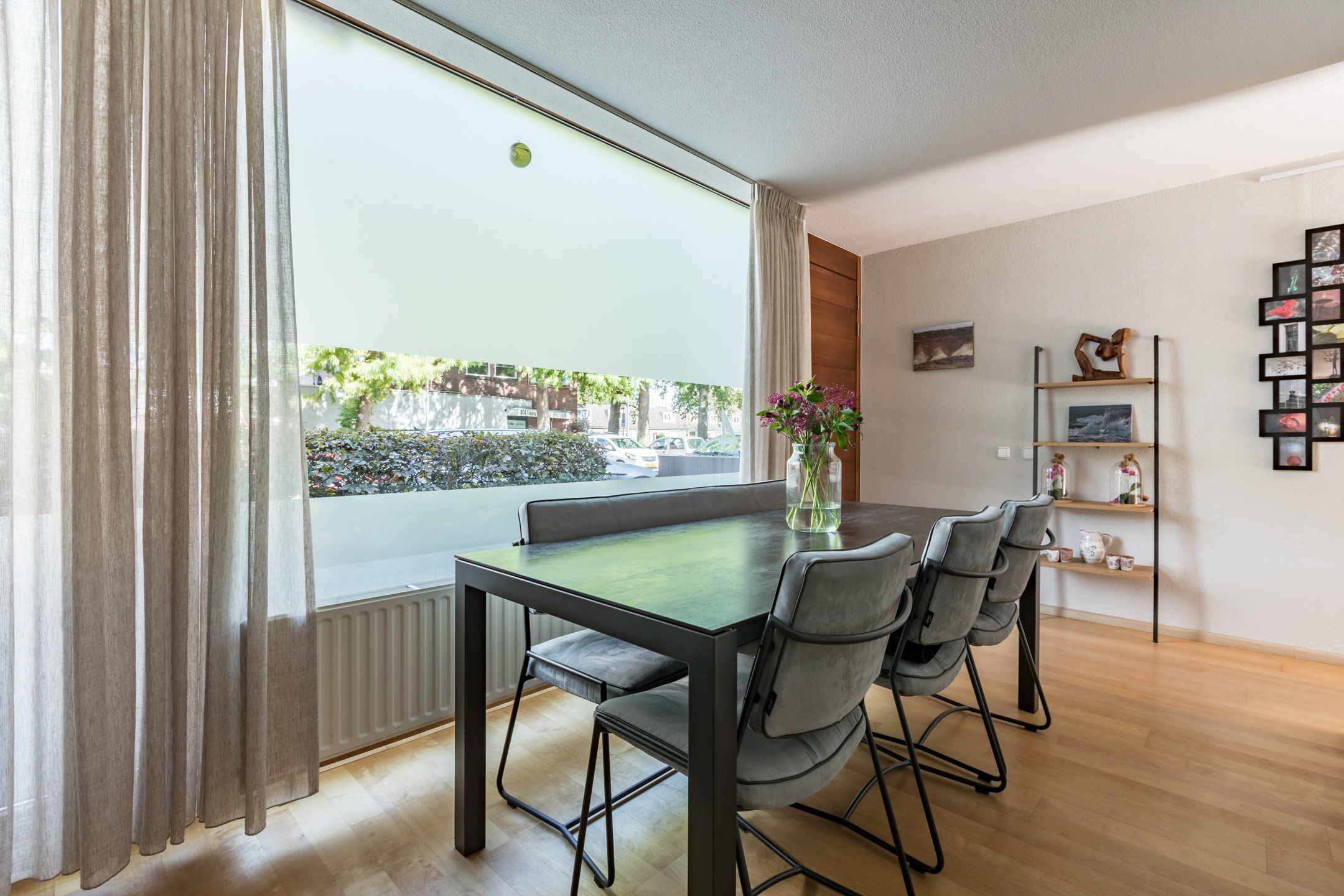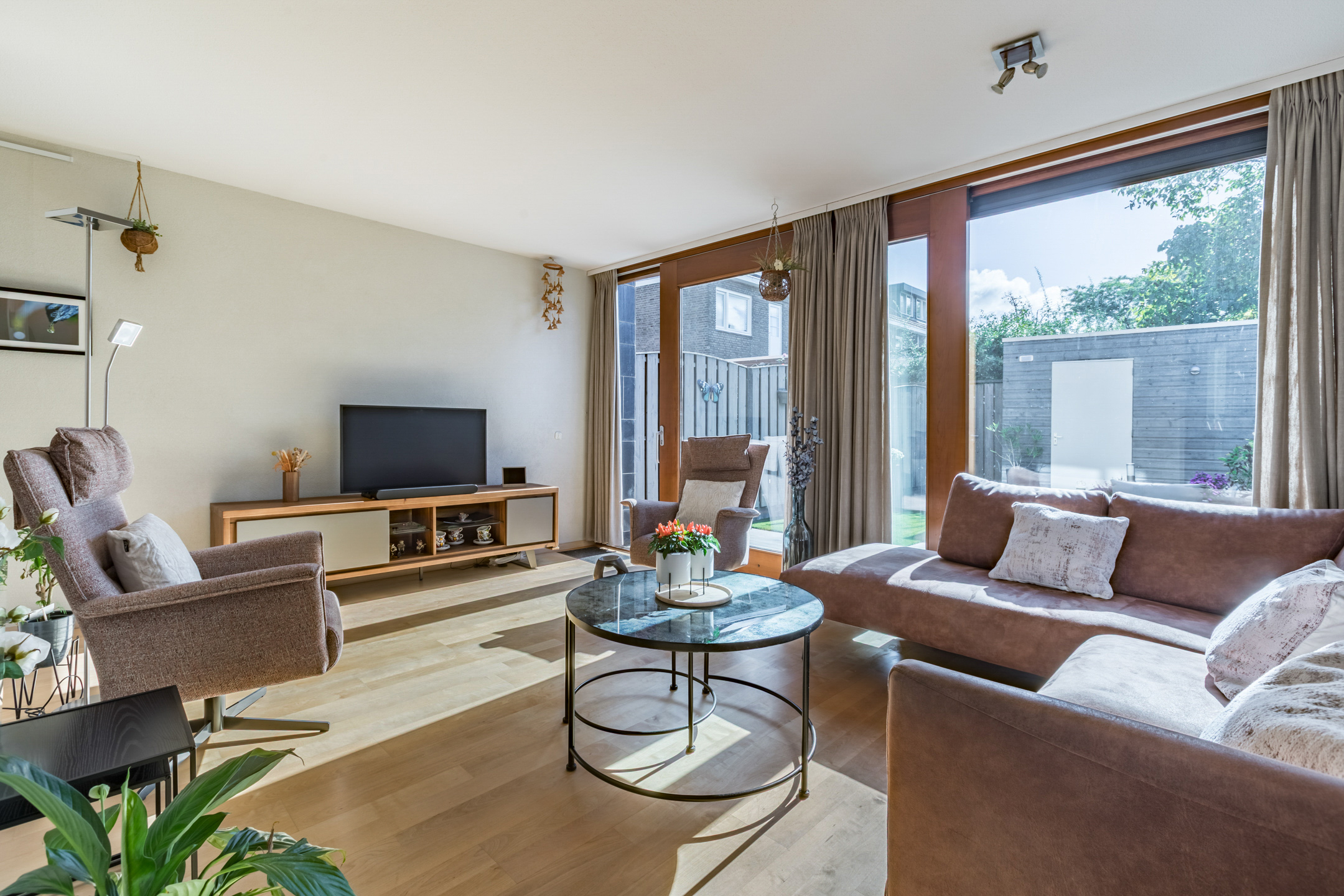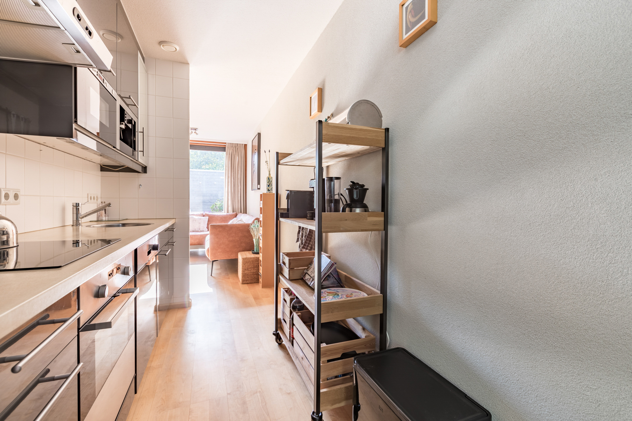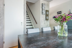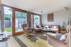 De woonkamer is voorzien van een parketvloer, spachtelputz en betonstuc wandafwerking. Een schuifpui geeft toegang tot de achtertuin. De grote raampartijen zorgen voor veel lichtinval met aan de voorzijde een fraai zicht op het straatbeeld en aan de achterzijde op de tuin.